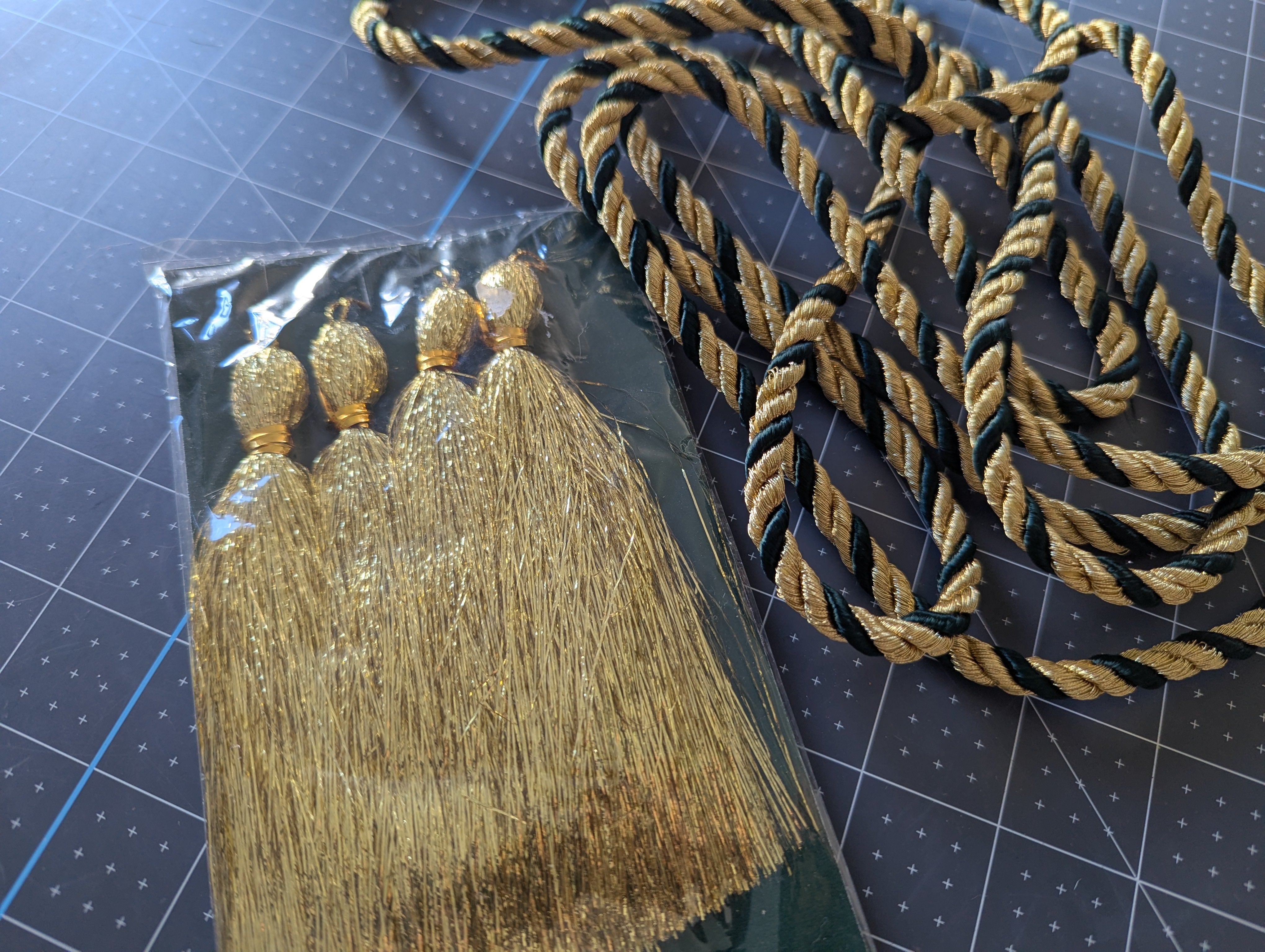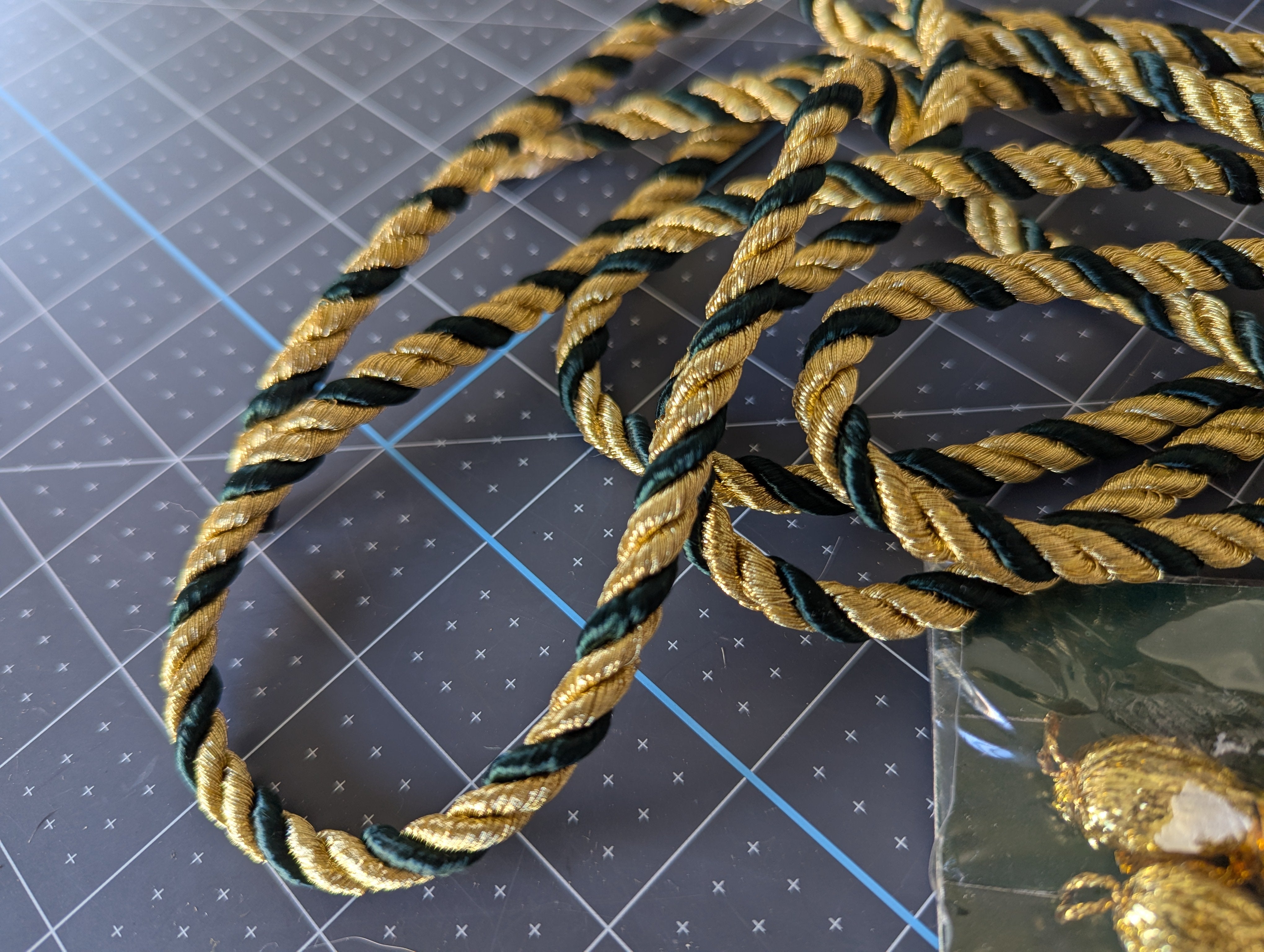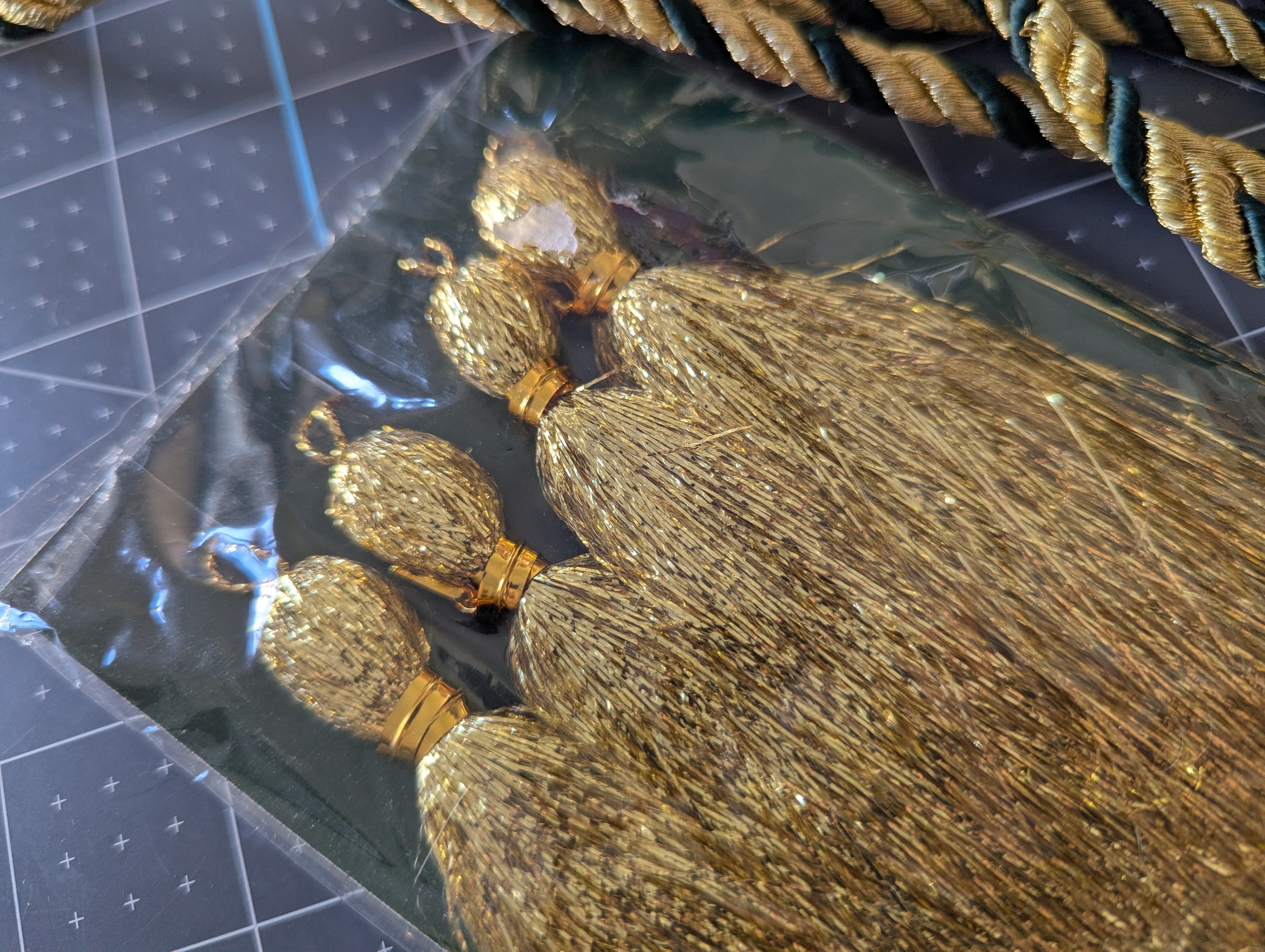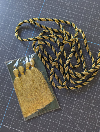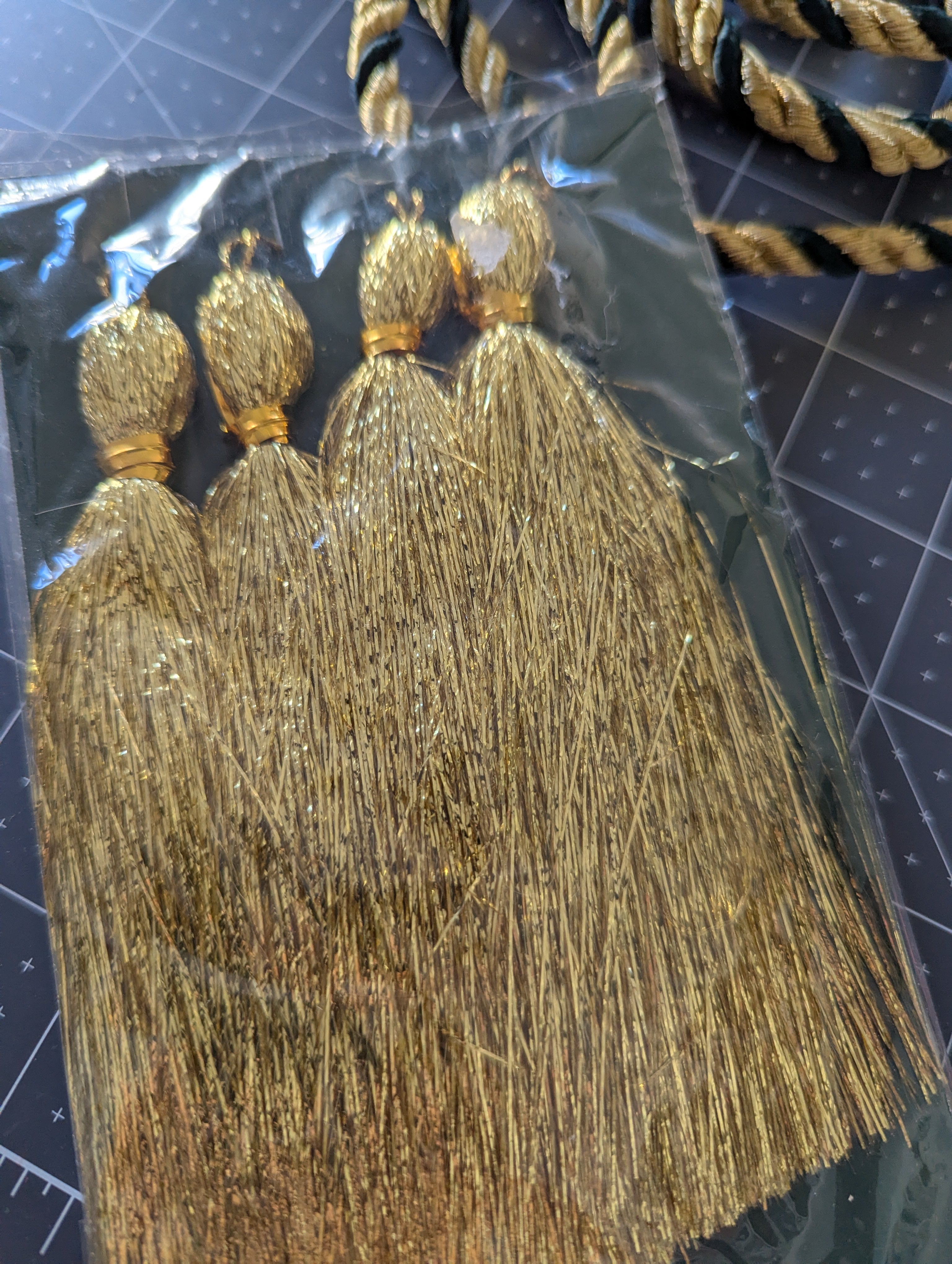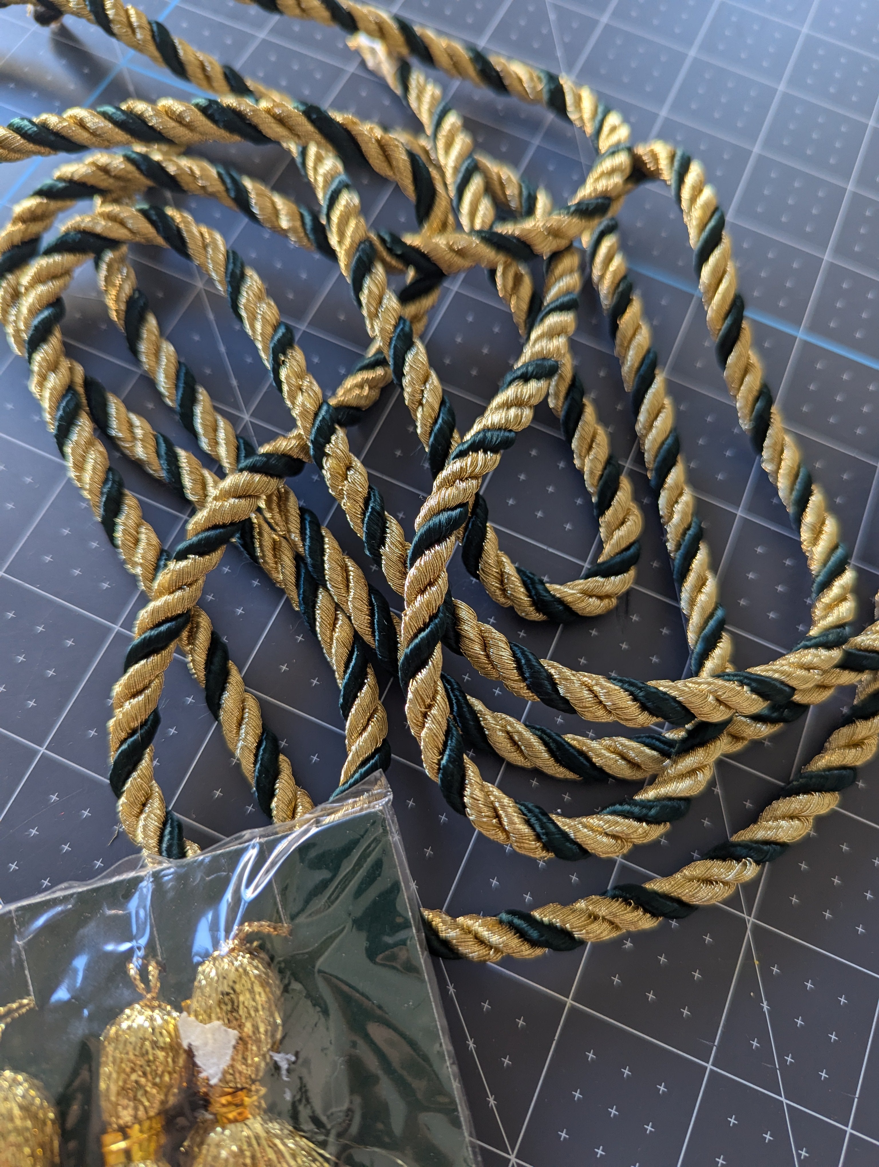 Tassel set appears to be made from a classic tinsel though we haven't opened them. Rope could be use for bag ties, a hanging cord, etc. There are 2.5-yards of rope.