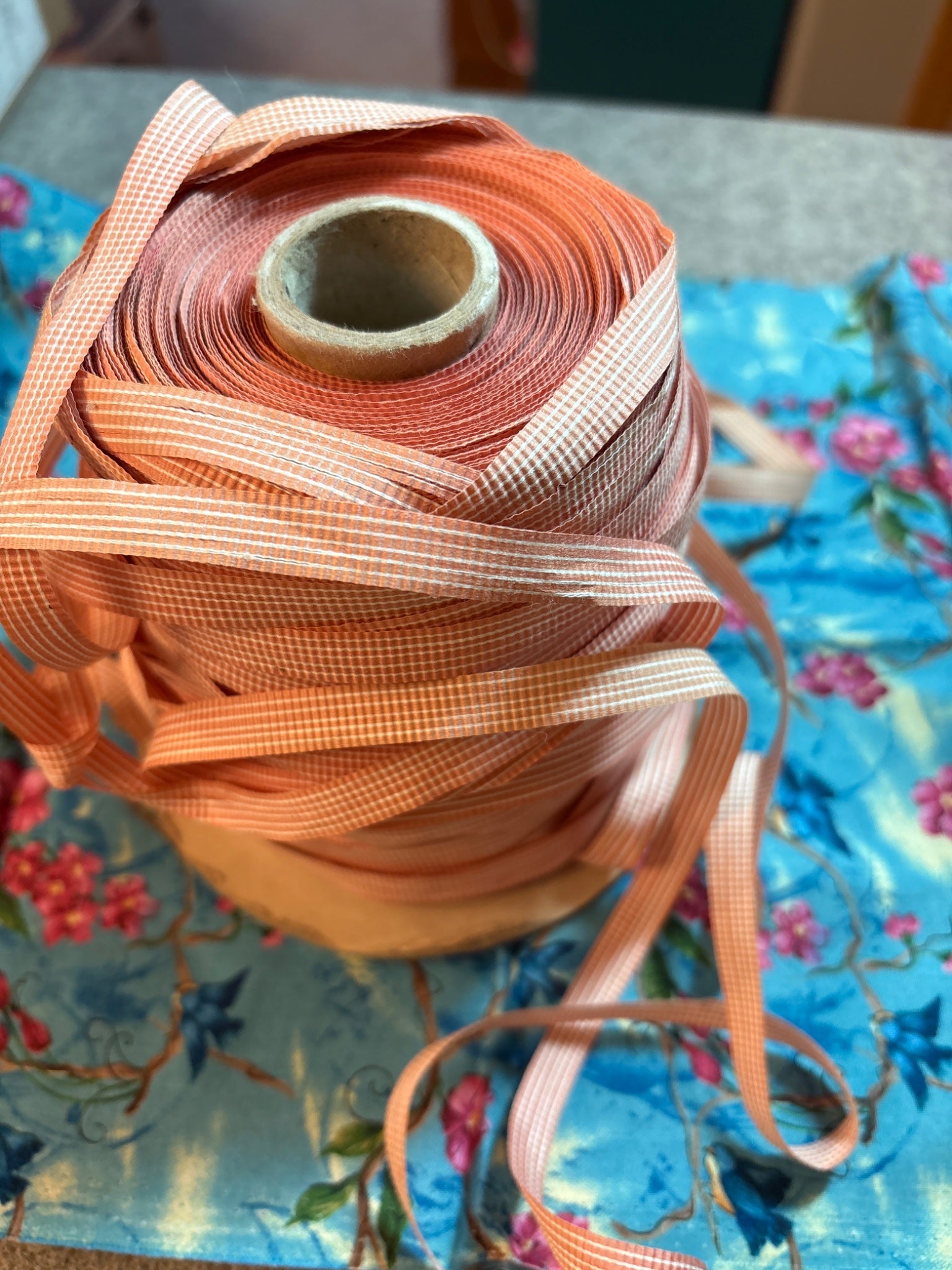 Large roll 12 oz pinkish curling ribbon it does split, great fo crafts art projects, curls fine. No odors is 3/8" wide, paper