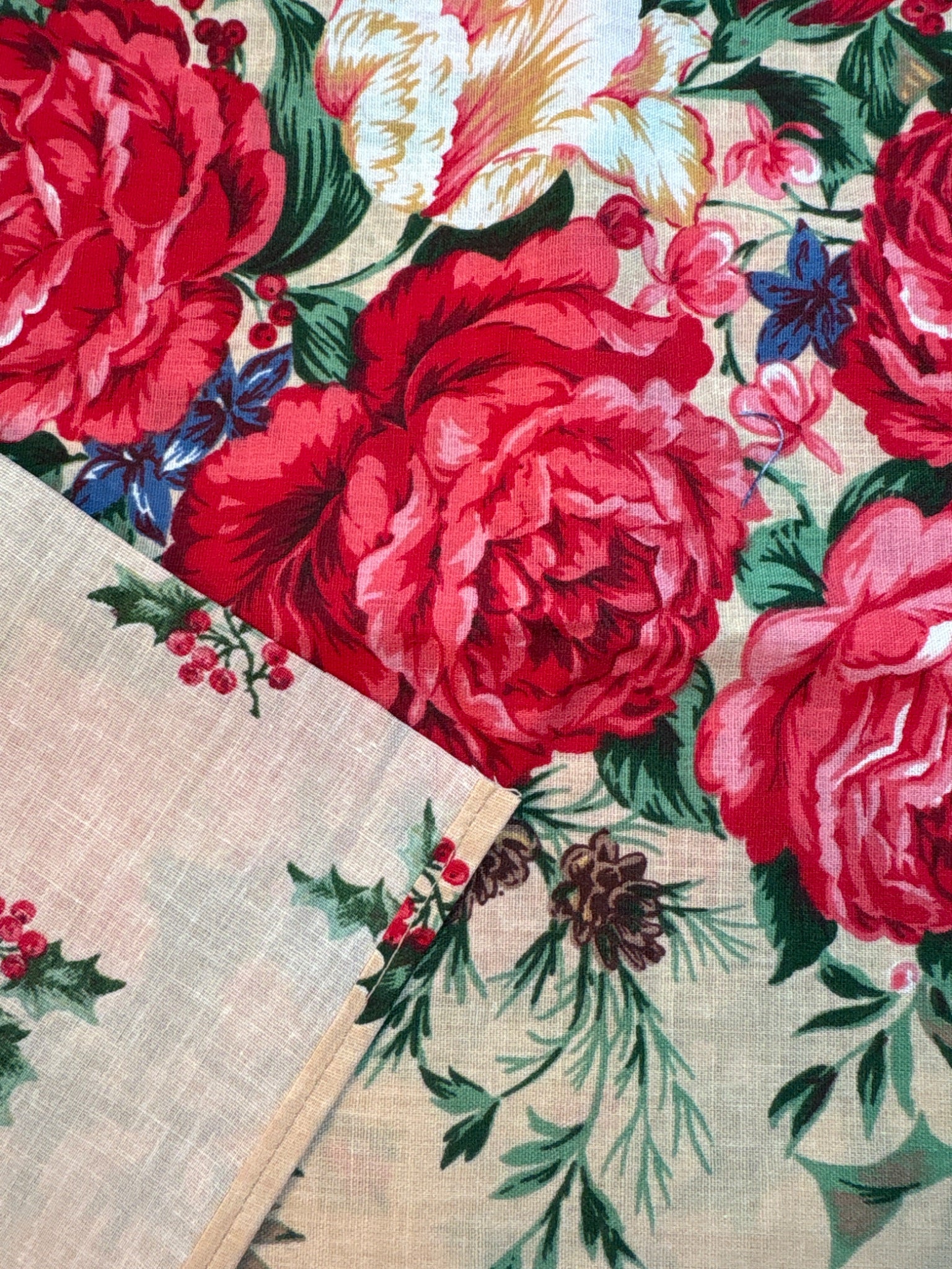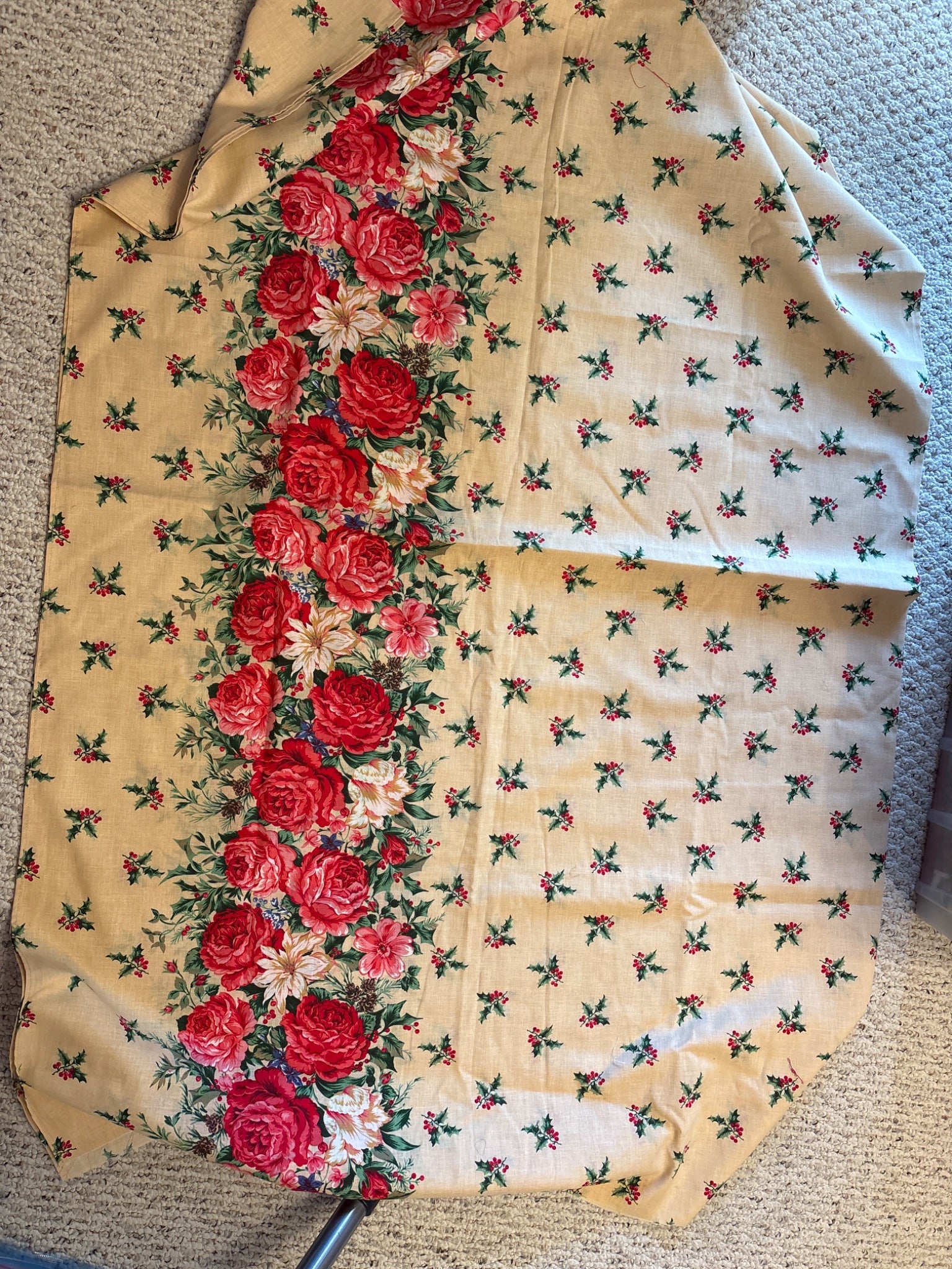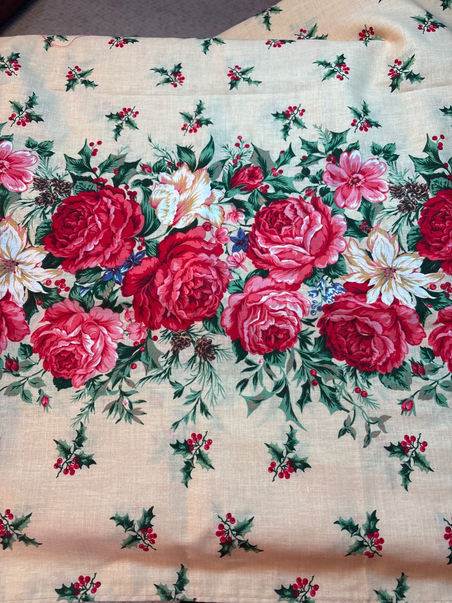 2 pieces lightweight vintage Christmas fabric double border print. Hemmed on selvages. 1 piece is 54" x 70" wide and the other is 18" x 70" w. New condition no odors