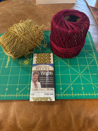 Gold and cranberry sewing thread