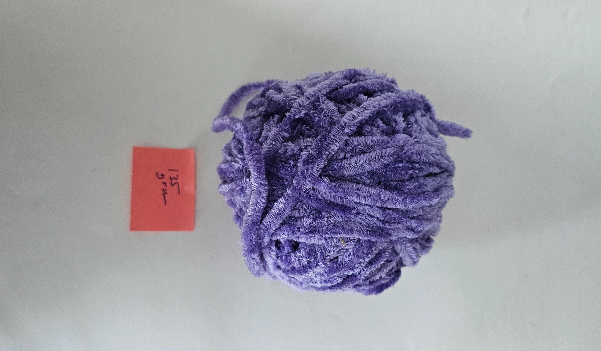 Novelty Yarn Chenille Thick & Quick Lion Brand Light Purple 130 grams. This is aalmost a full skeins worth of the chenille yarn in ball form. It is short about 20 grams. Does not have a label, but there is a label from a different skein in the pics so you can see the specs.