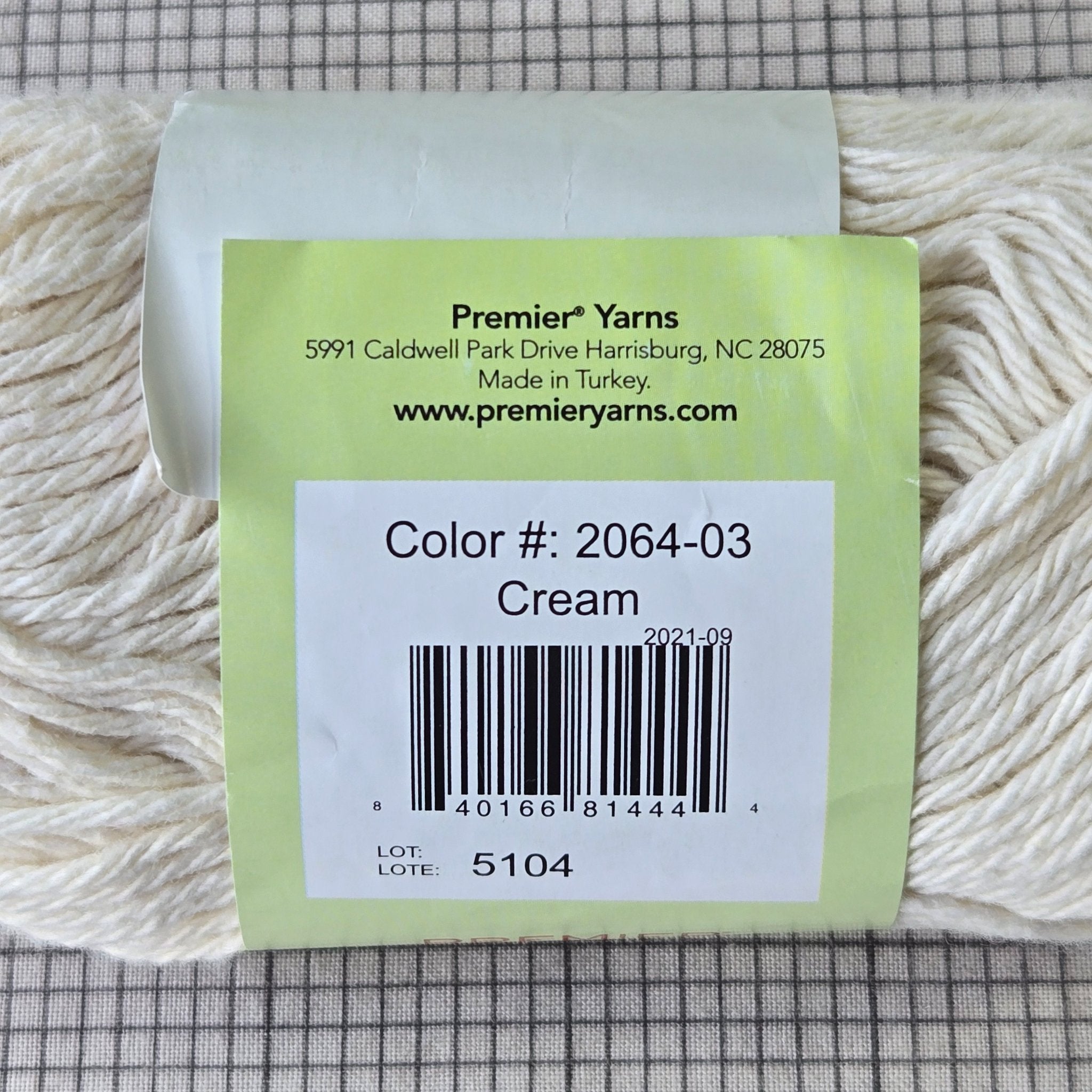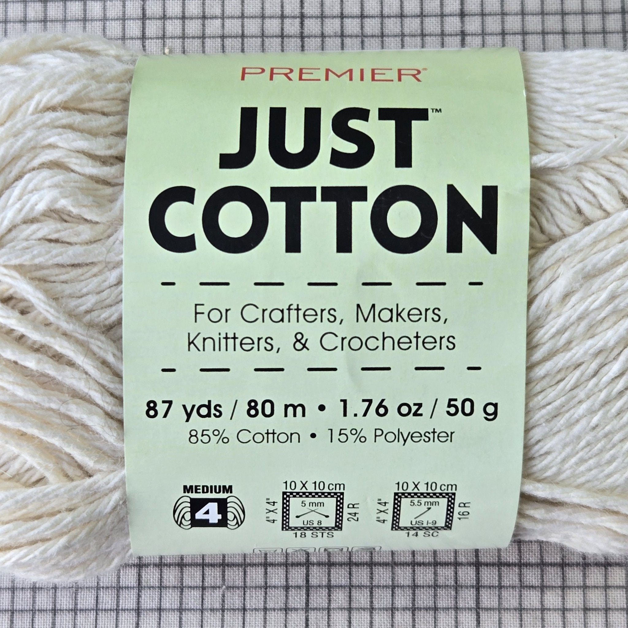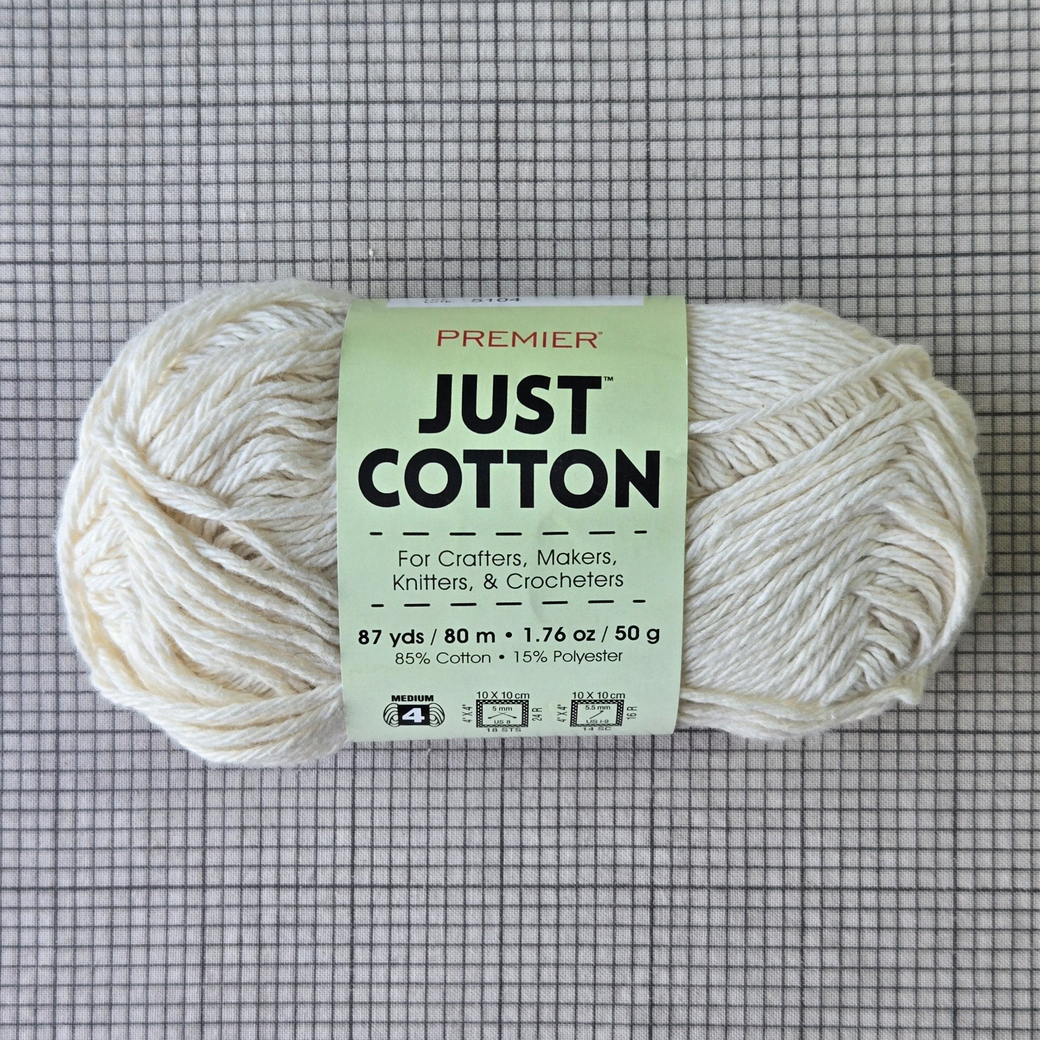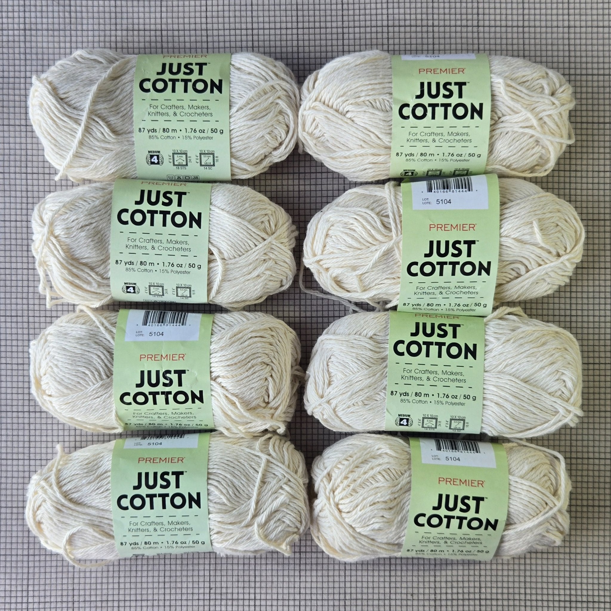 Lot of 8 skeins Premier "Just Cotton" 85% cotton 15% polyester yarn in cream (color # 2064-03, lot # 5104)