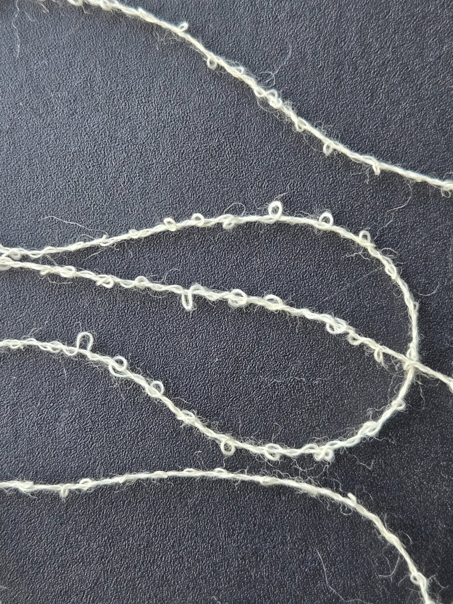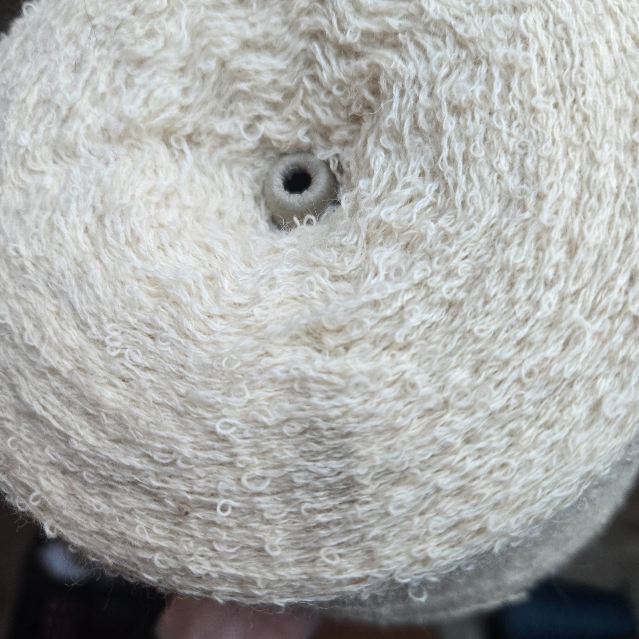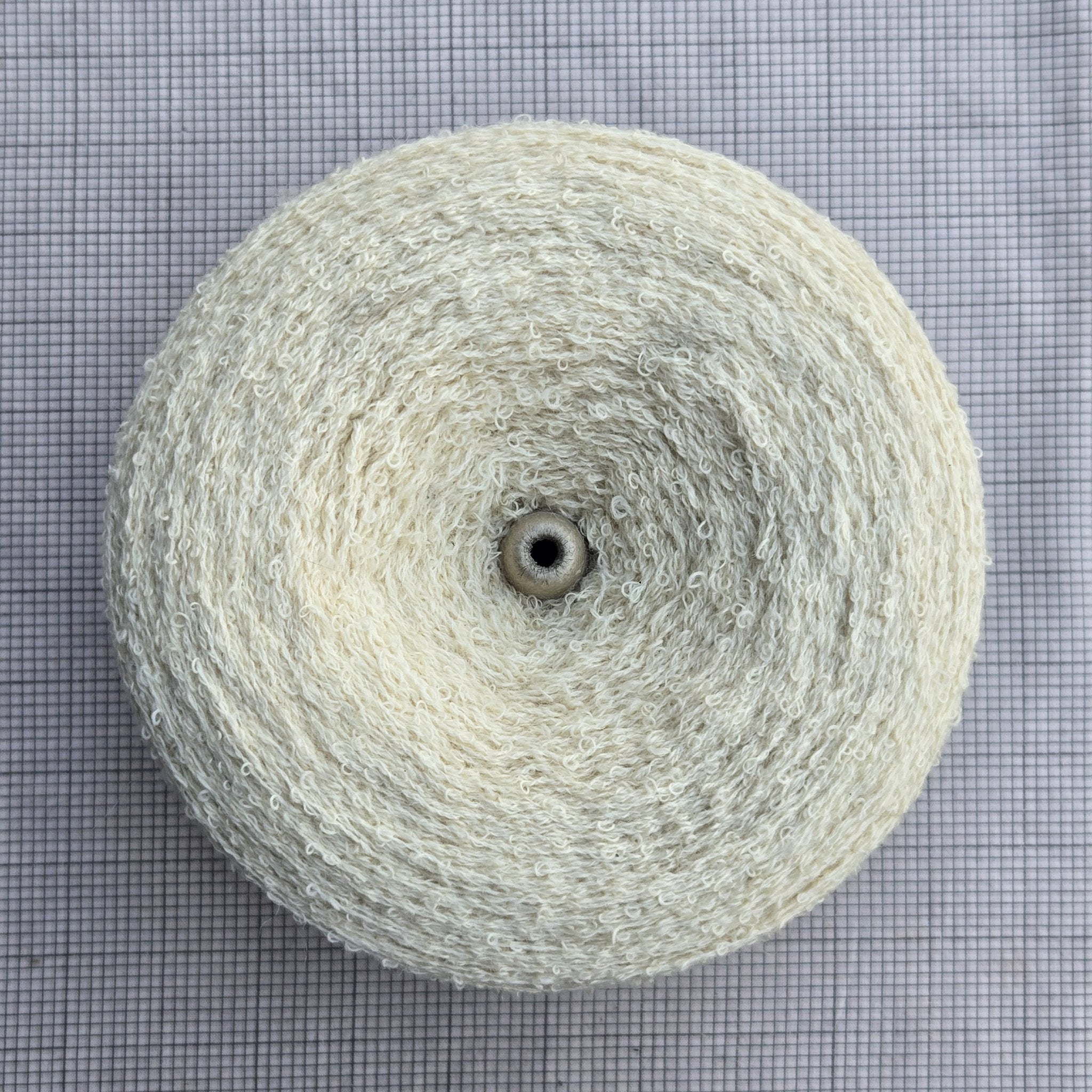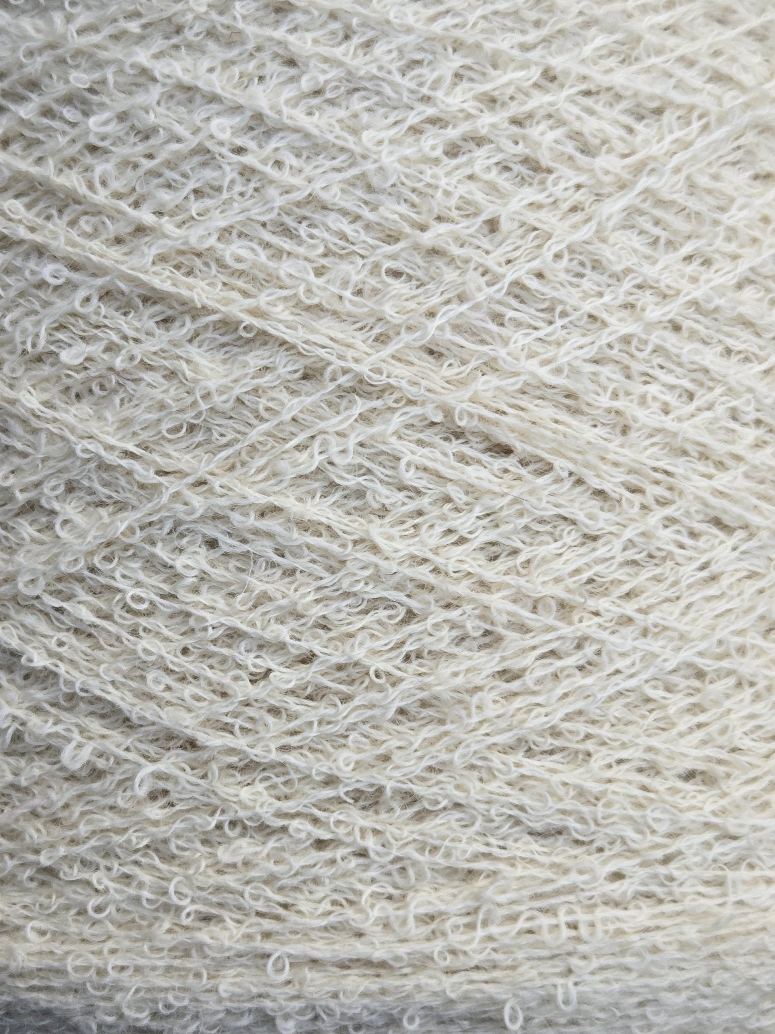 Ecru wool blend boucle yarn, large cone, likely several thousand yards. I was not told the specific blend when I was given these, just that they were a wool blend of some sort. May possibly have some synthetic content but based on feel and burn test seems mostly natural.