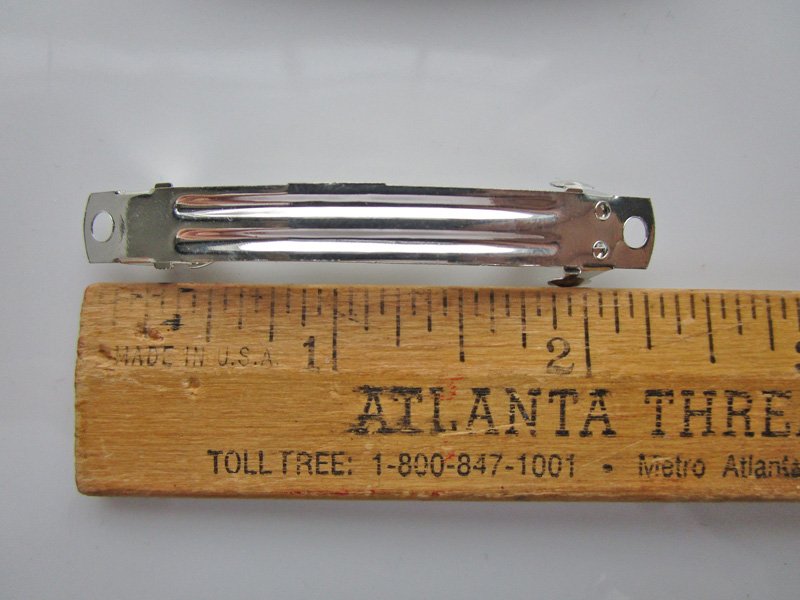 Twenty (20) nickel-plated steel hair barrette blanks that measure approximately 2-5/16" in length and just over 1/4" wide. There are holes at each end and strong locking spring backs. Perfect for embellishing with ribbon, artificial flowers, or beads. Very good condition, never used.
