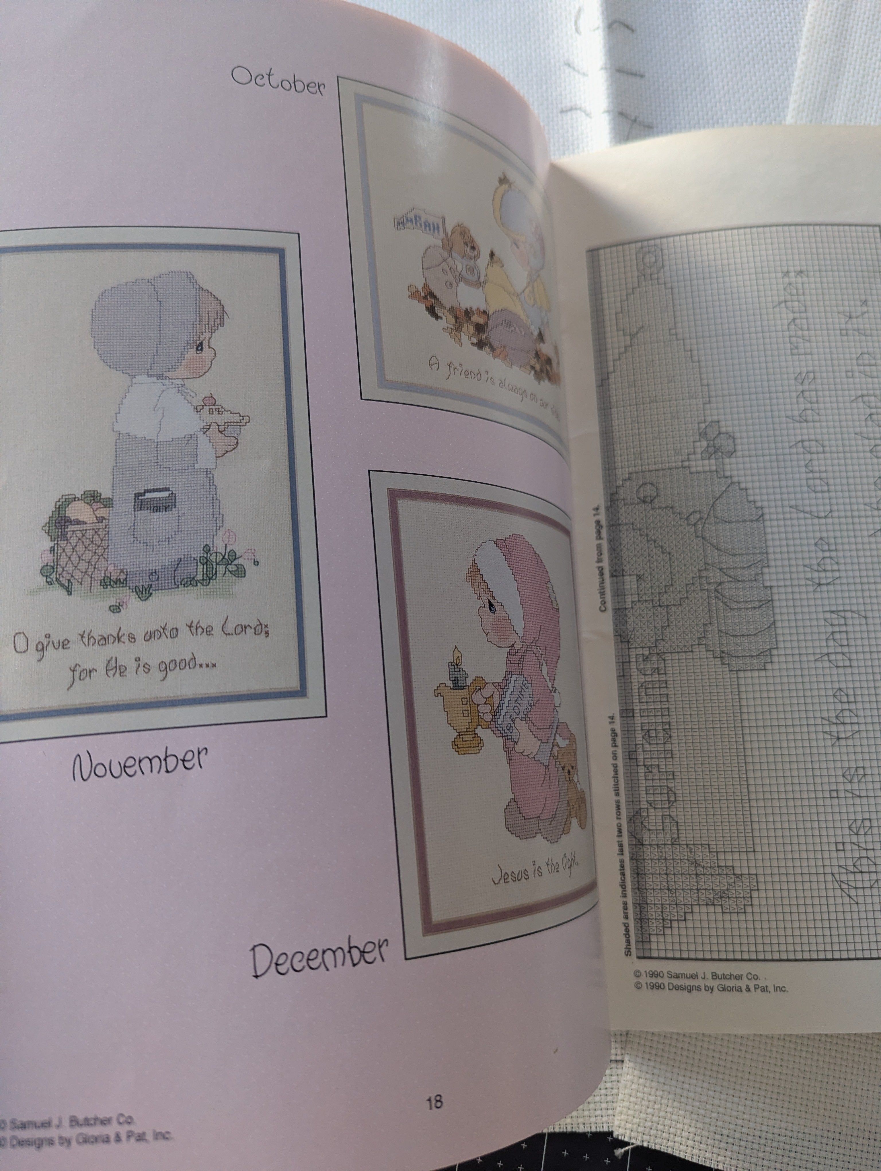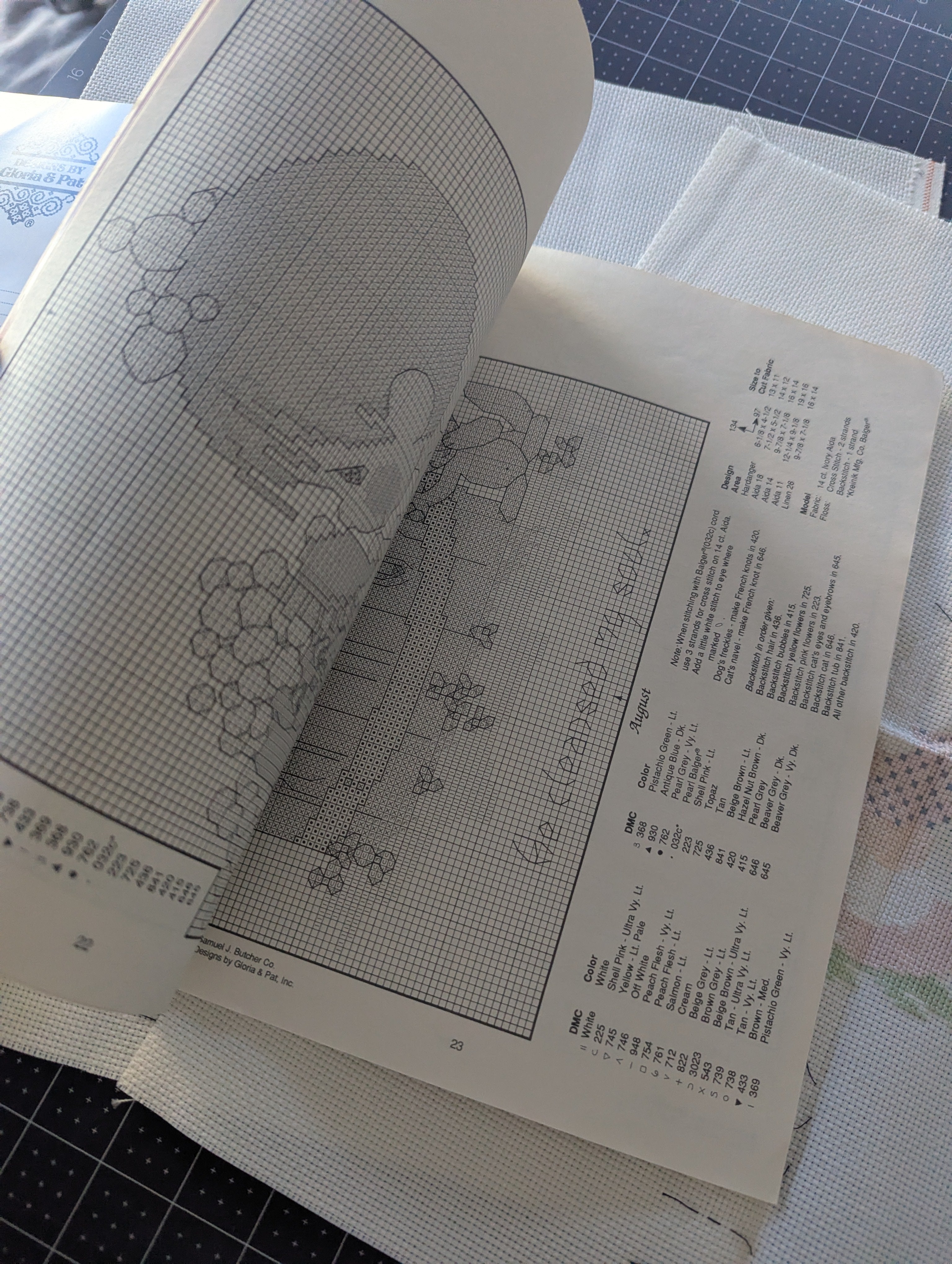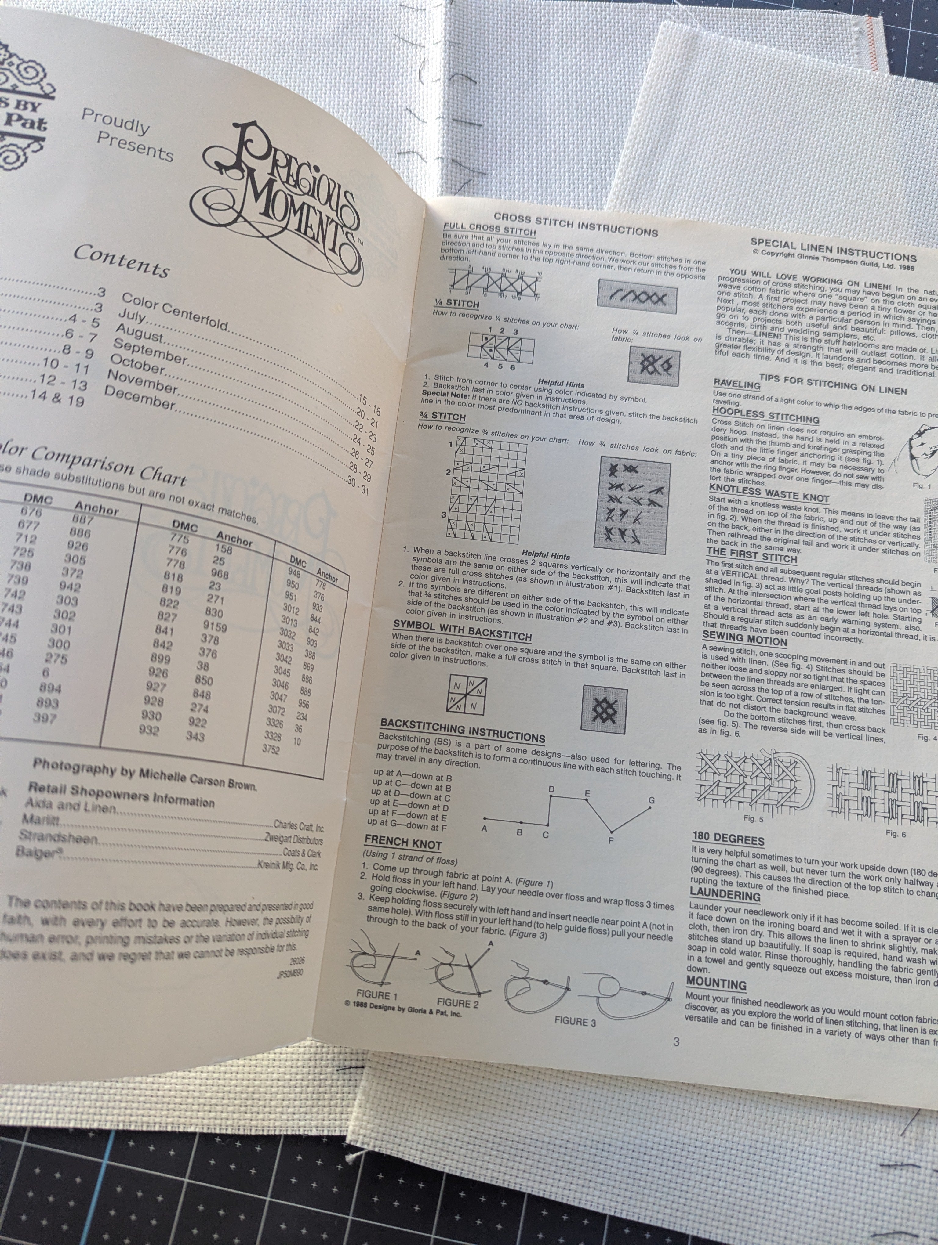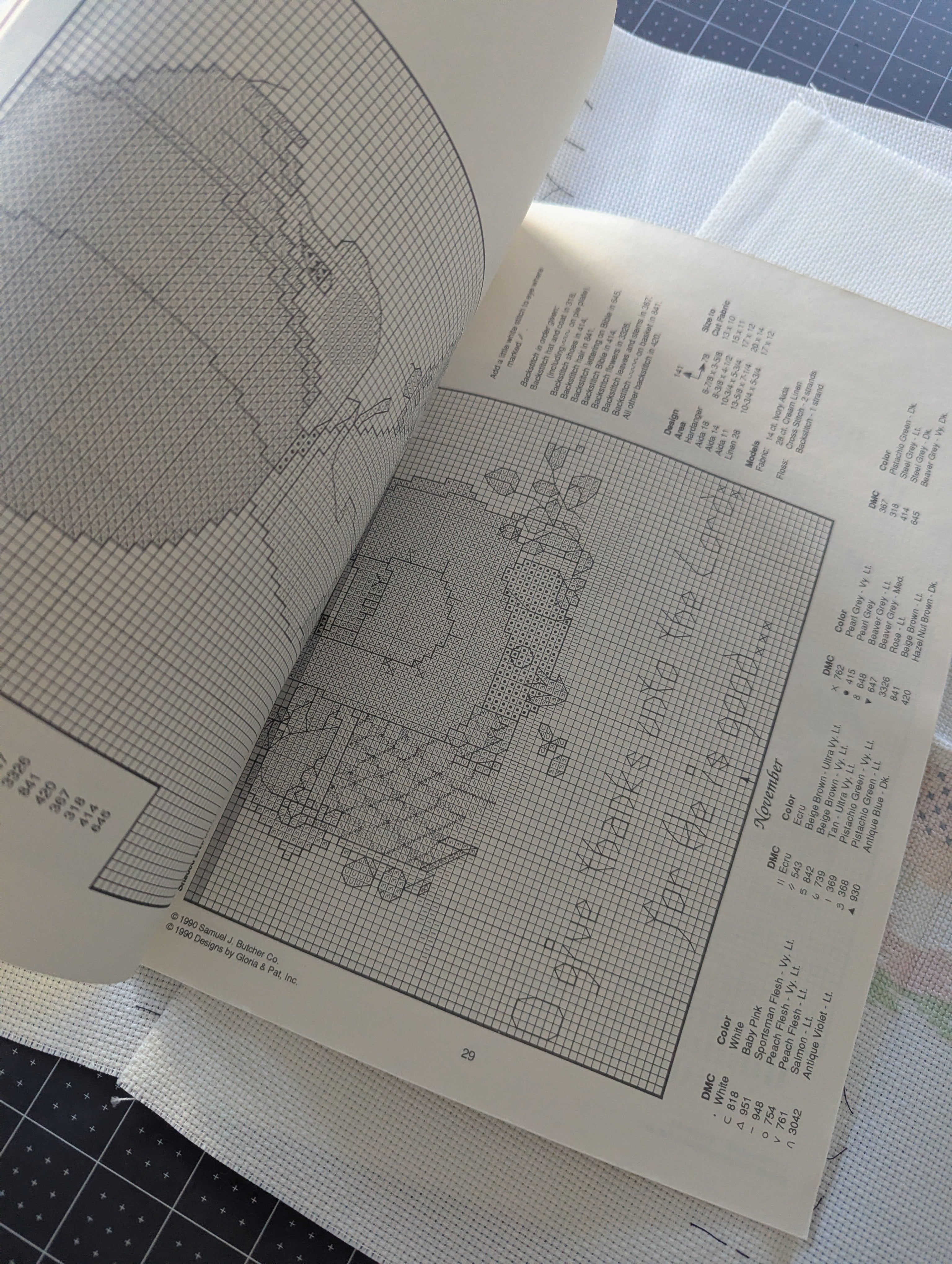 You'll receive the book, which includes 30 pages of patterns, and two pieces of Aida both with the same project started, which appears to be the month of September. Both in a similar stage of completion, and both pictured.