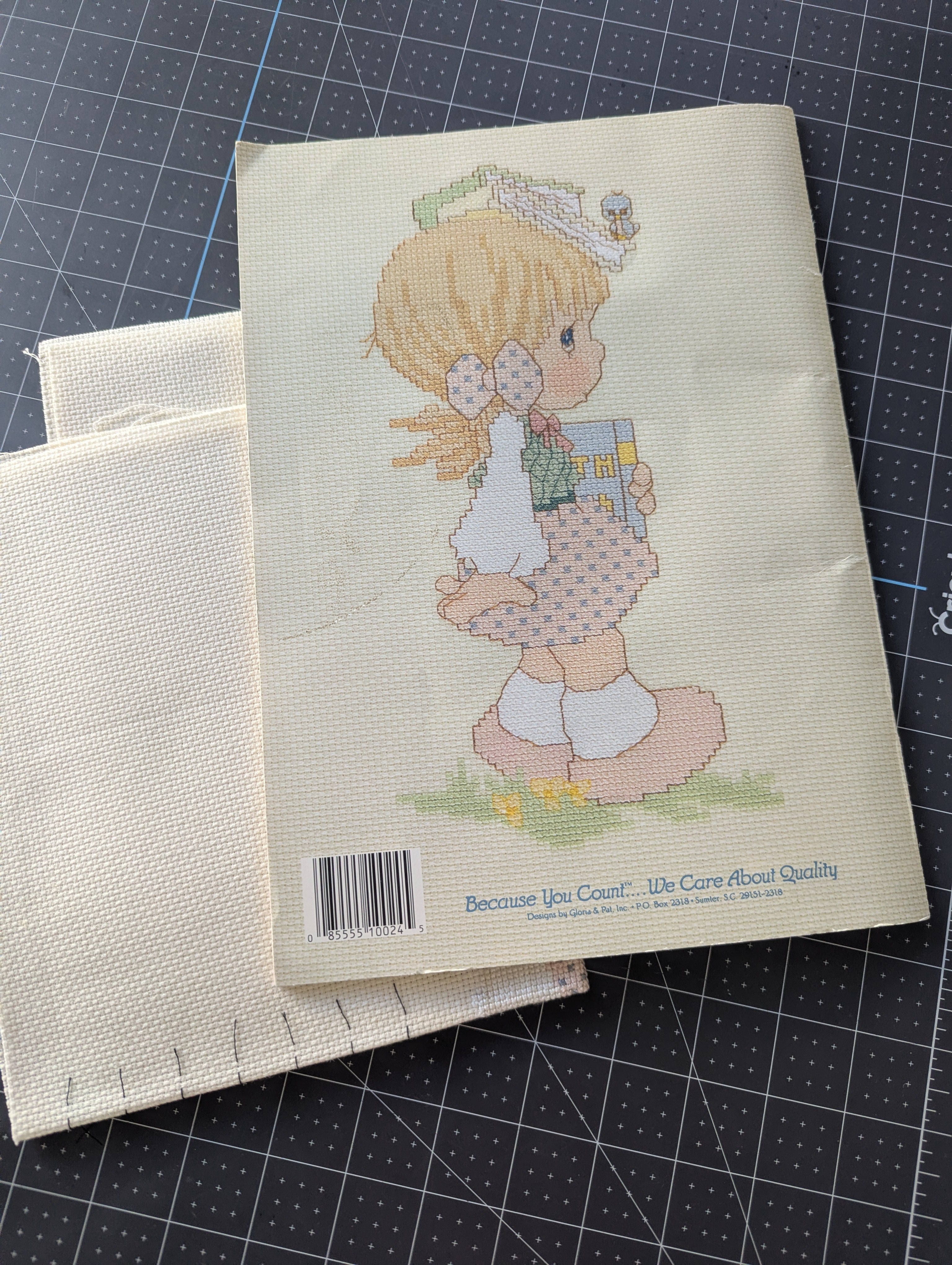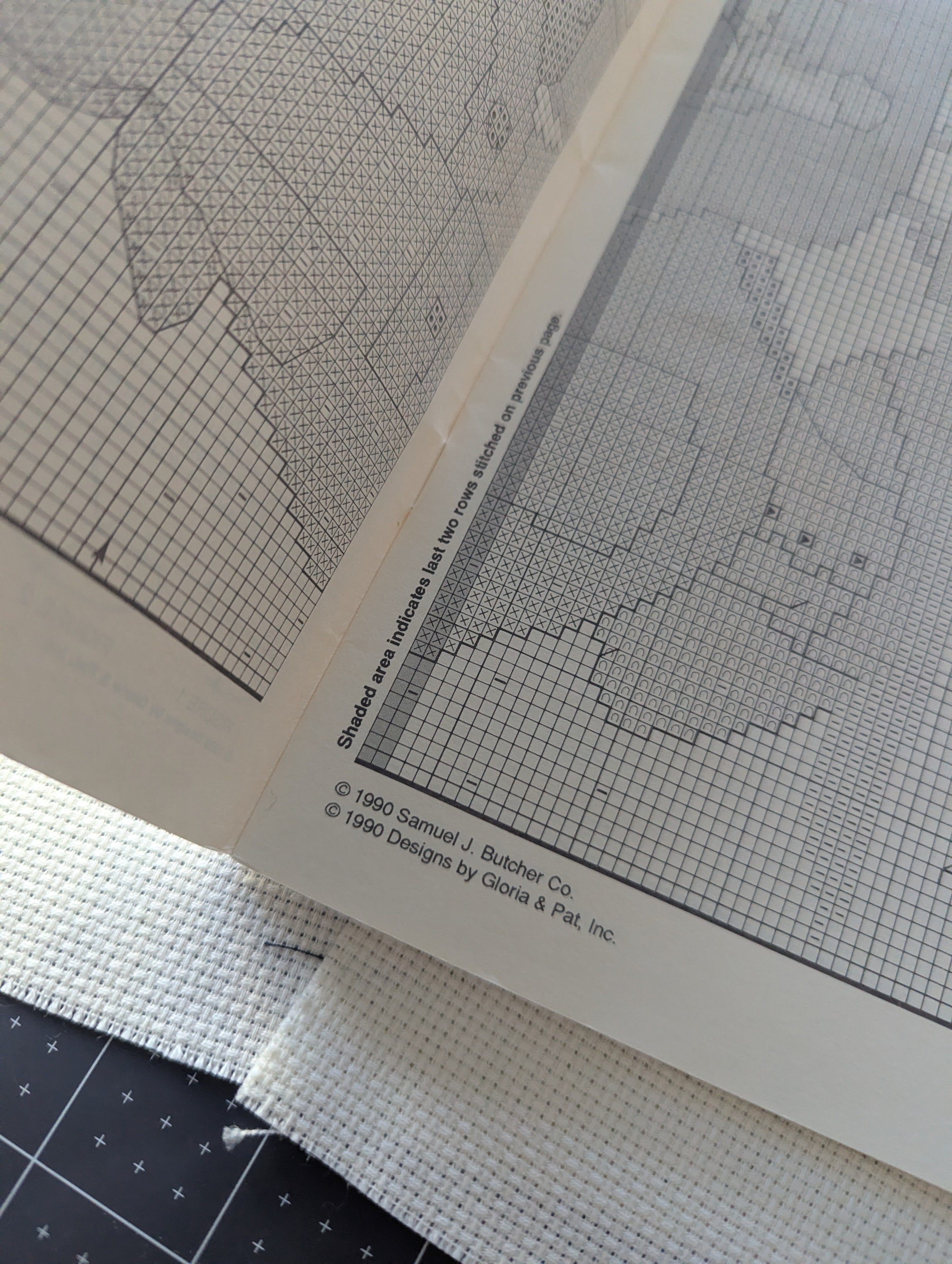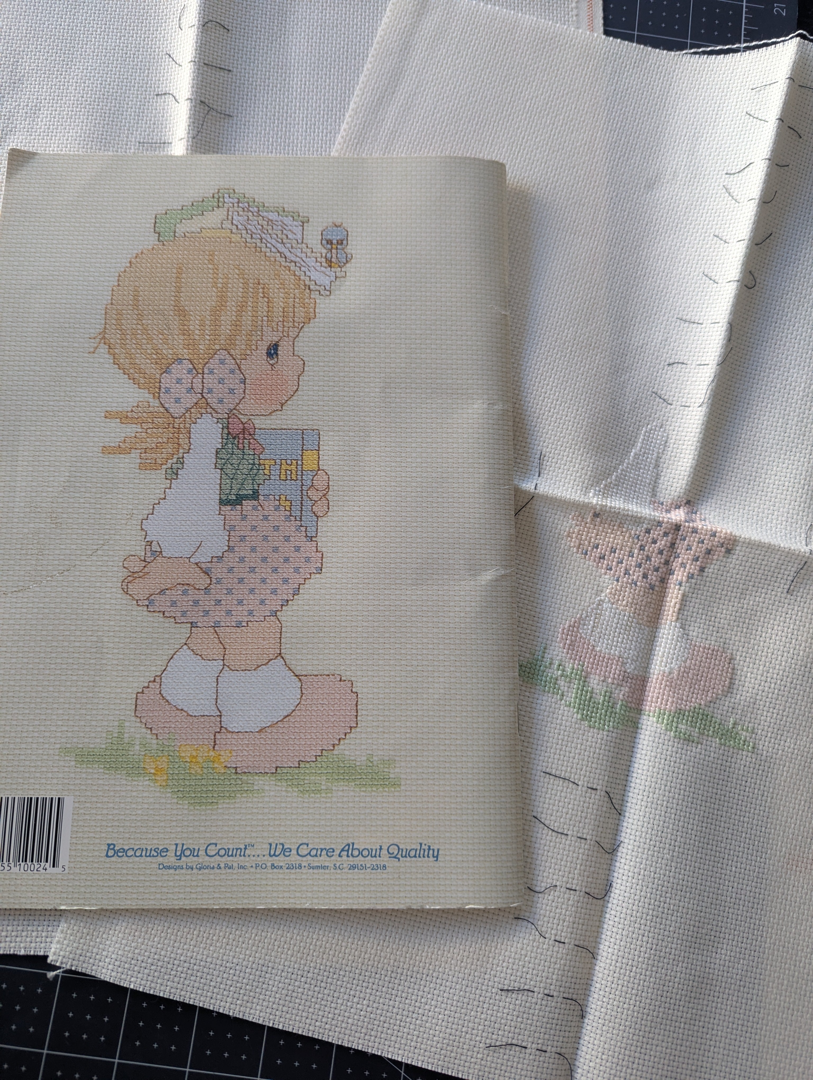 You'll receive the book, which includes 30 pages of patterns, and two pieces of Aida both with the same project started, which appears to be the month of September. Both in a similar stage of completion, and both pictured.