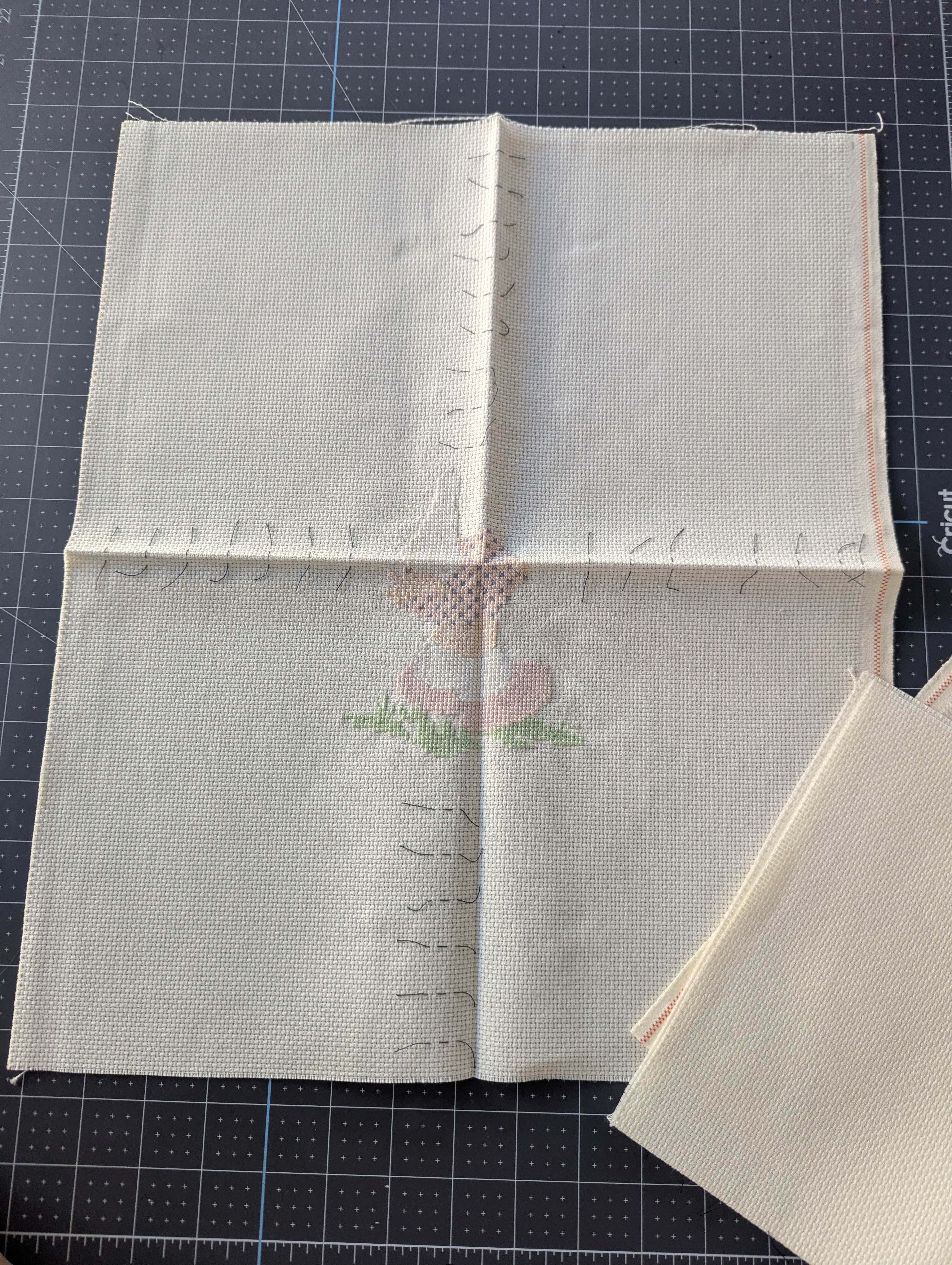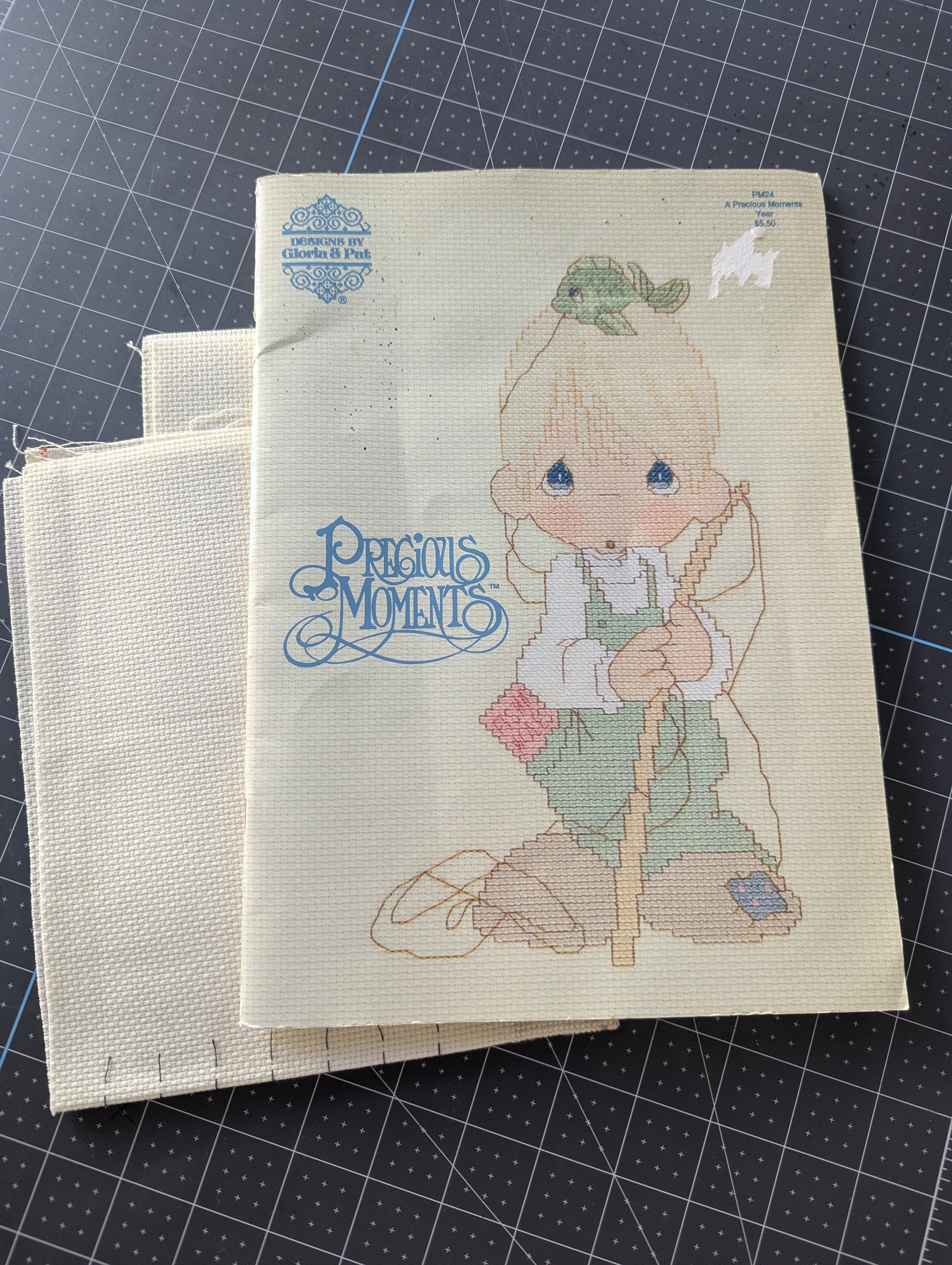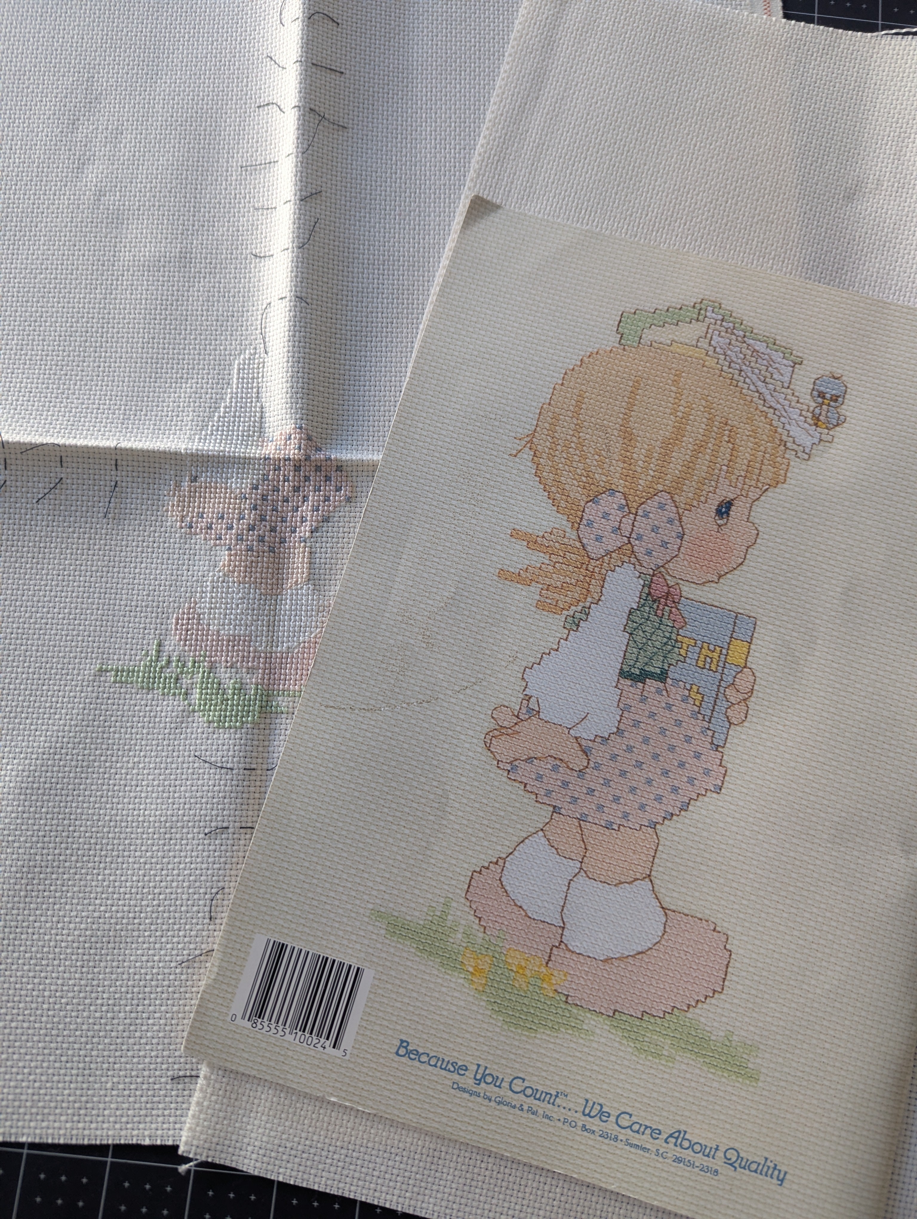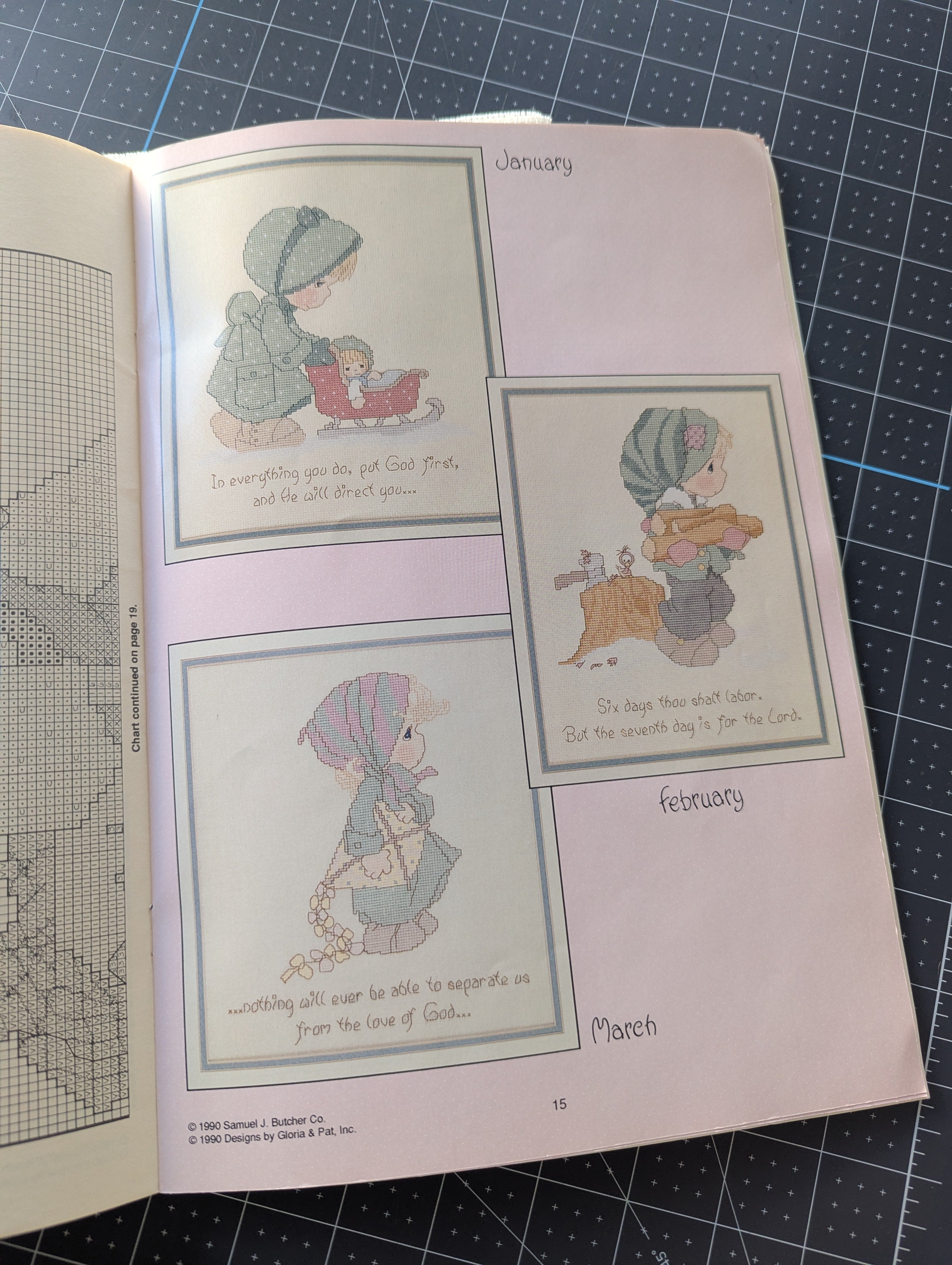 You'll receive the book, which includes 30 pages of patterns, and two pieces of Aida both with the same project started, which appears to be the month of September. Both in a similar stage of completion, and both pictured.