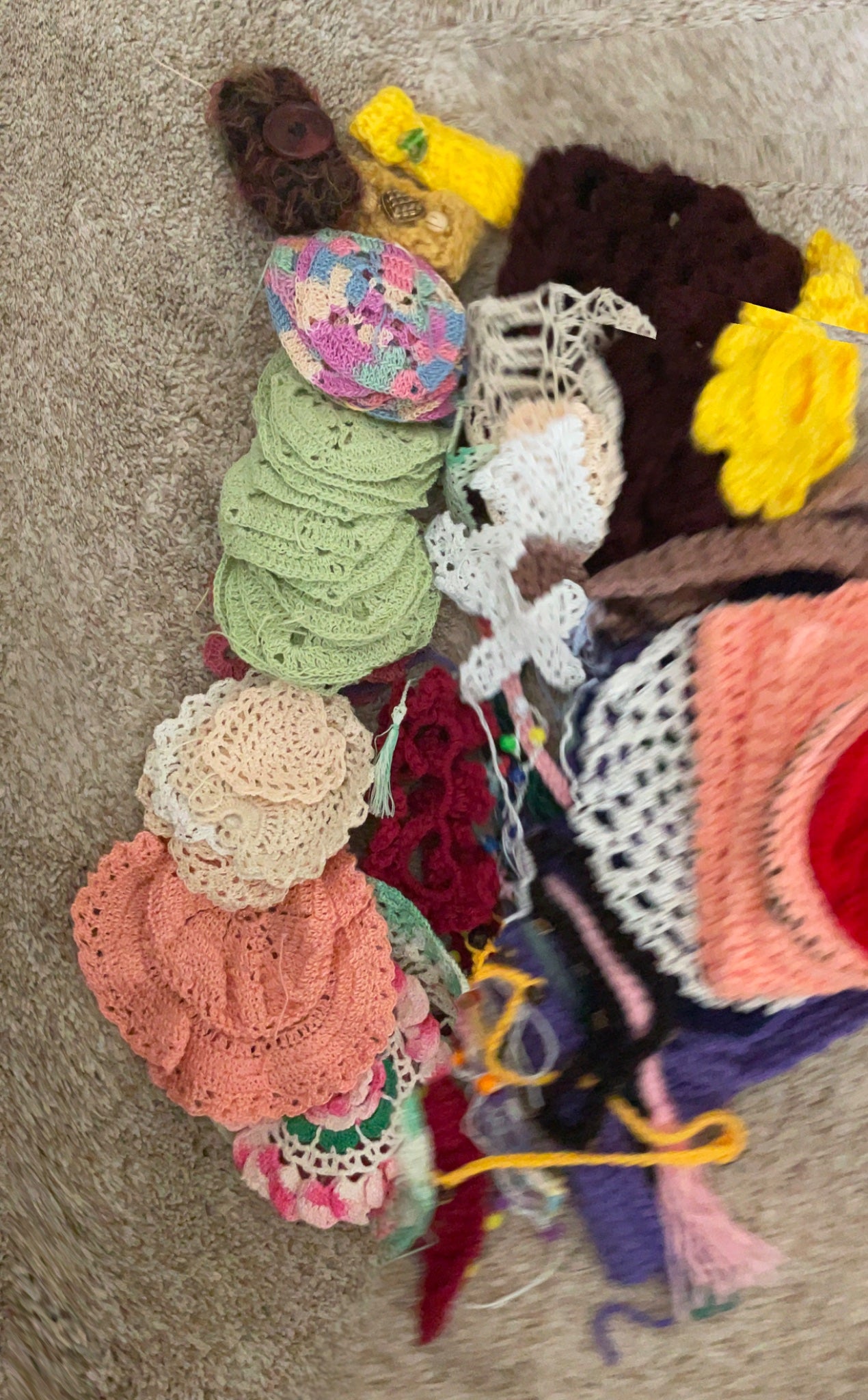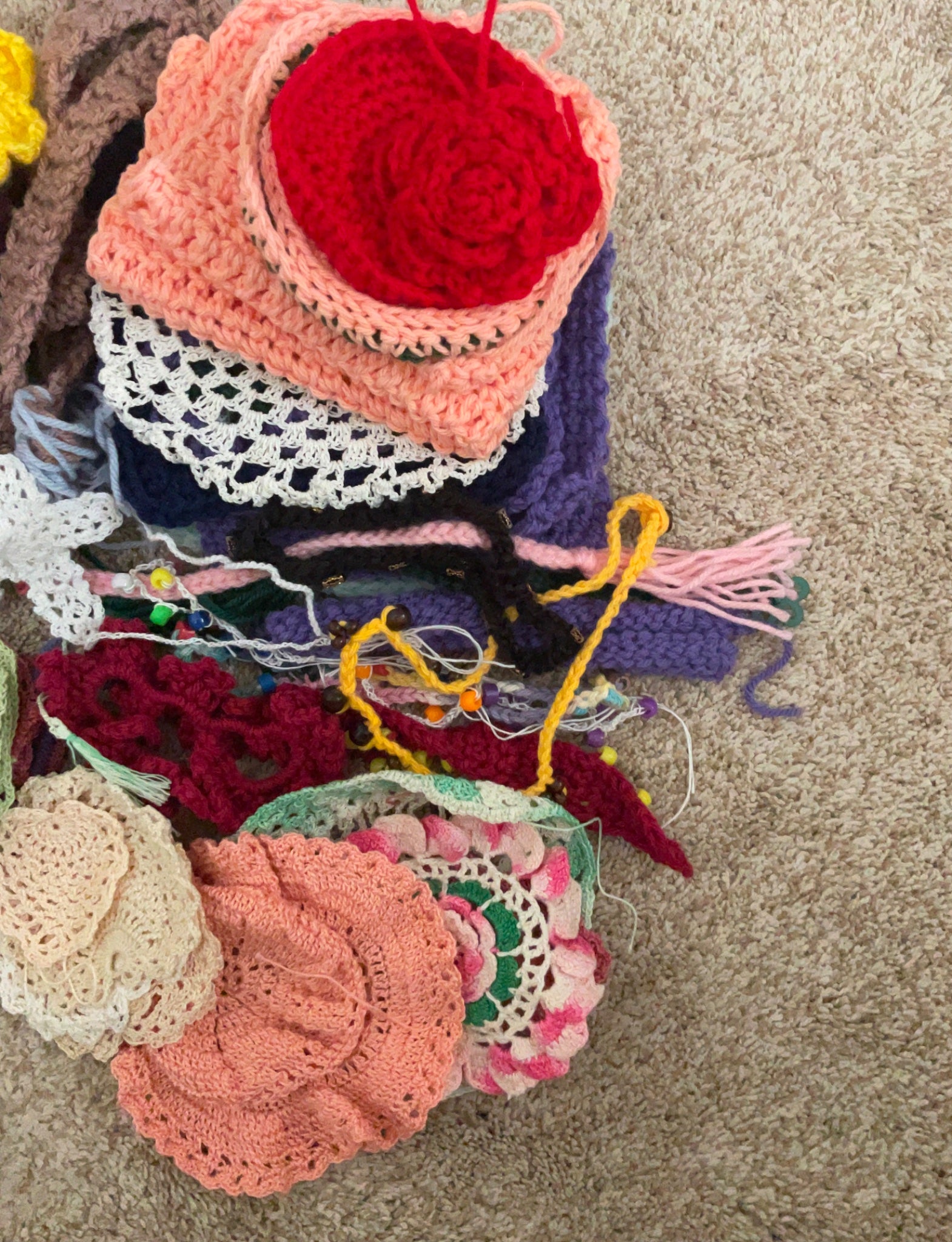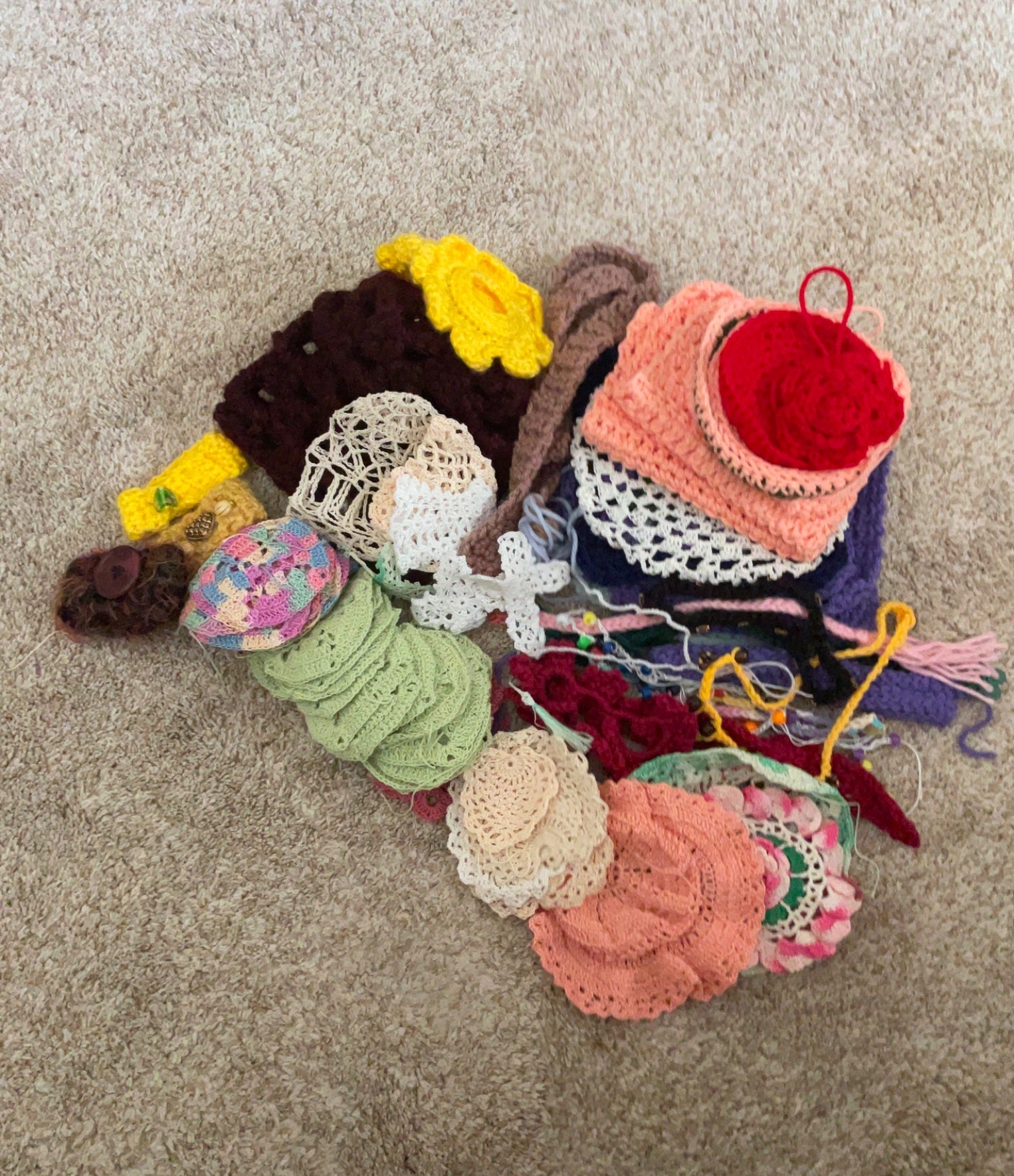 Large lot of crochet patches, started projects, some finished products, like bracelets, belt, crosses, started patches fir doily that needs joining. I am downsizing and offering a great lot.