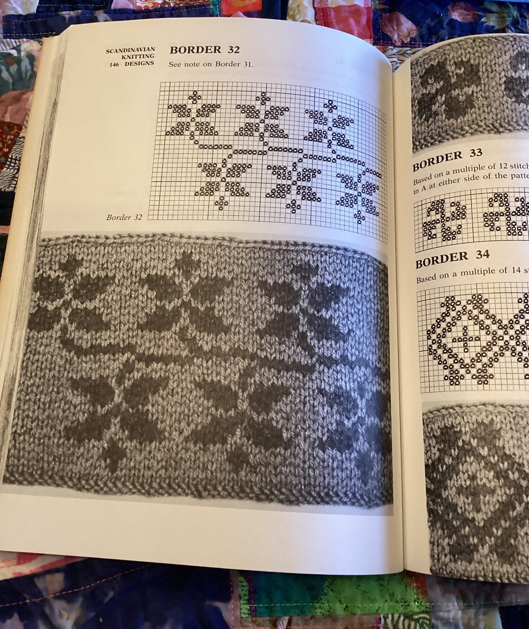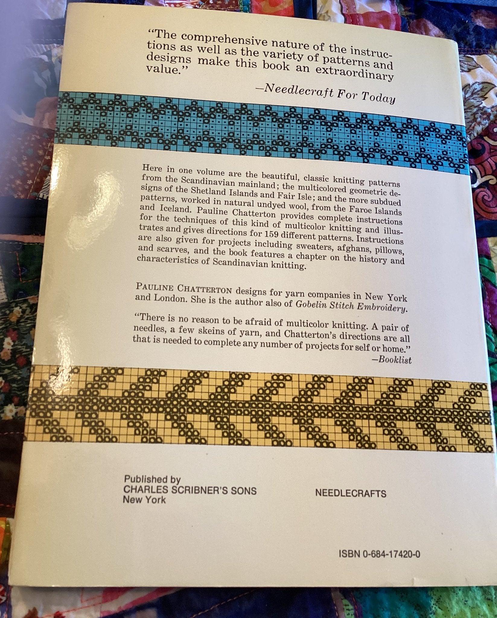 Booklist says about this book “There is no reason to be afraid of multicolor knitting.  A pair of needles, a few skins of yarn and Chatterton’s directions ae all that is needed to complete any number of projects for self or home”.