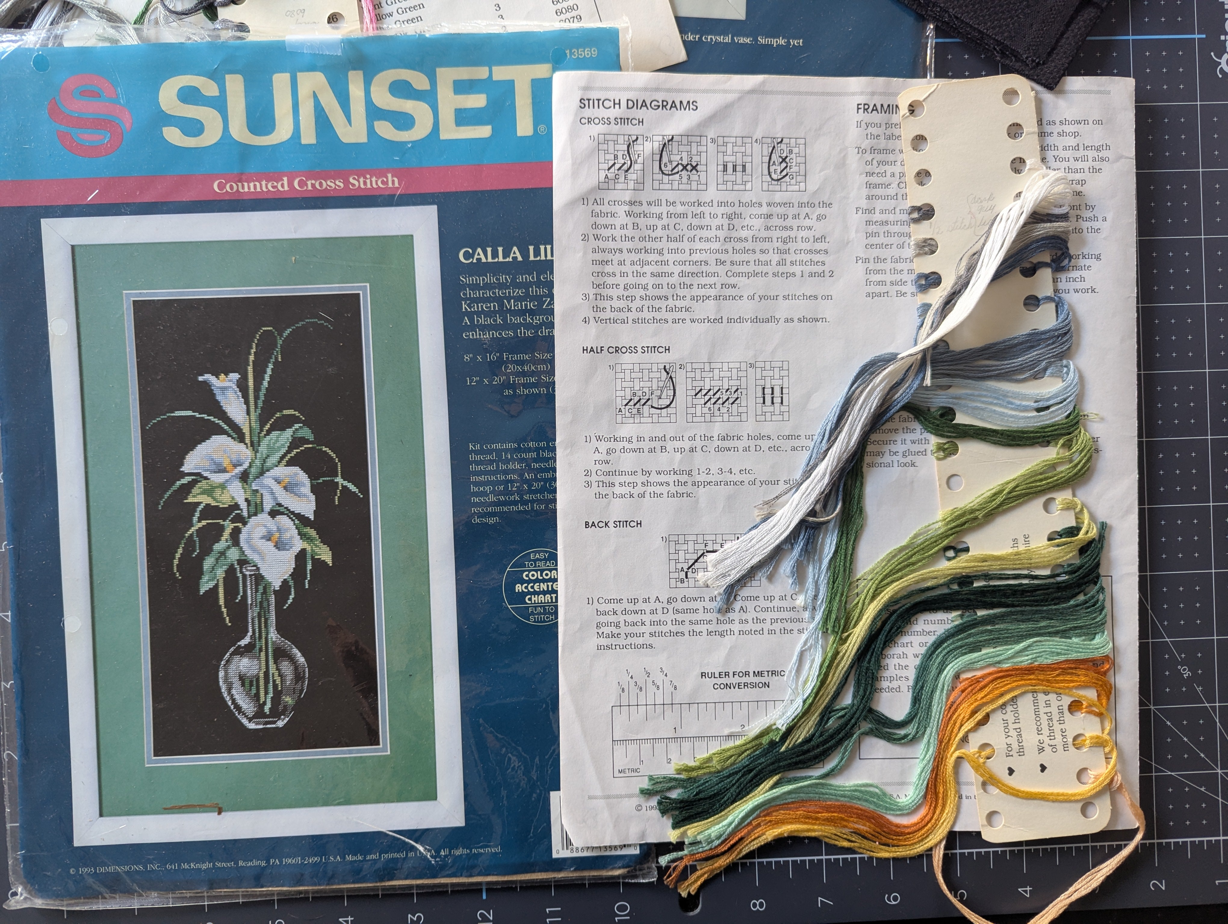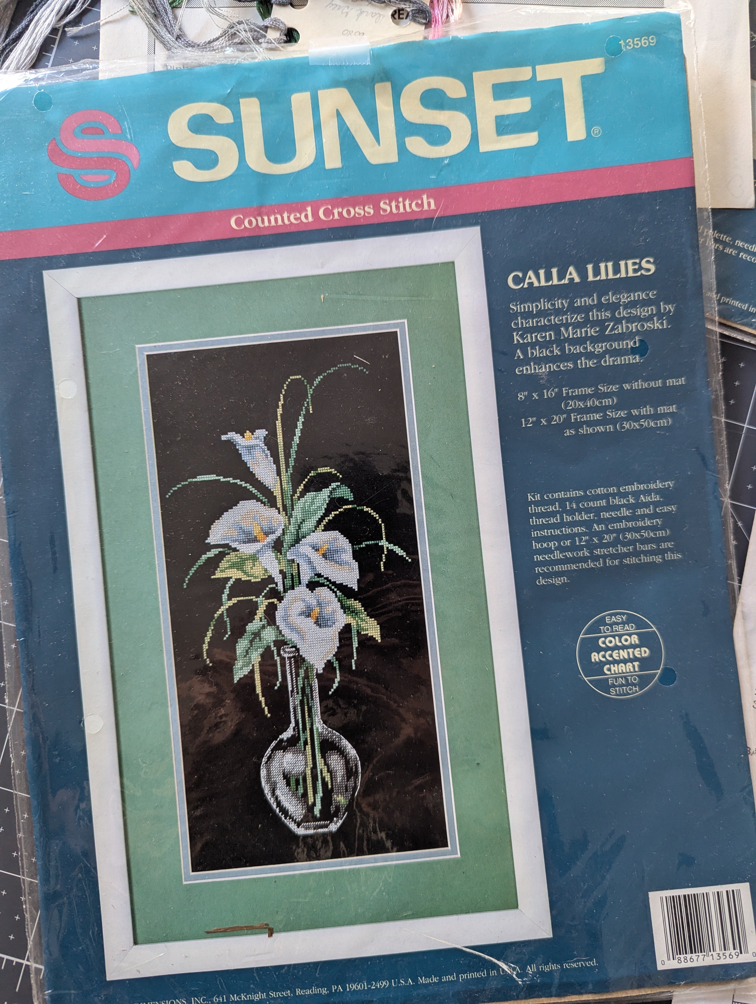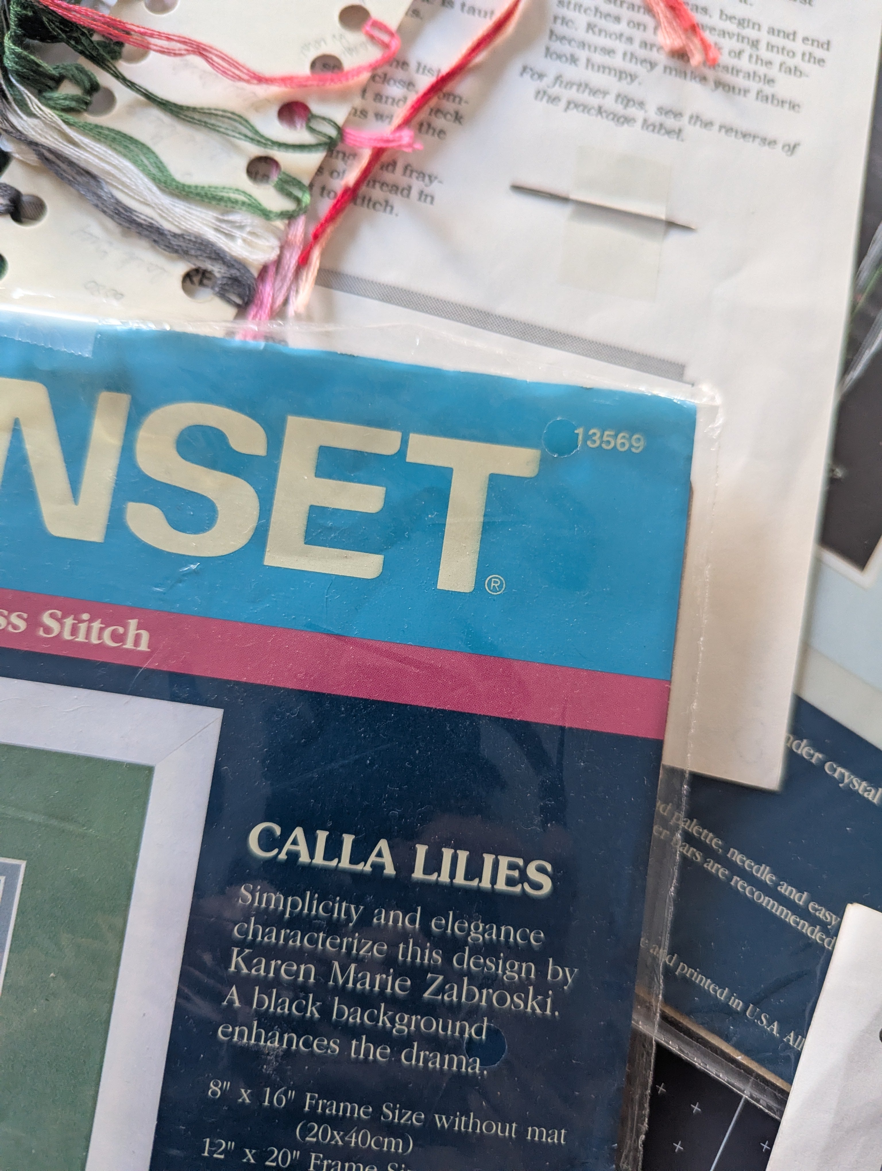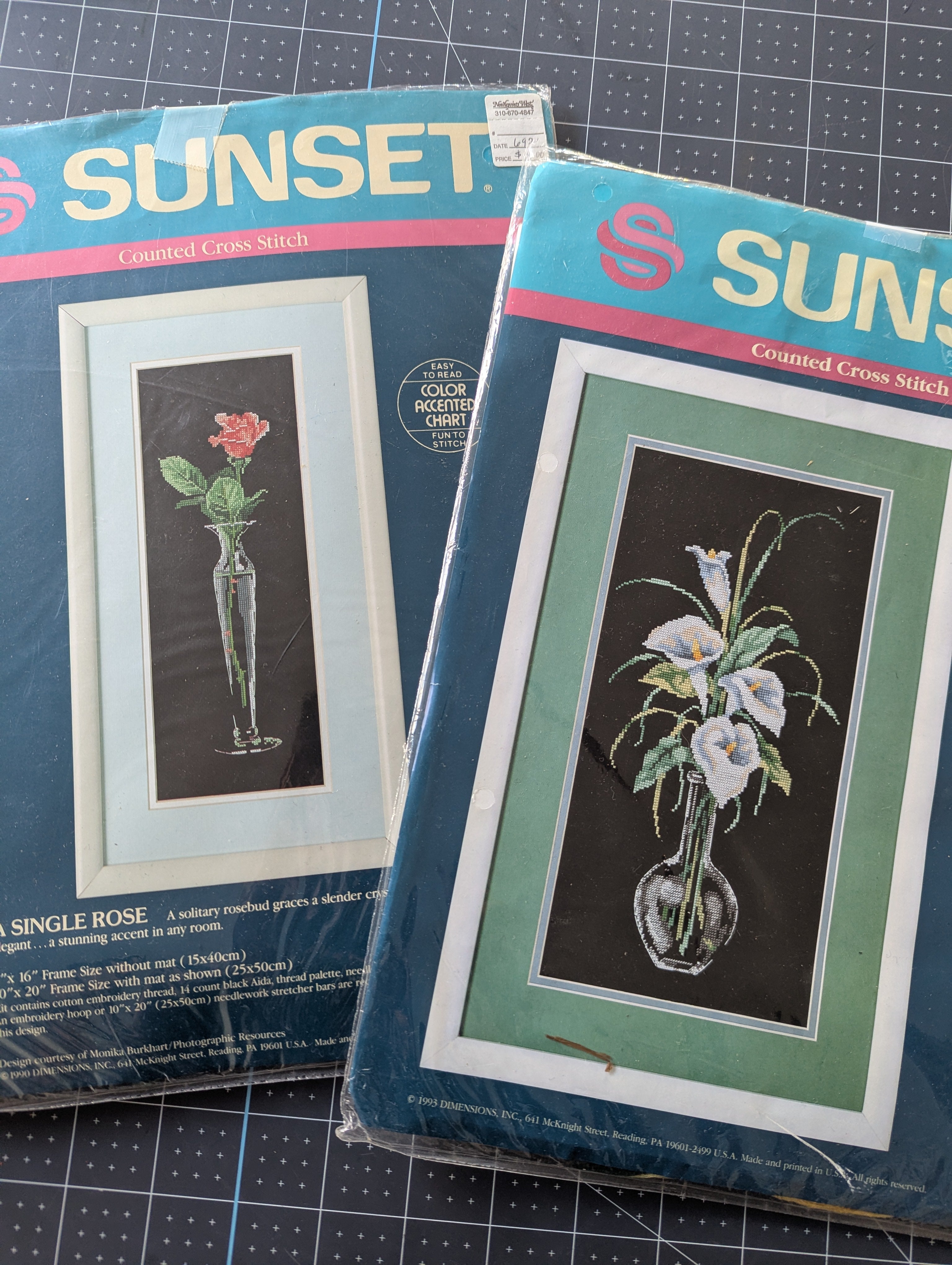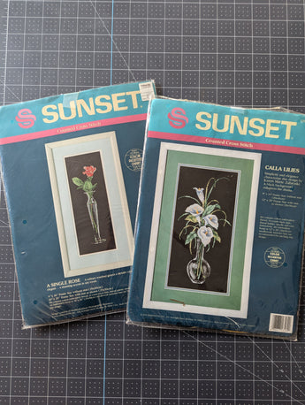 Note: These are NOT complete kits. The Calla Lilies is pattern, and floss chart only. The Single Rose is pattern, floss chart, textile, and needle. Additional supplies will be needed to complete either piece.