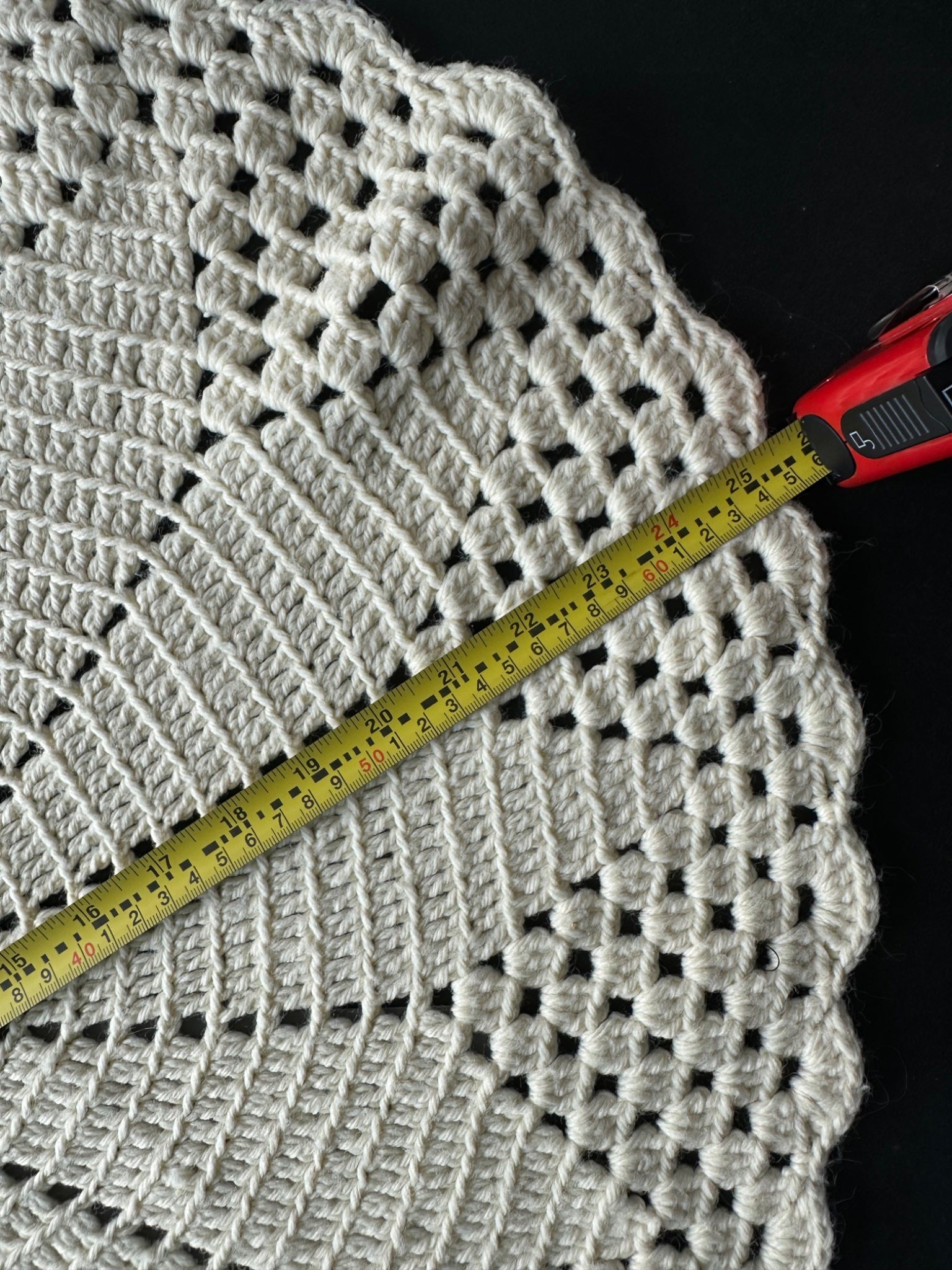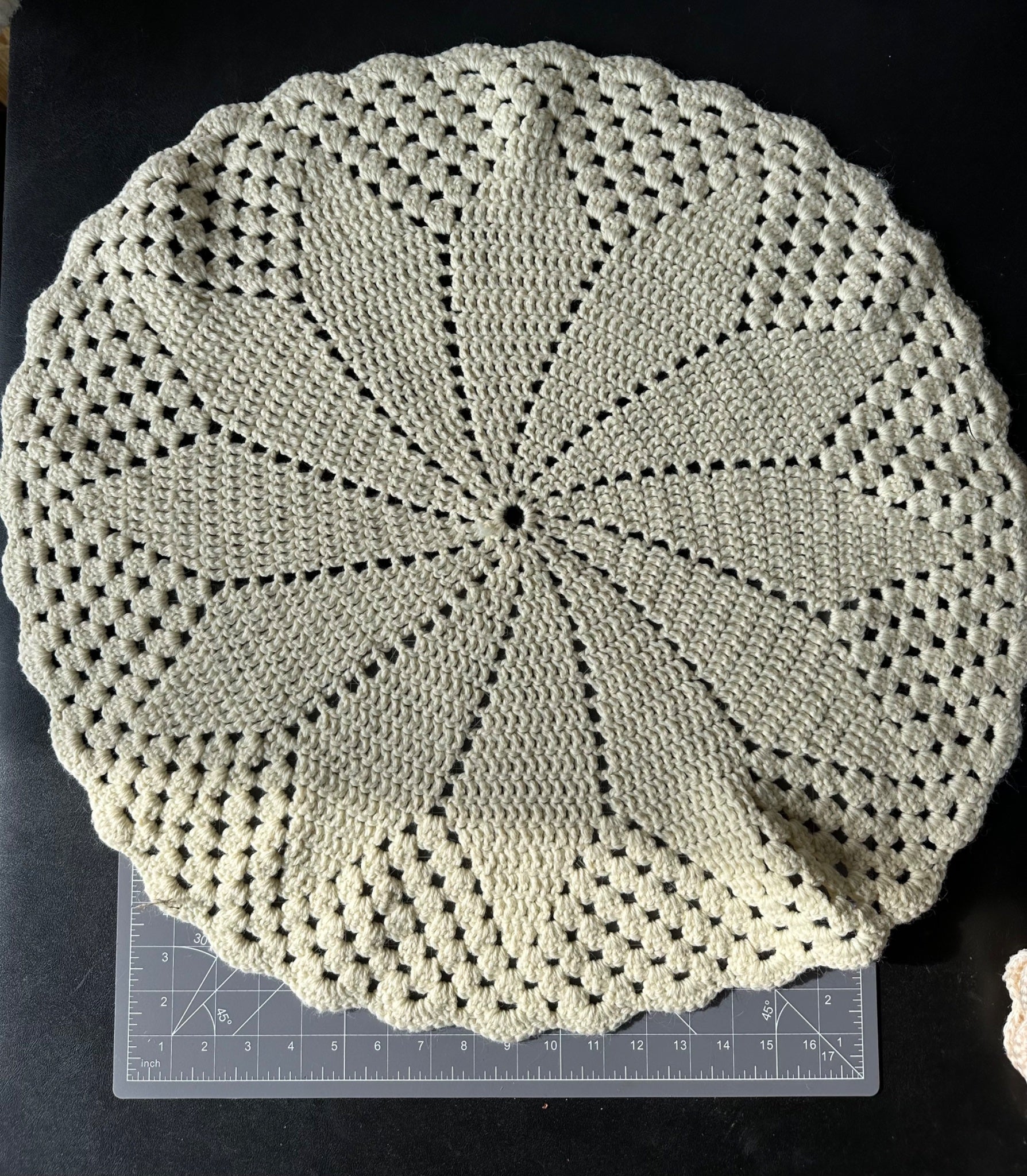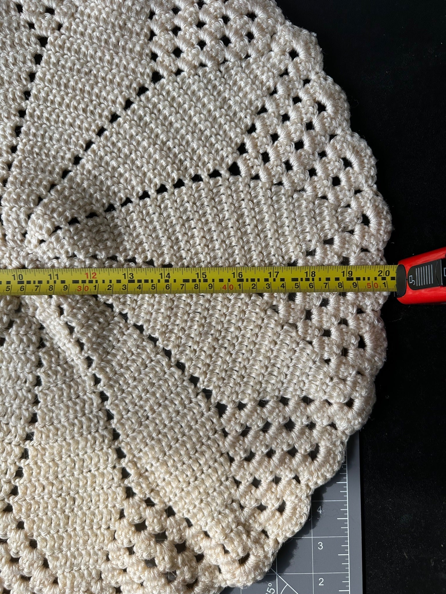 These extra large crocheted doilies measure 20 inches, and 25 inches. See photos for condition and details. Mat is in inches for scale reference.