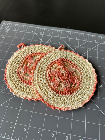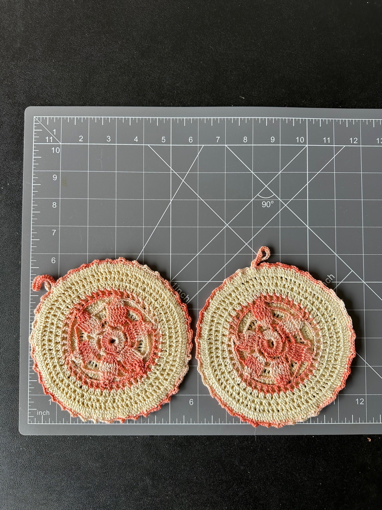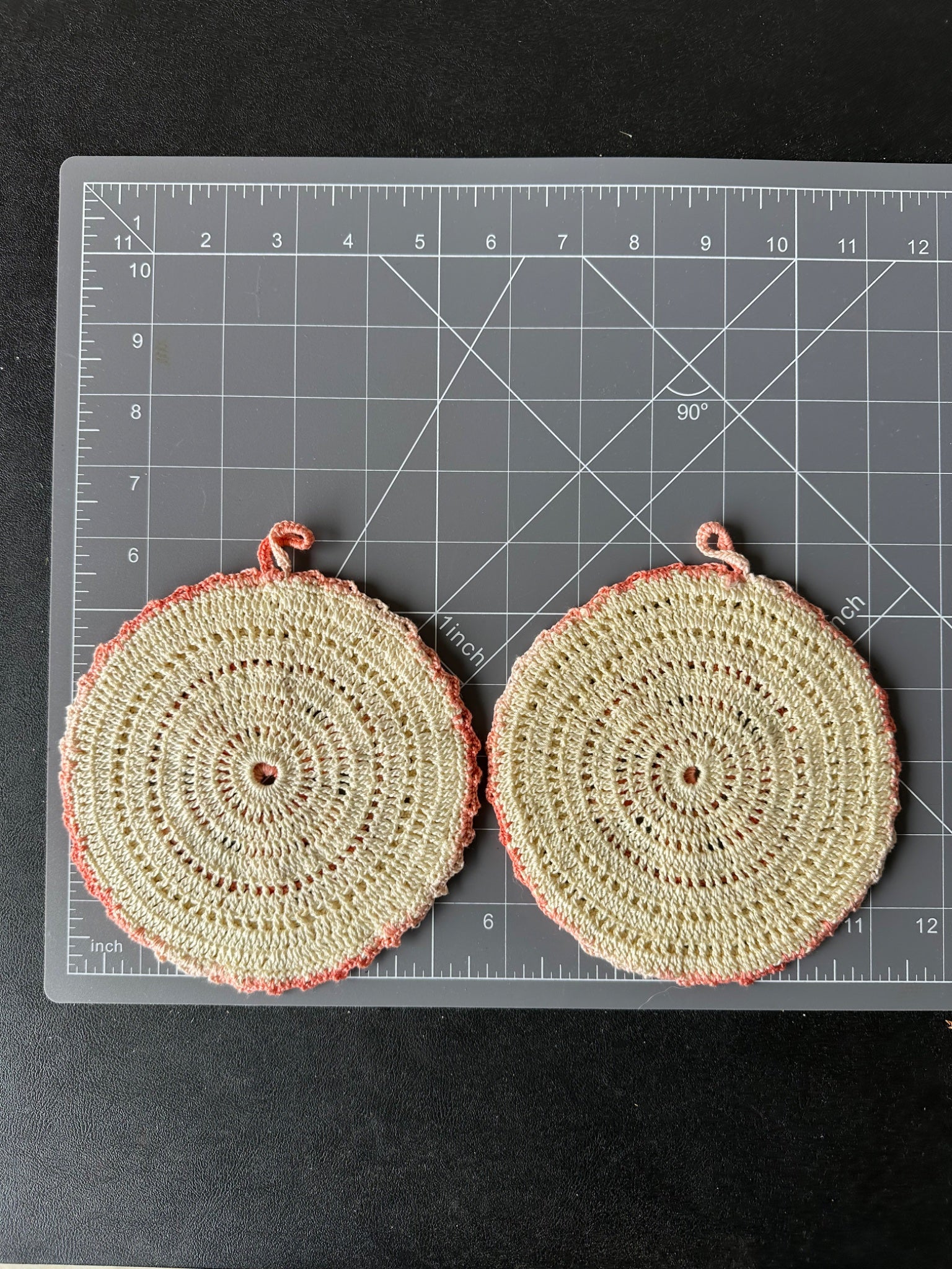 These cute little crocheted doilies or pan holders measure approximately 6-inches in diameter each. See photos for condition and details. Mat is in inches for scale reference. Great for upcyclers!