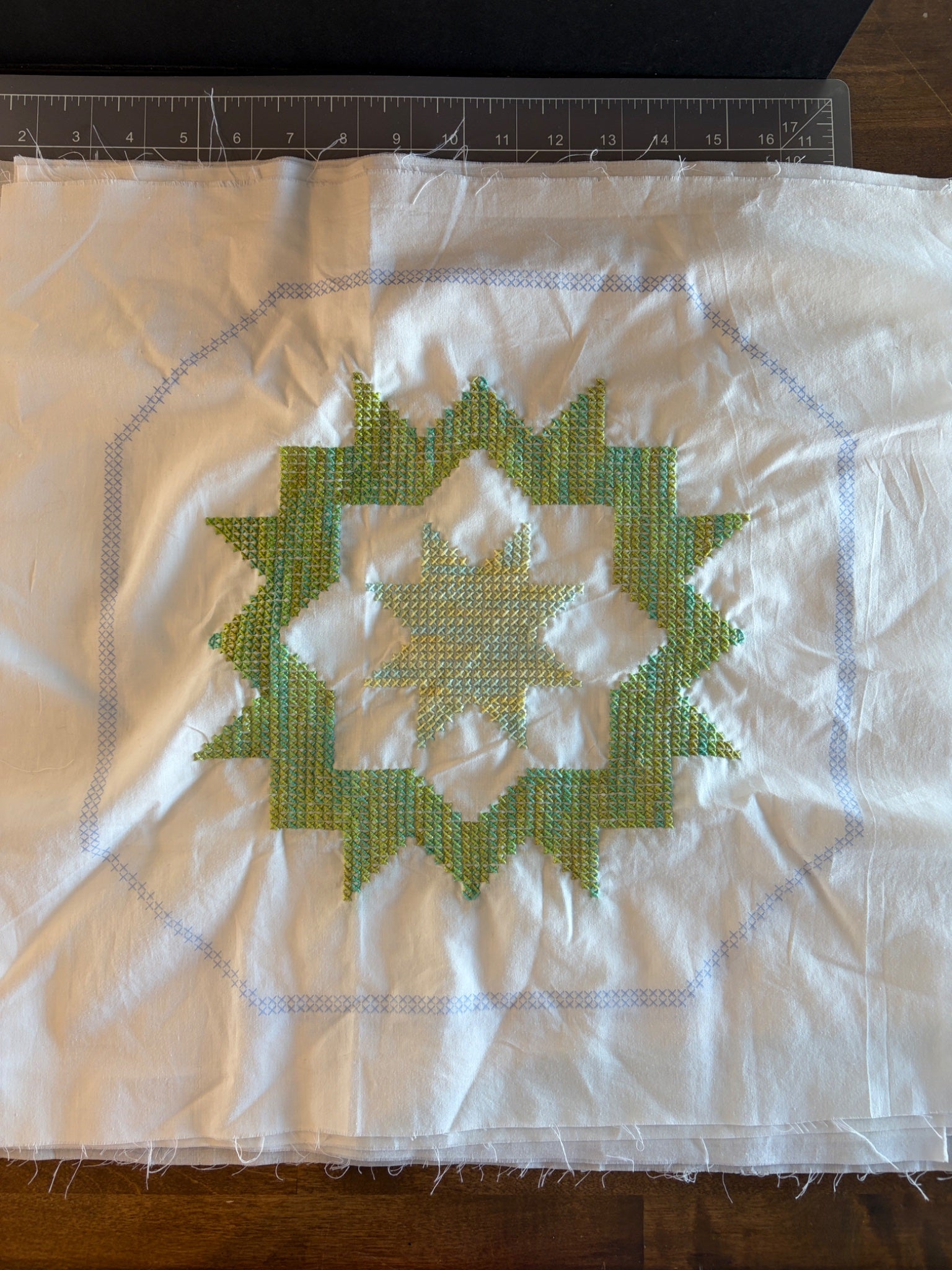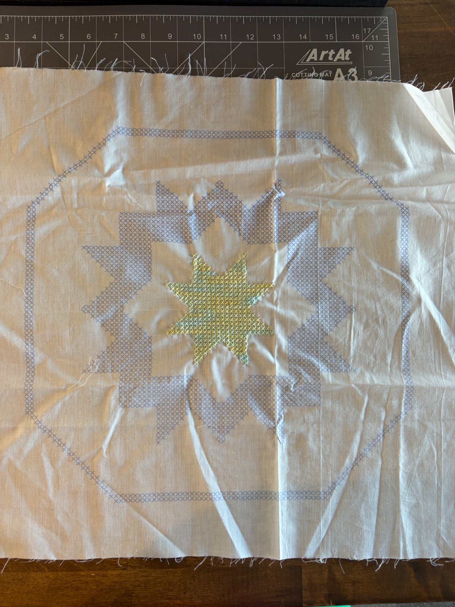 Great start to a project! 5 of these squares have the center finished and would just need the border. The last piece is needing additional work in the center as well.