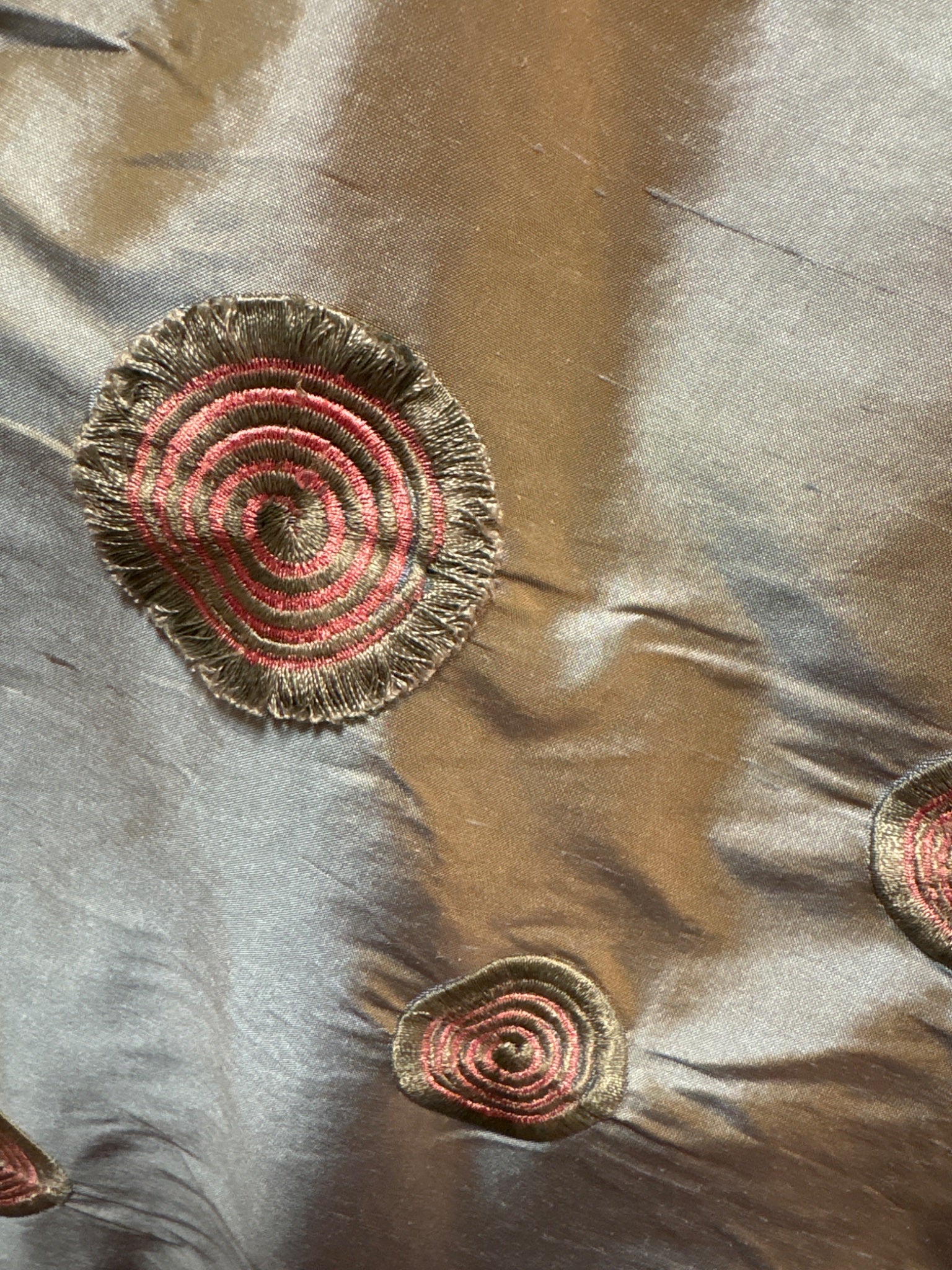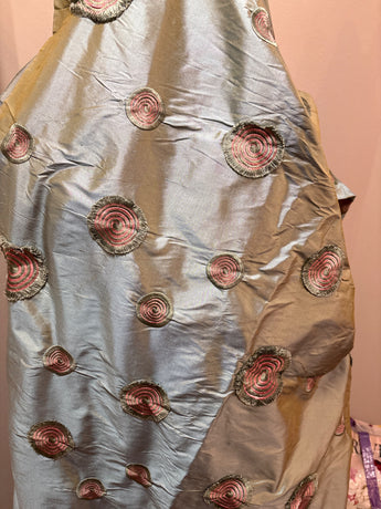 2.5 yds x 54" w. Sage green fancy maybe synthetic silk like fabric with embroidered embellishments. From the estate of a lady that made art clothes. Sage green with coral. Wrinkles from storage. No odors. For a dress, jacket, pillows etc.