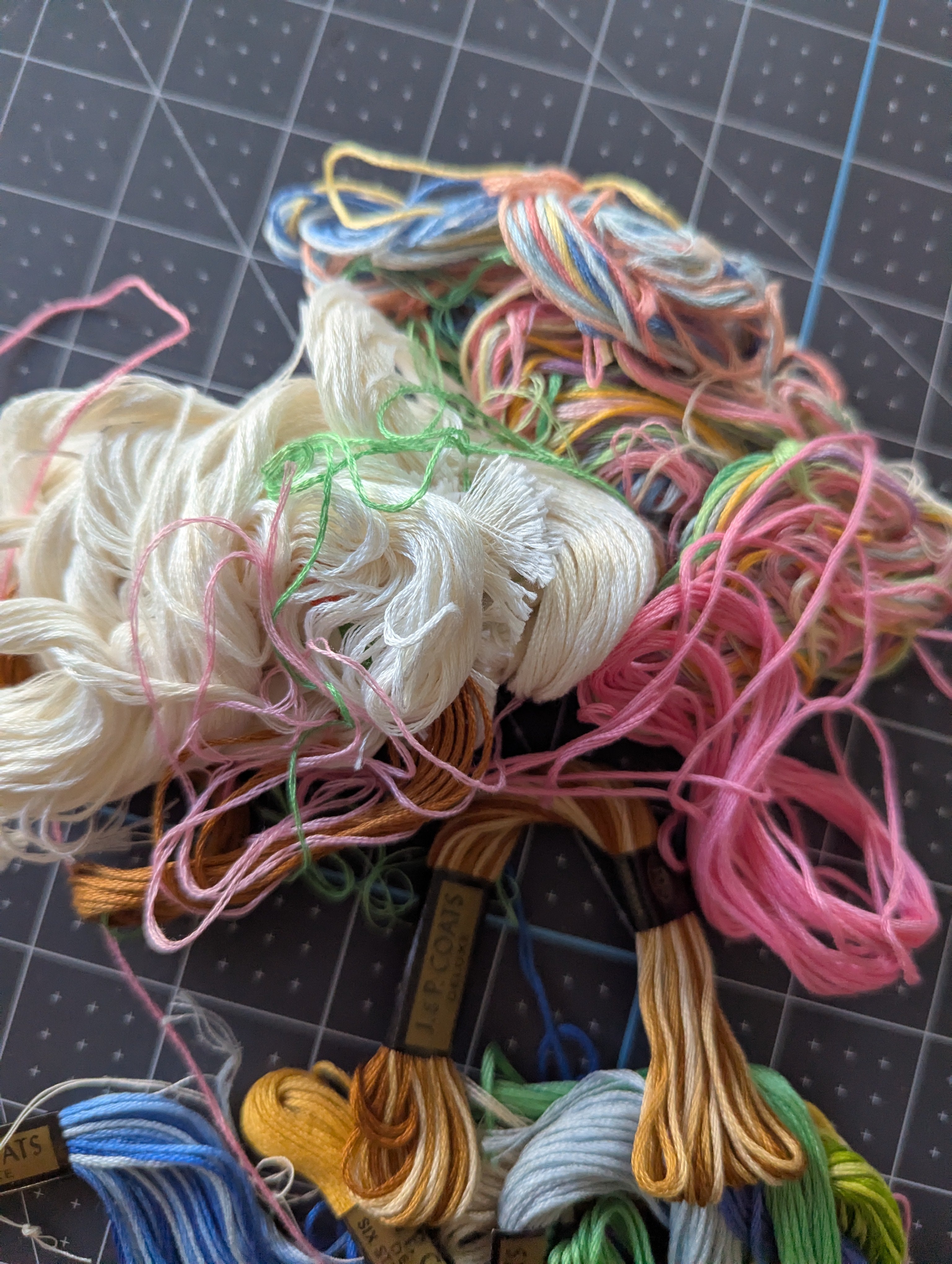 A cute kit assembled by a previous crafter. Needles are new in package, plenty of floss here along with a hoop.