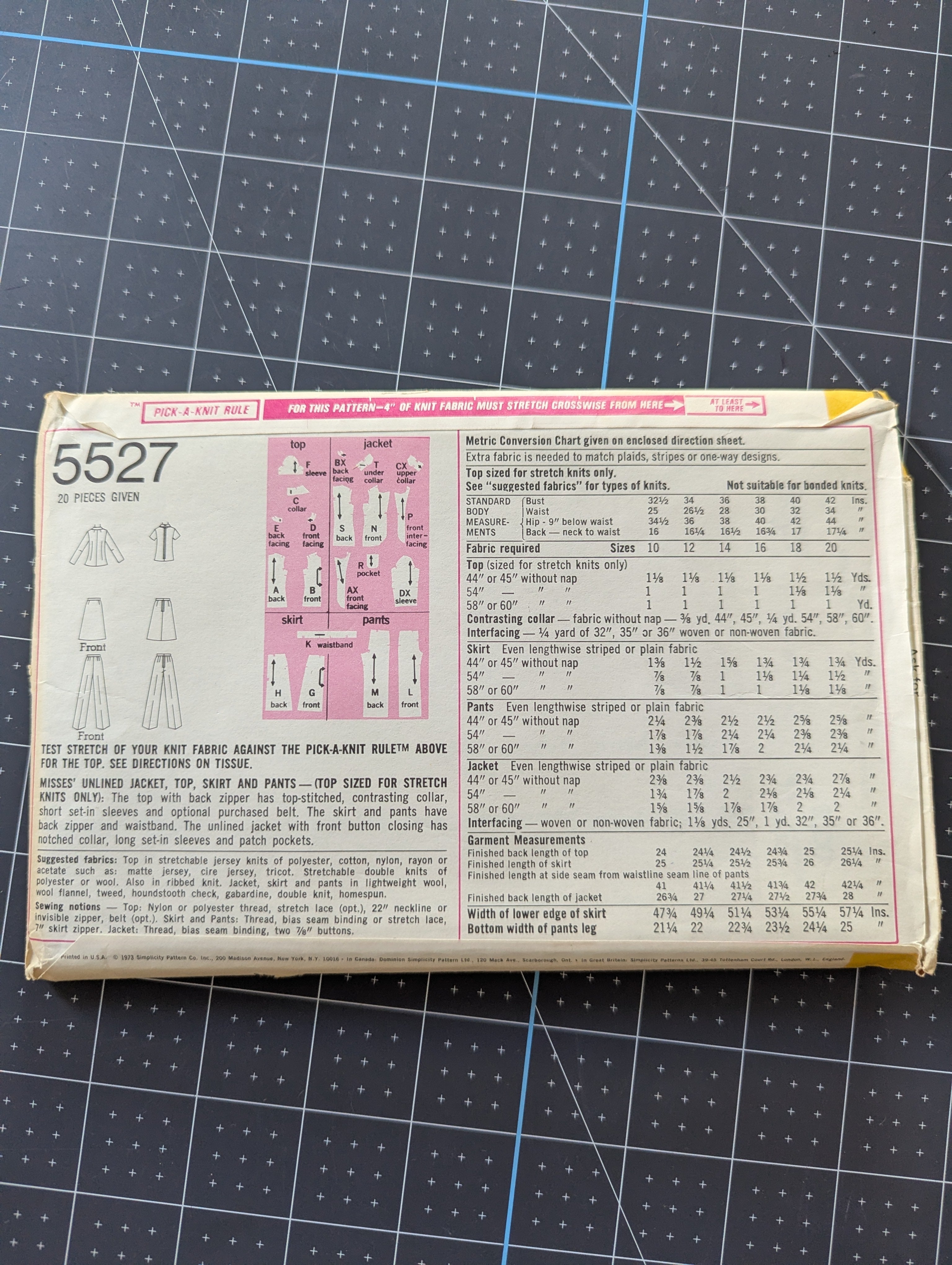 Vintage Simplicity Pattern #5527 - 1973 - Top, Jacket, Skirt, Pants