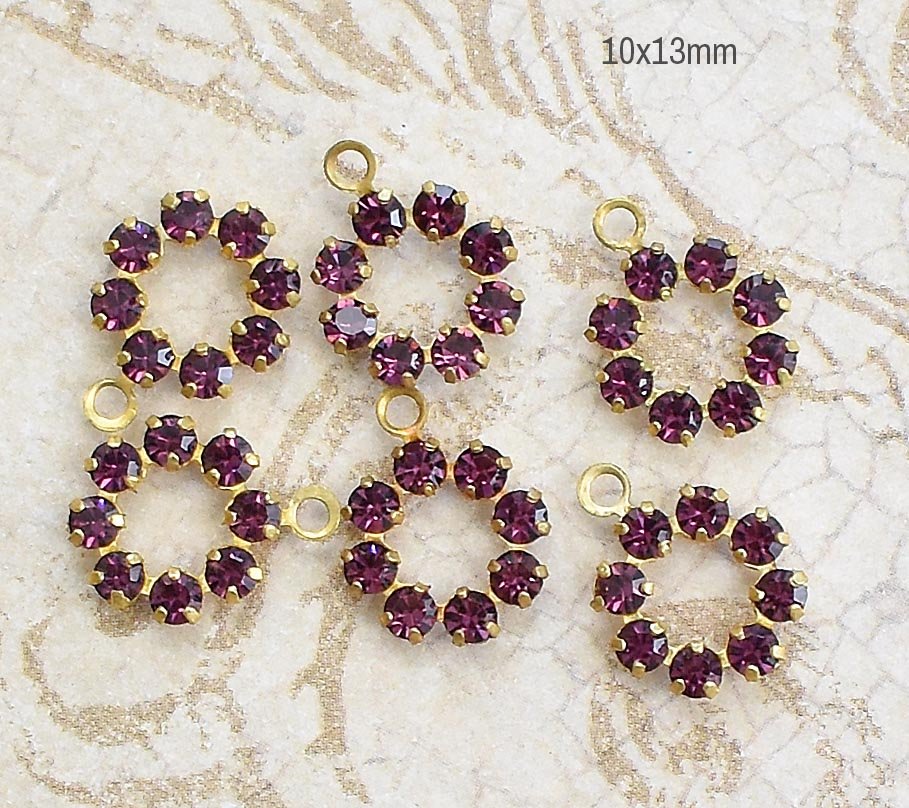 These are so pretty and delicate! Amethyst glass Czech rhinestones in a brass circle setting. So cute for earrings!