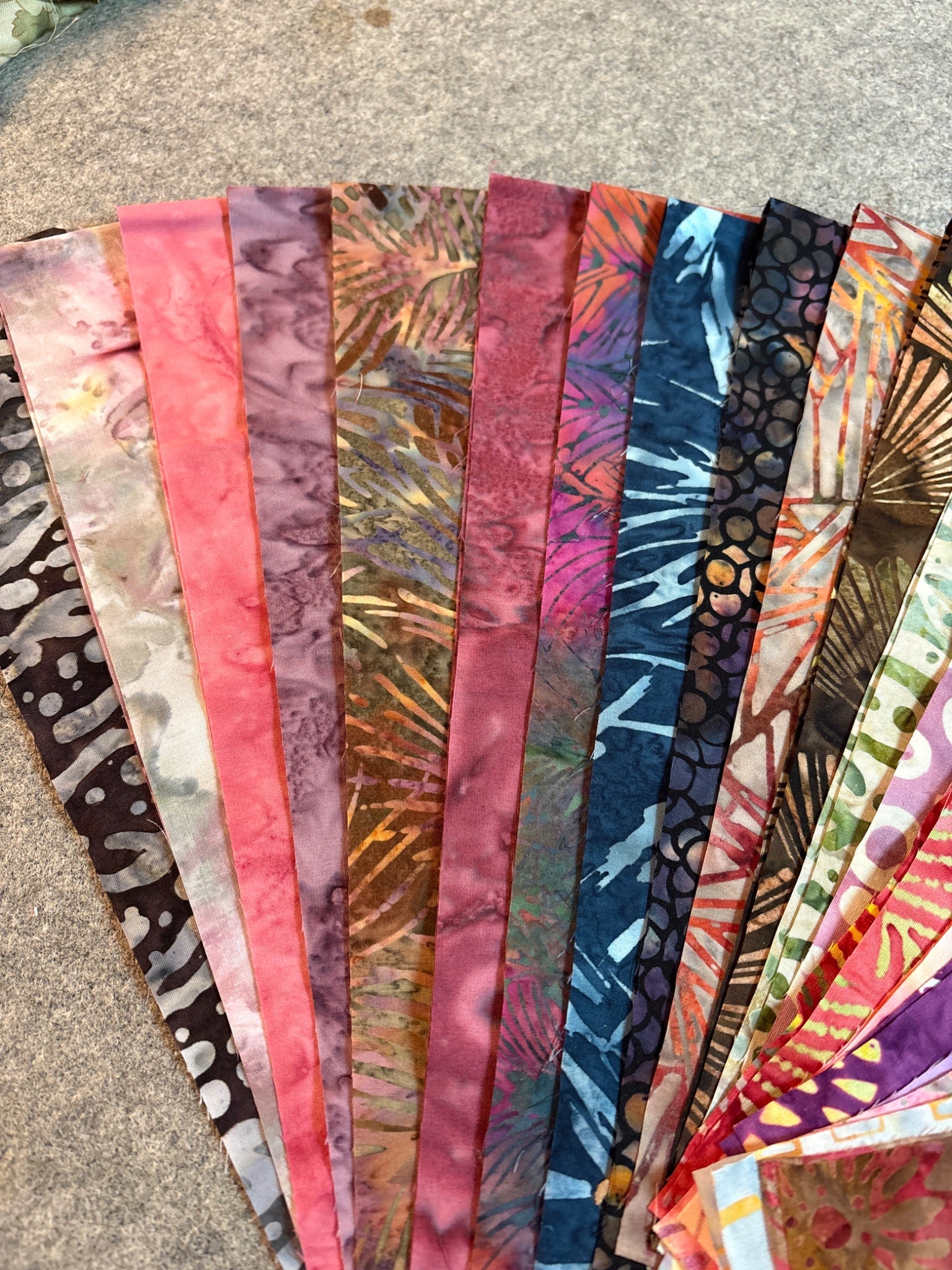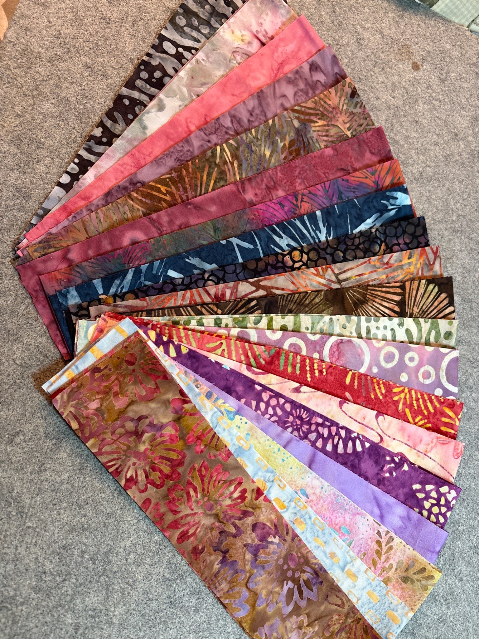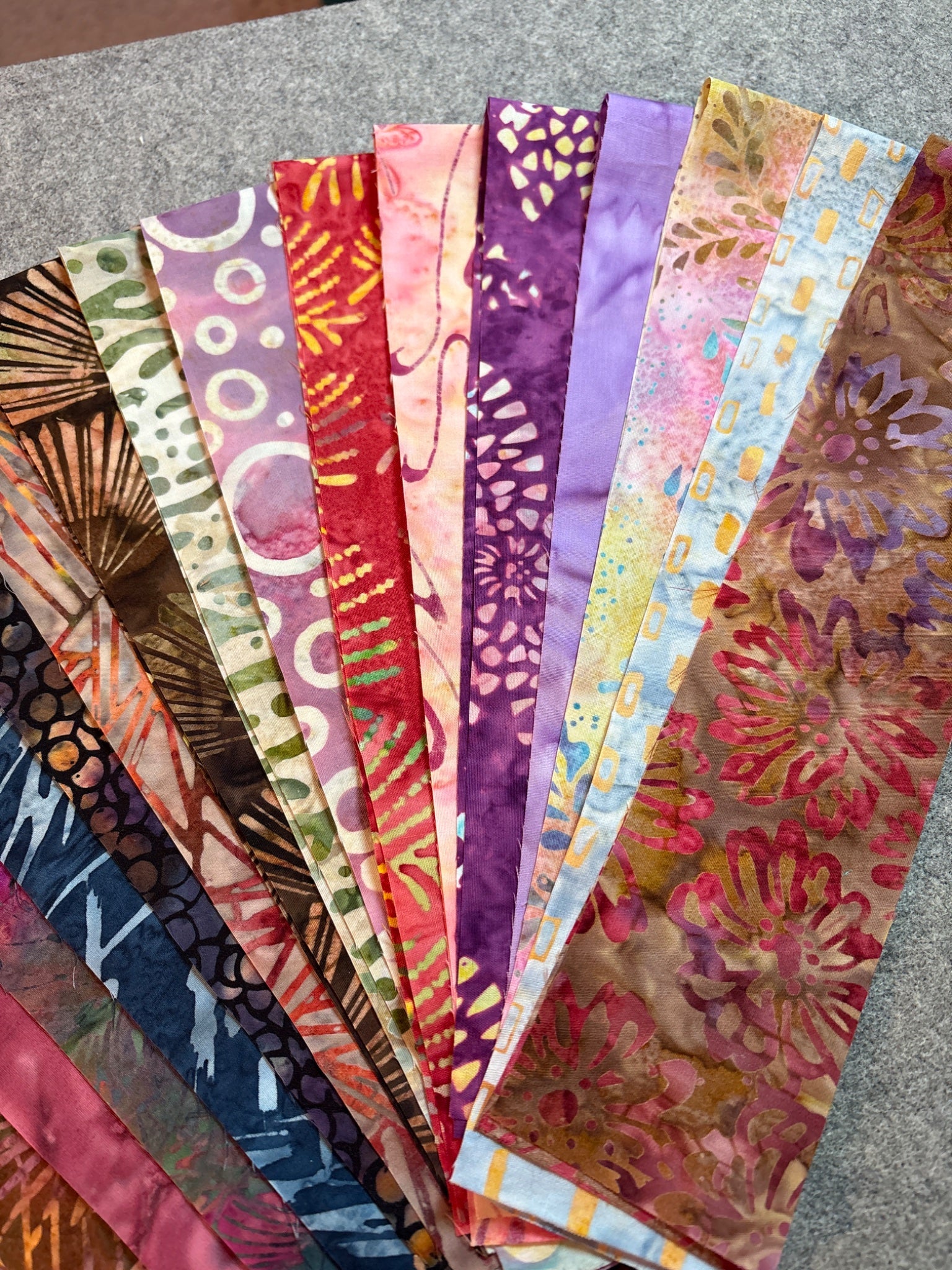 Lot of batik strips, 20 ea 2.5” x 21” purple earthtones