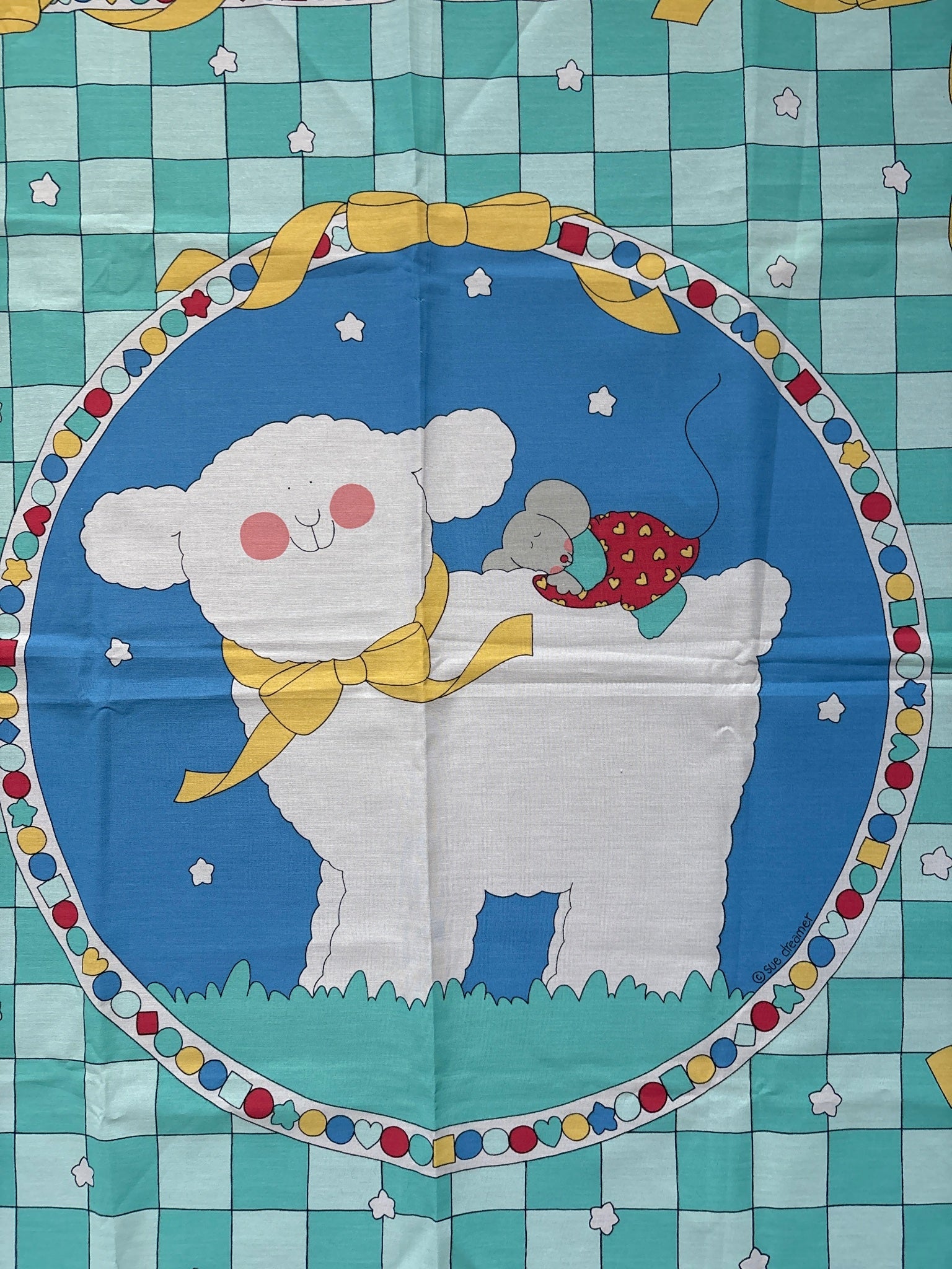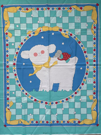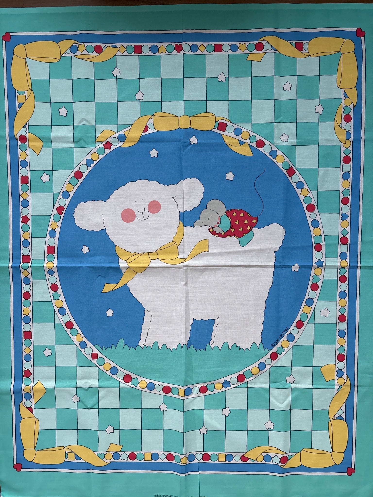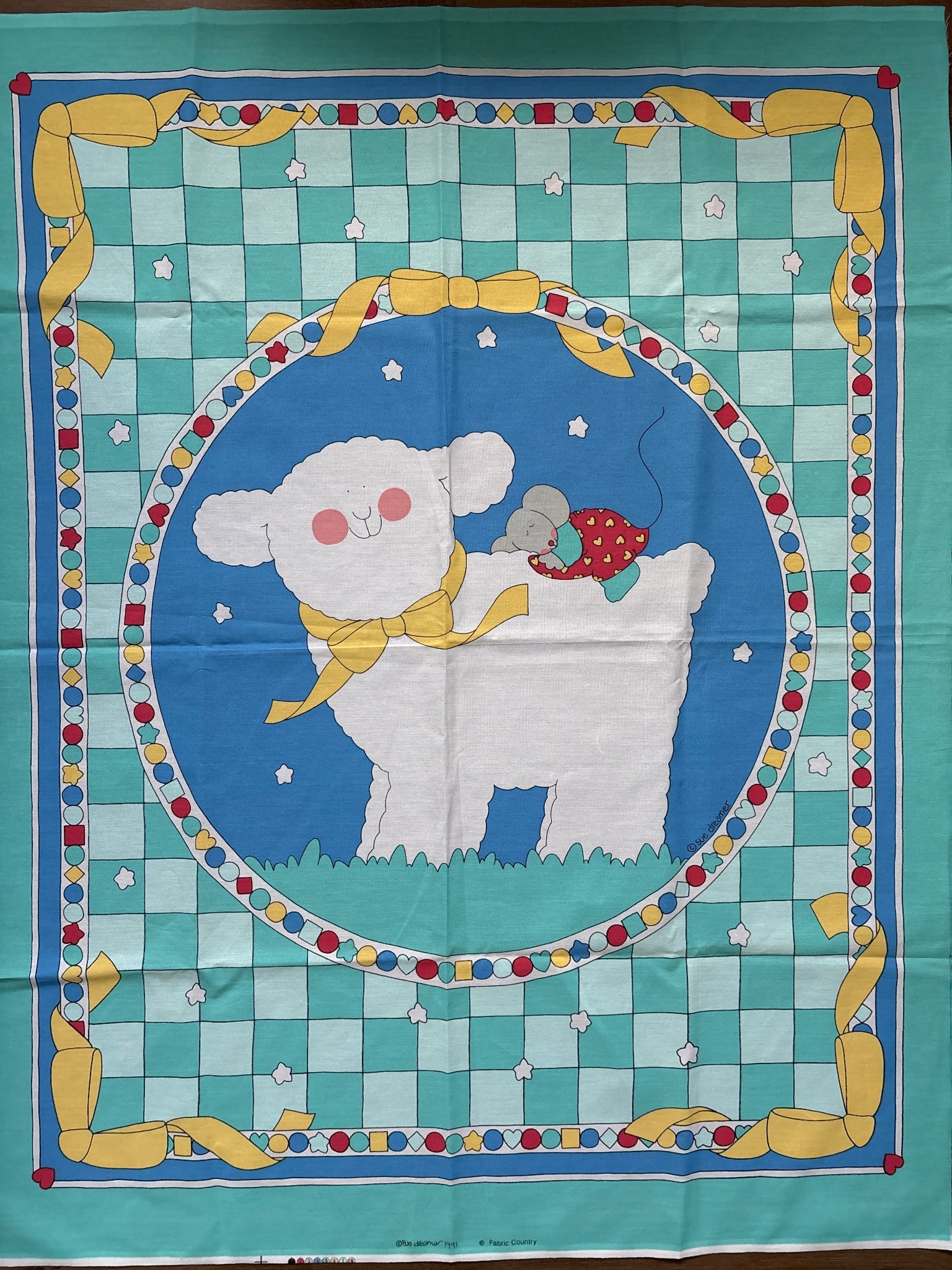 Vintage child's quilt panel featuring a mouse and sheep worth bright colors and shapes. I have 3 of these available in varying sizes. When I say varying it's about 1/4- 1/2 inch due to the panel being trimmed prior to my possession of them. They are all still usable and I ready to be turned into a baby quilt. One has a small spot I will post in the photos. It's hardly noticeable