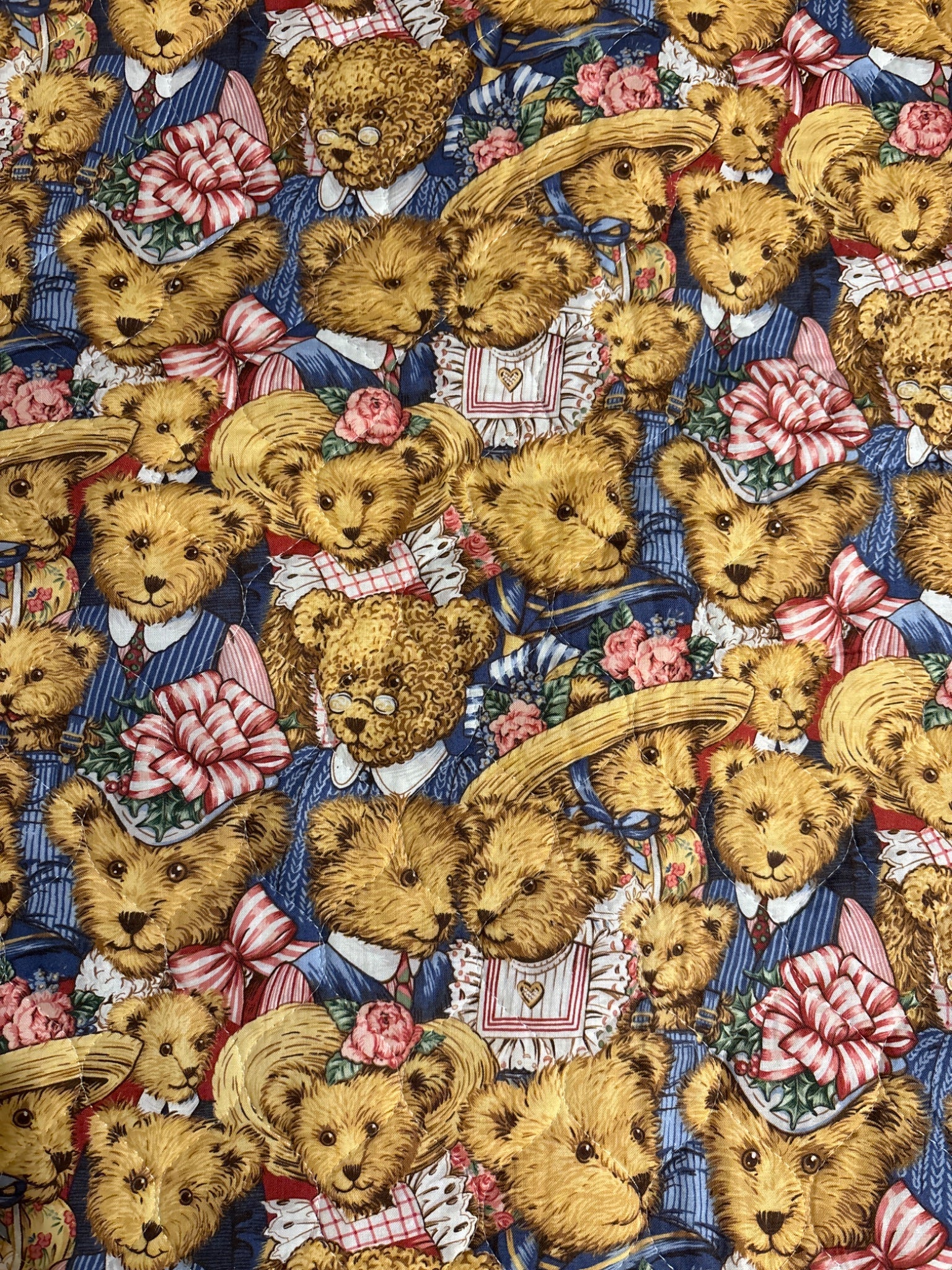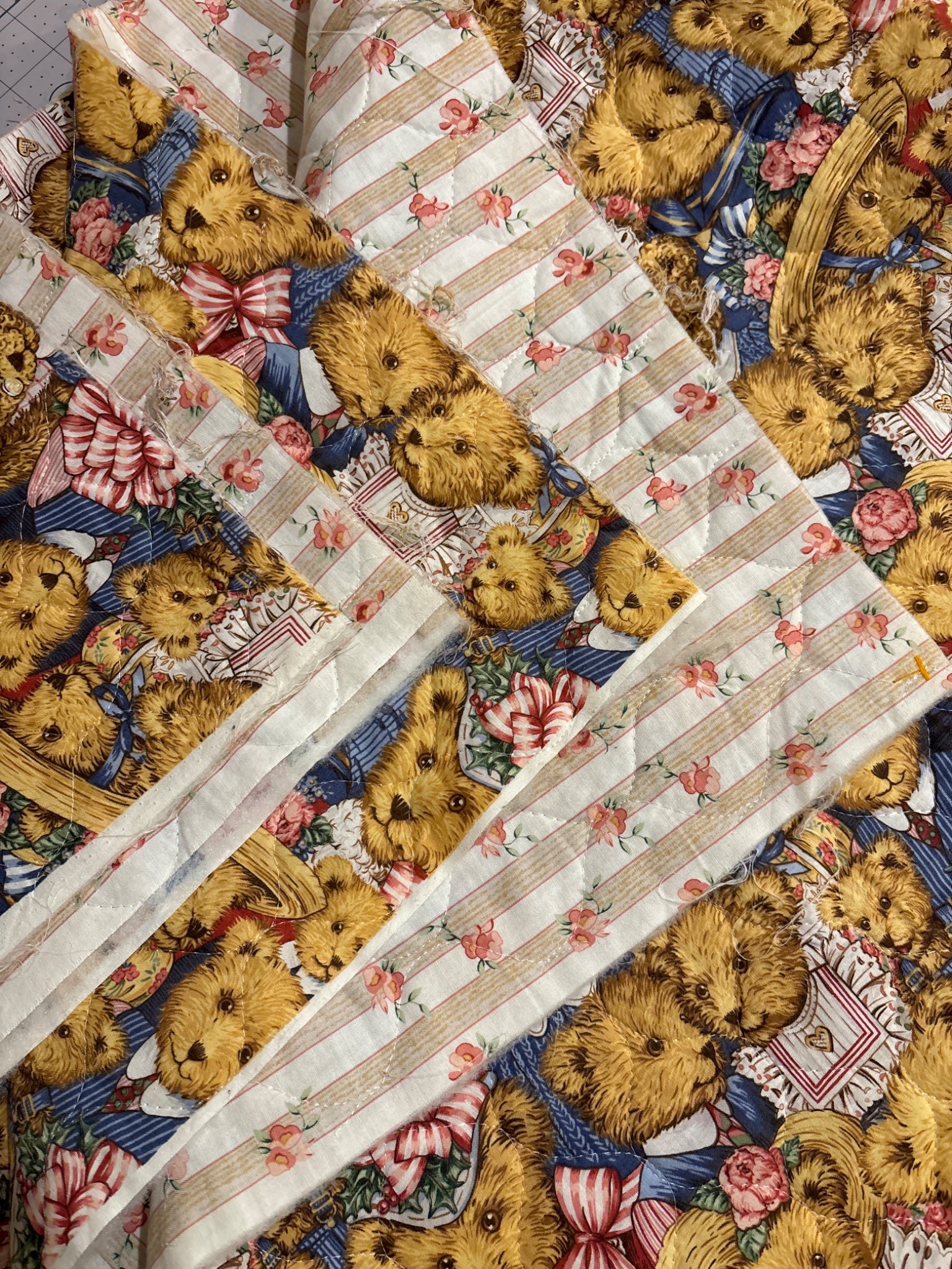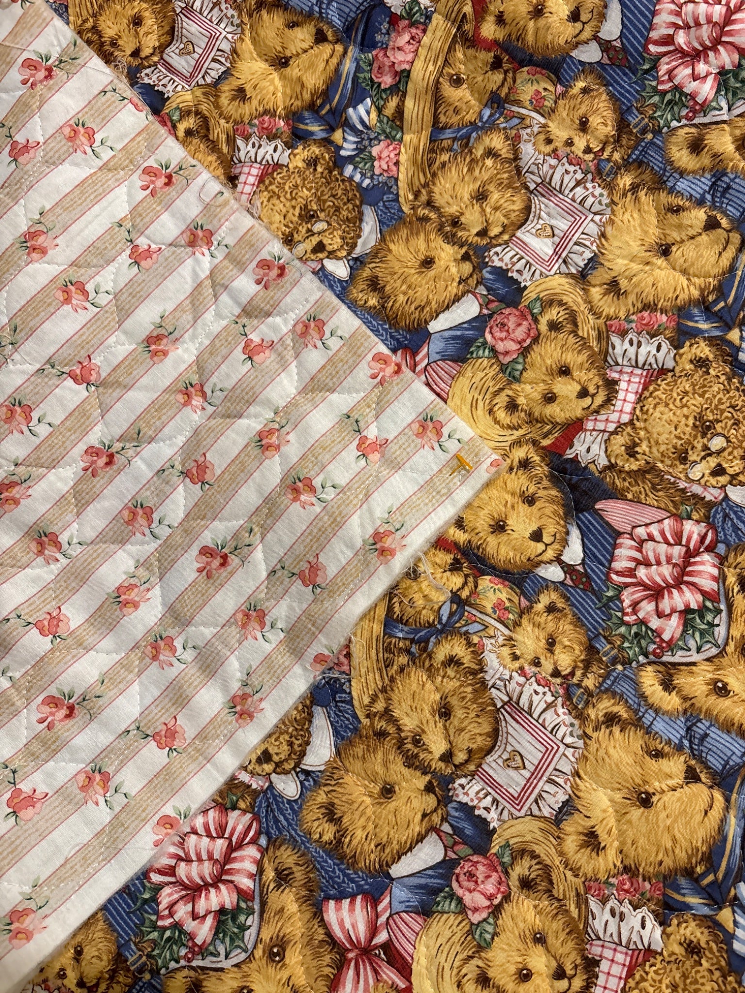 Vintage 1995 quilt pattern by Linda Griffith. This pattern features bears on one side and striped floral design on the other. Measures 44 x 45 inches, has batting seen in and just needs binding to finish.