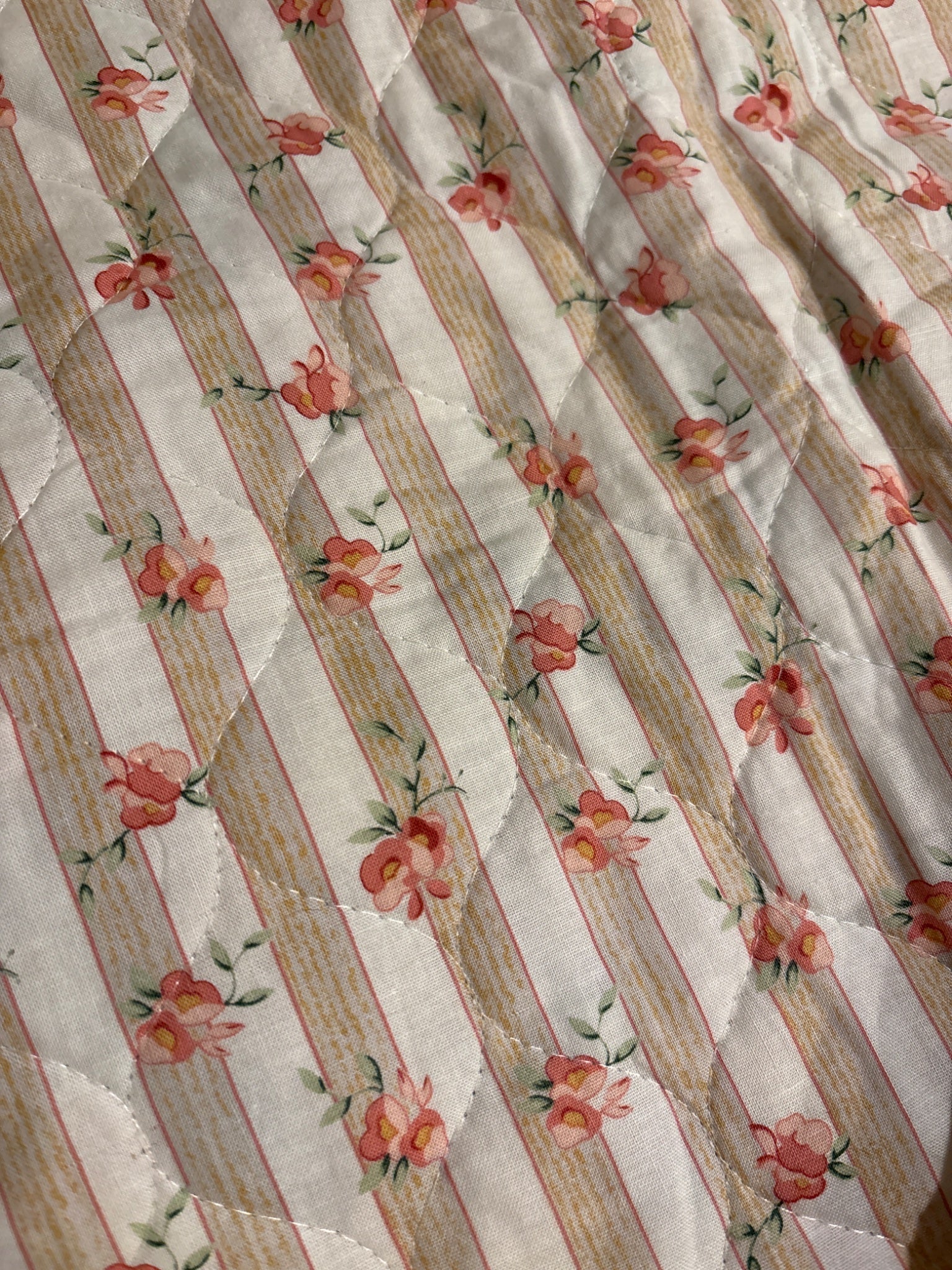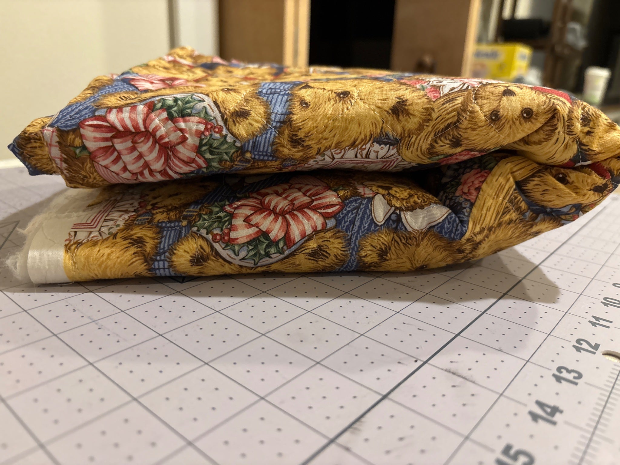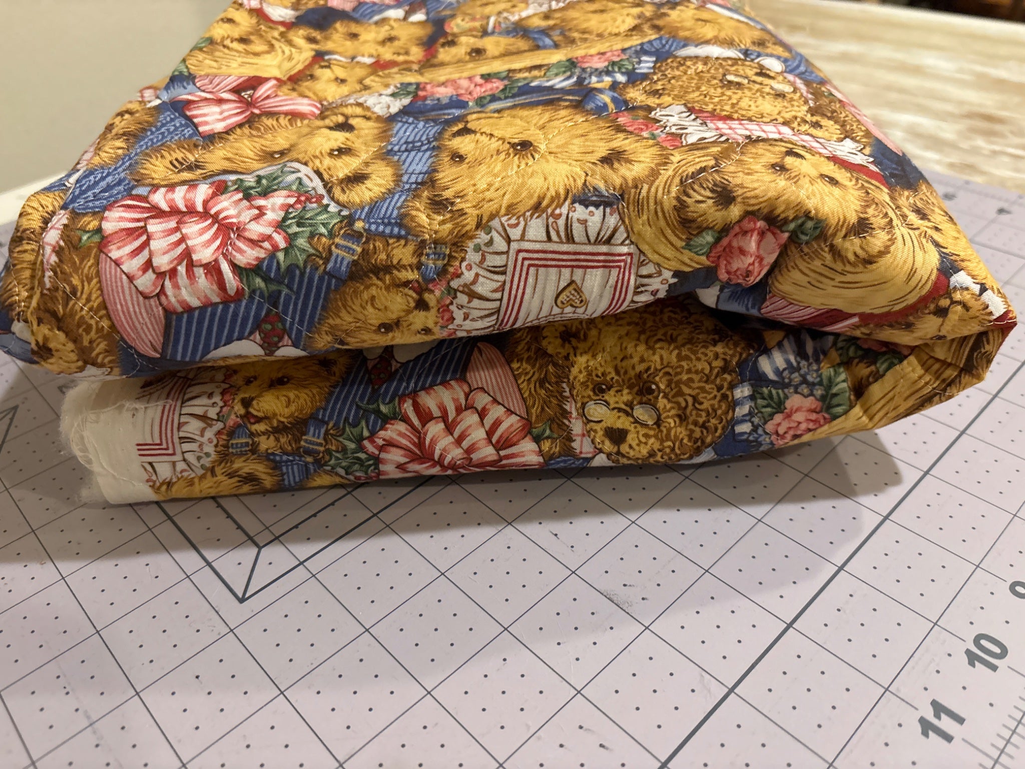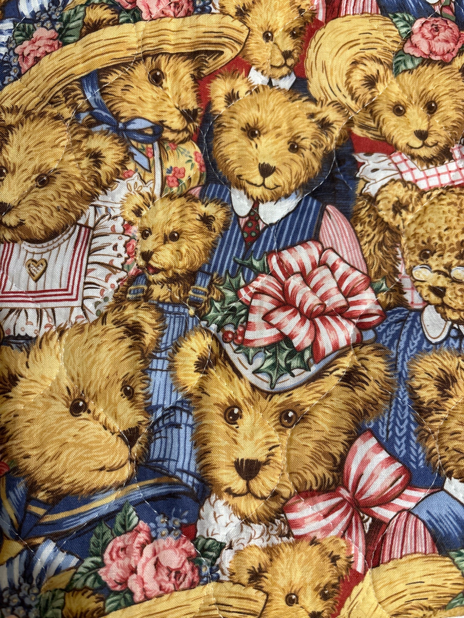 Vintage 1995 quilt pattern by Linda Griffith. This pattern features bears on one side and striped floral design on the other. Measures 44 x 45 inches, has batting seen in and just needs binding to finish.