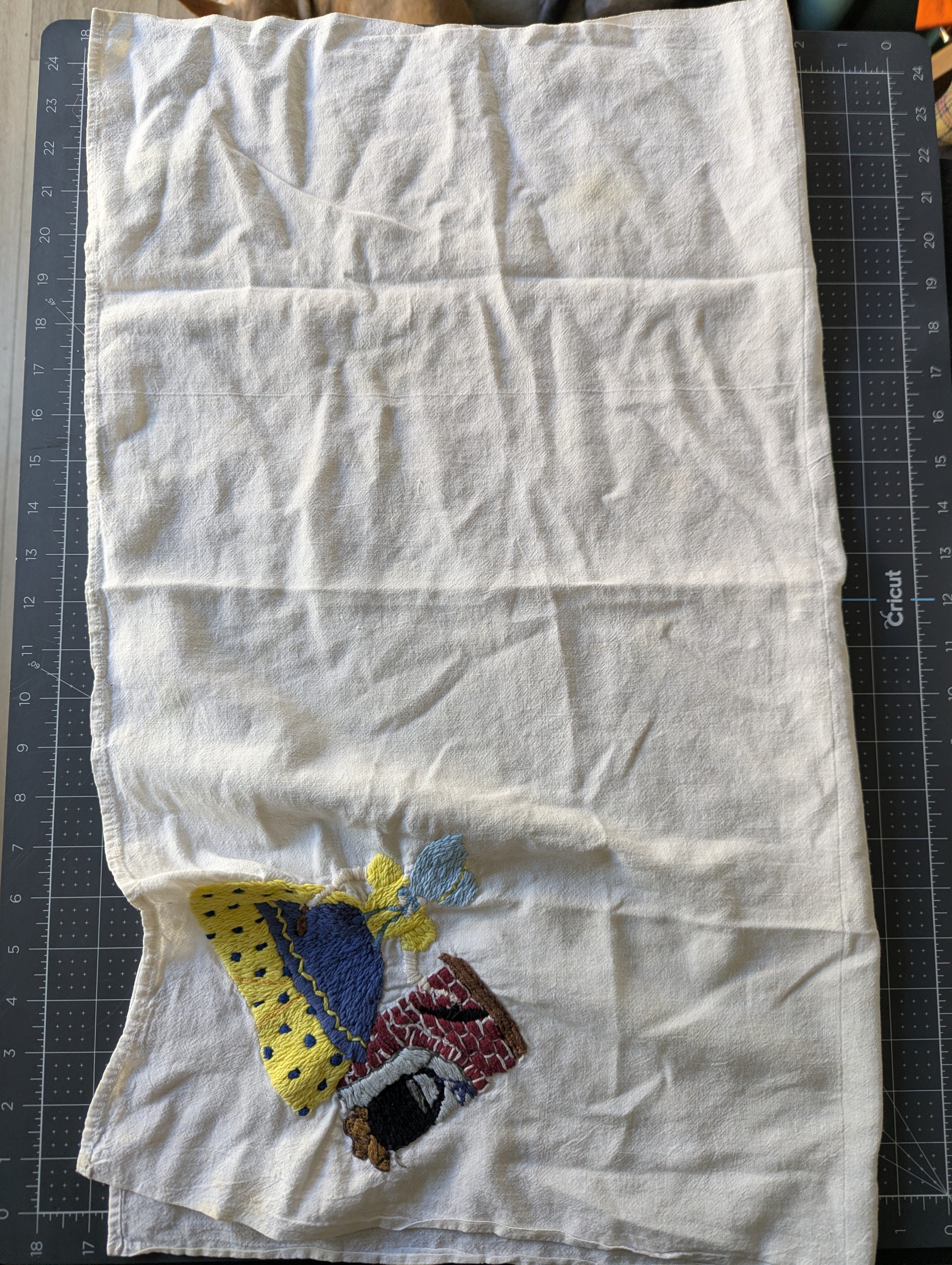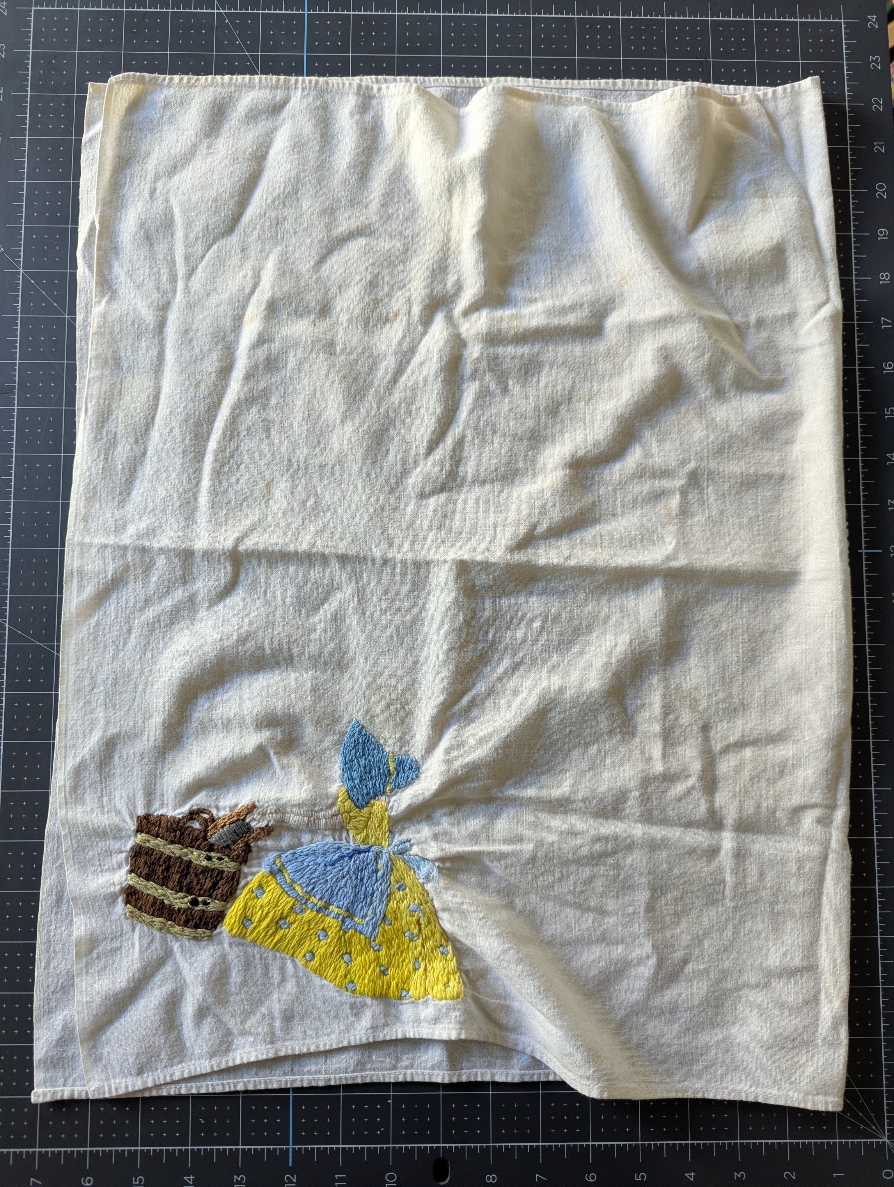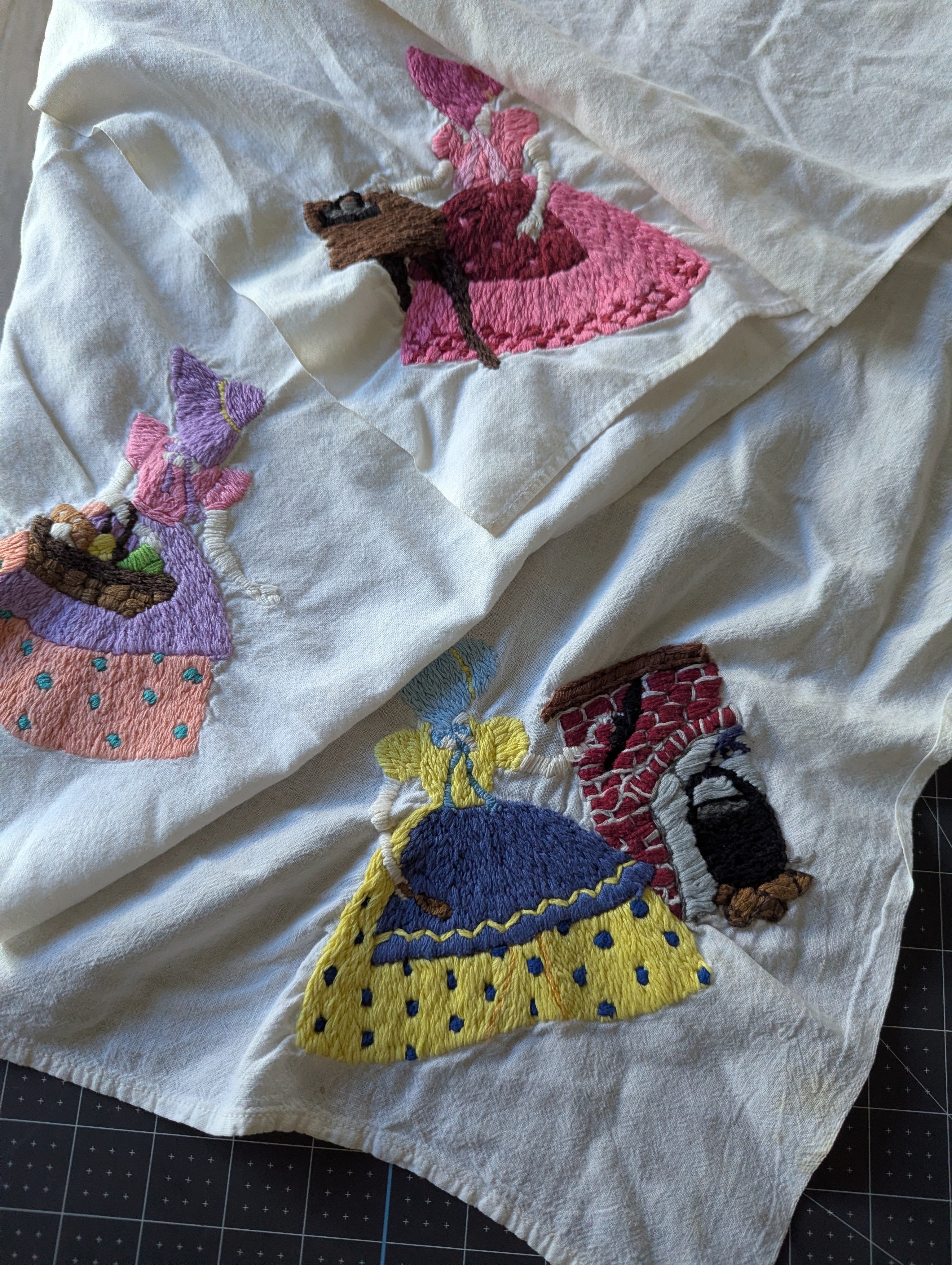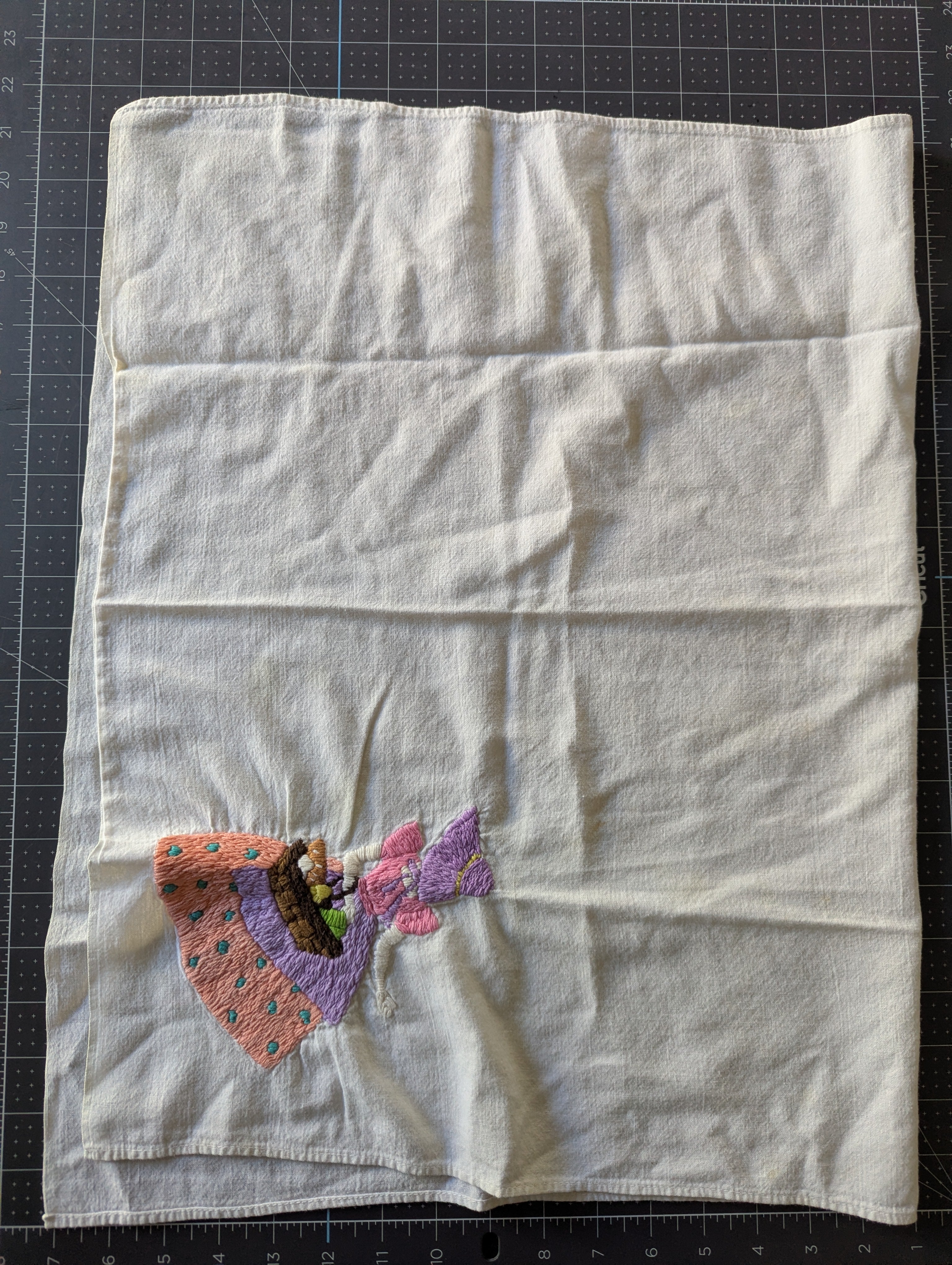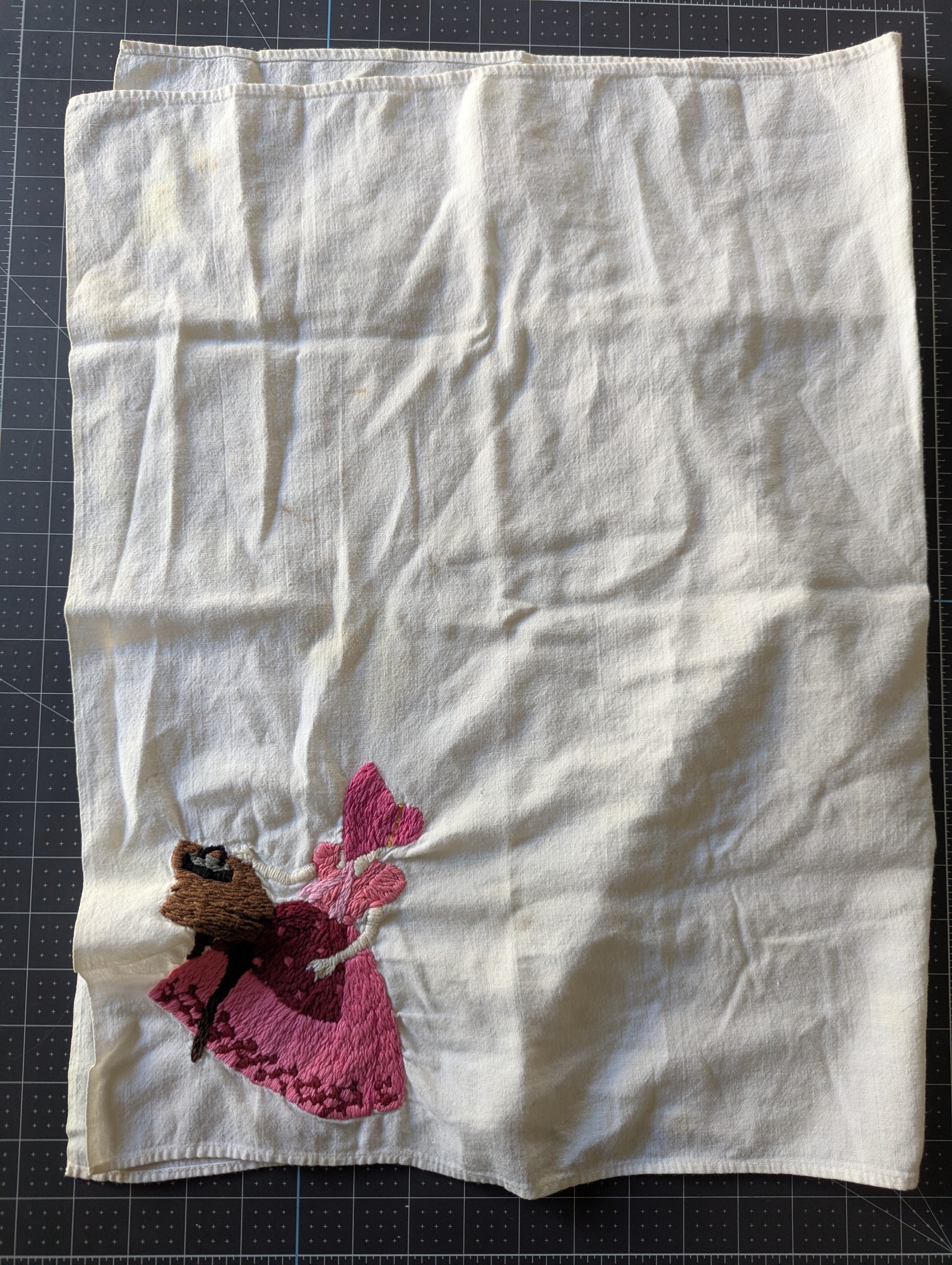 Towels are in poor condition, with spots and stains. Embroidered area seems mostly clean. Embroidery tugs at the fabric a bit and you can see it bunching slightly. The towels are all slightly different sizes, and are folded on a mat board for size reference. You'll receive all four pieces.