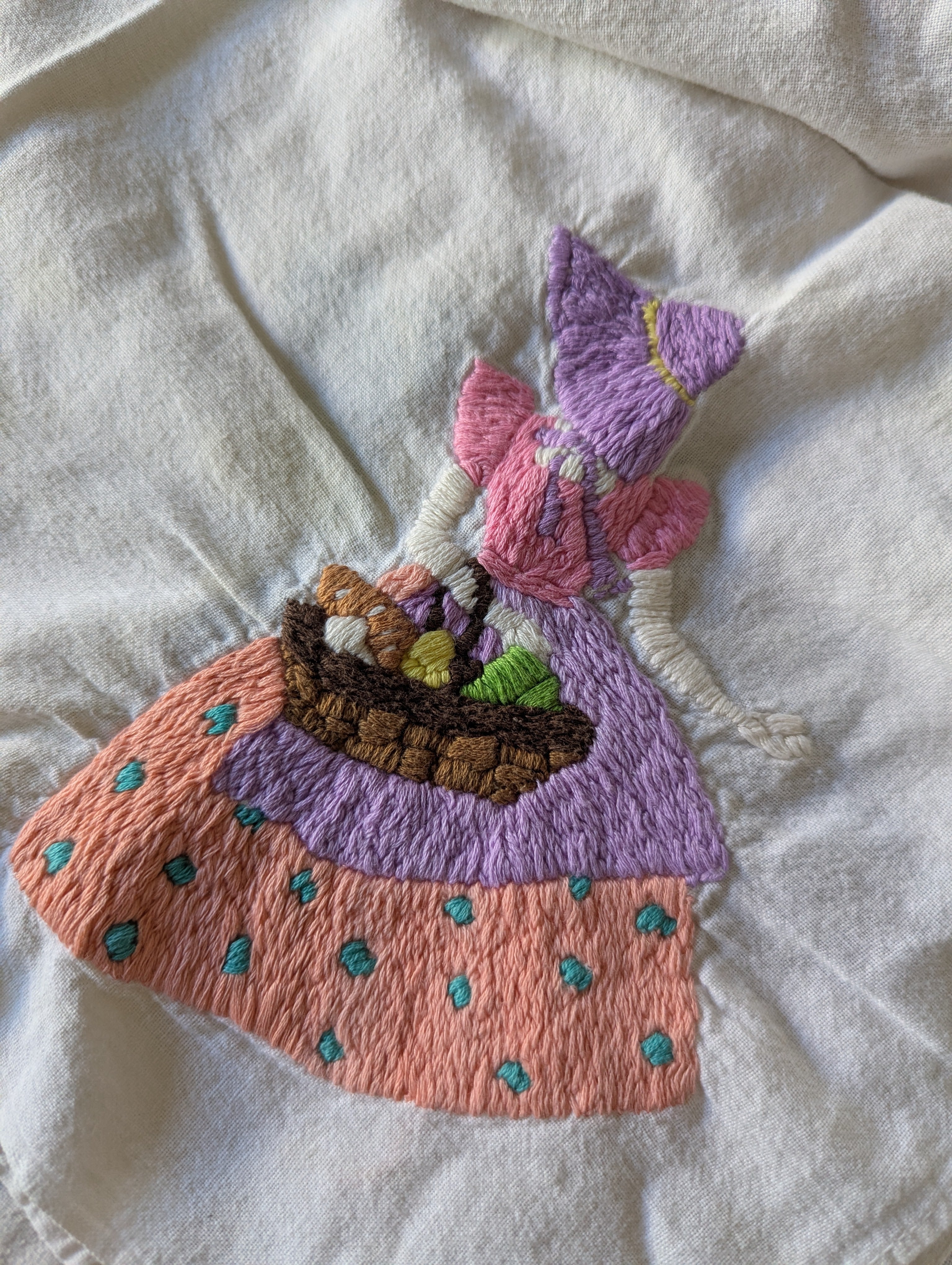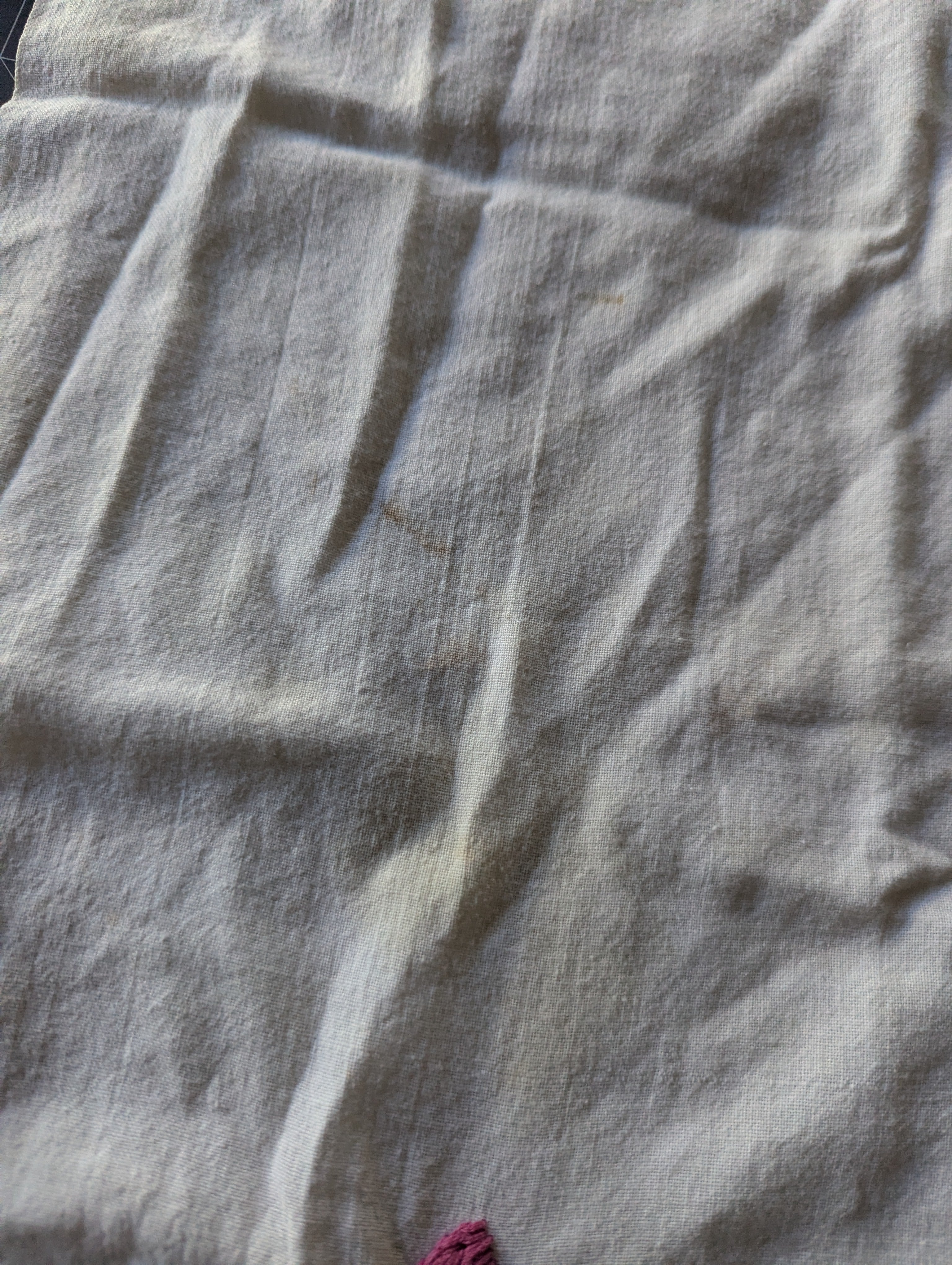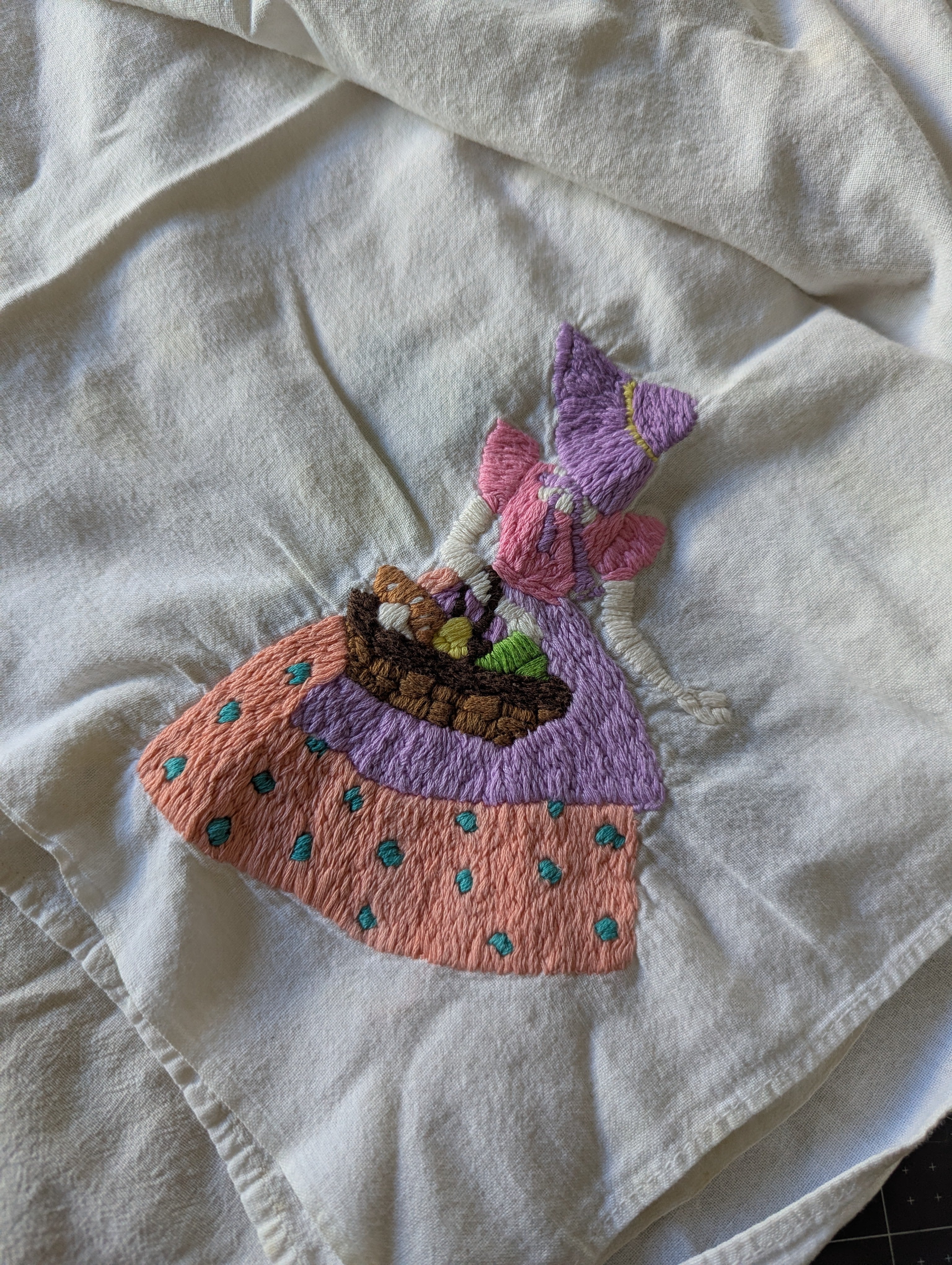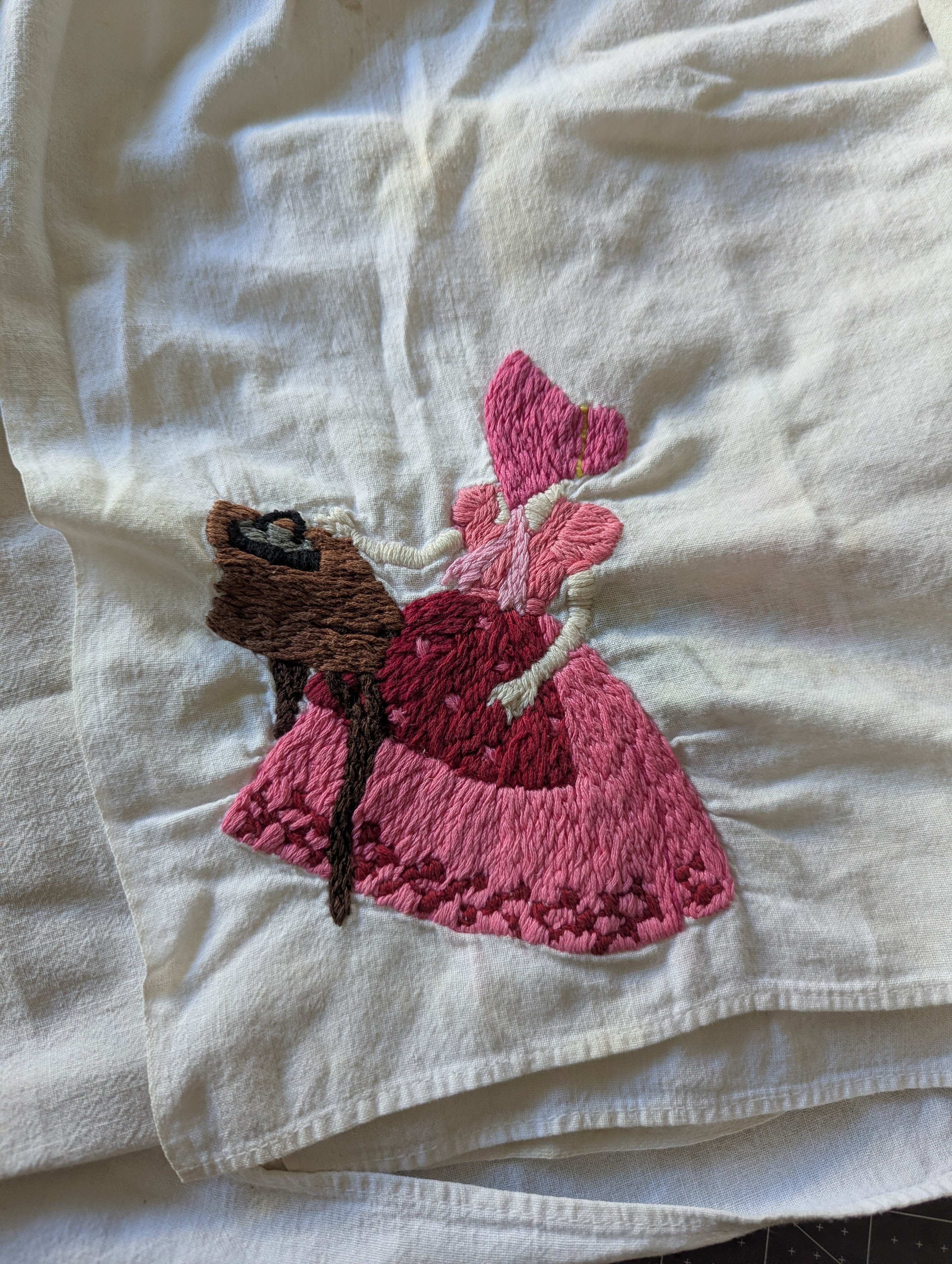 Towels are in poor condition, with spots and stains. Embroidered area seems mostly clean. Embroidery tugs at the fabric a bit and you can see it bunching slightly. The towels are all slightly different sizes, and are folded on a mat board for size reference. You'll receive all four pieces.