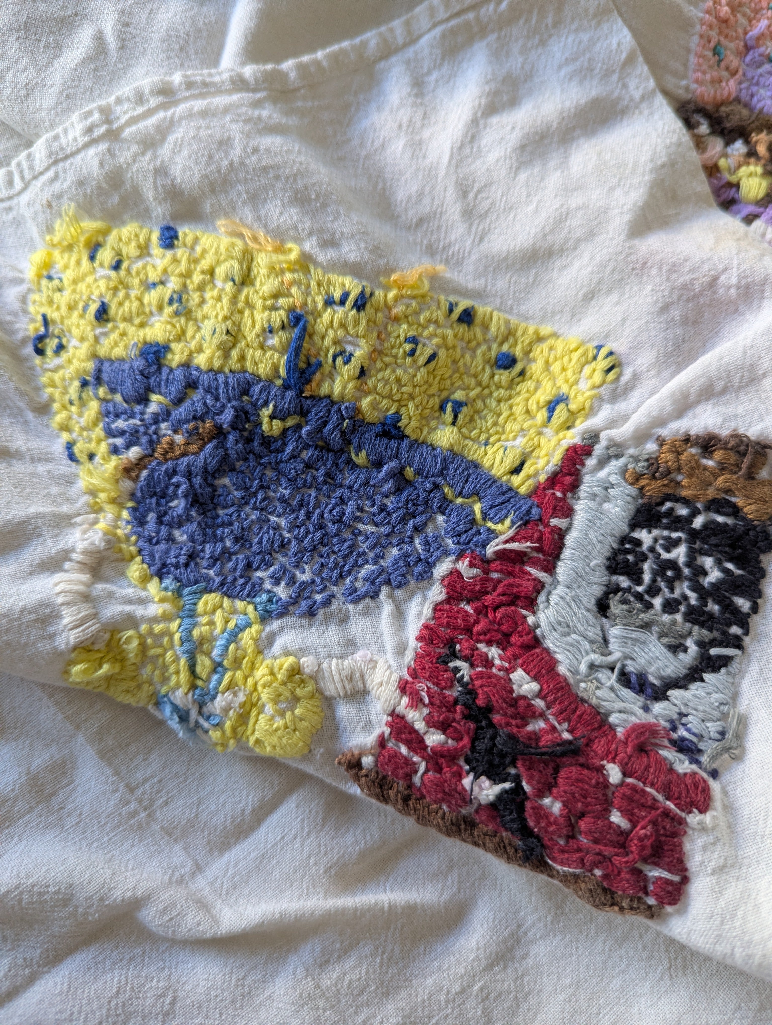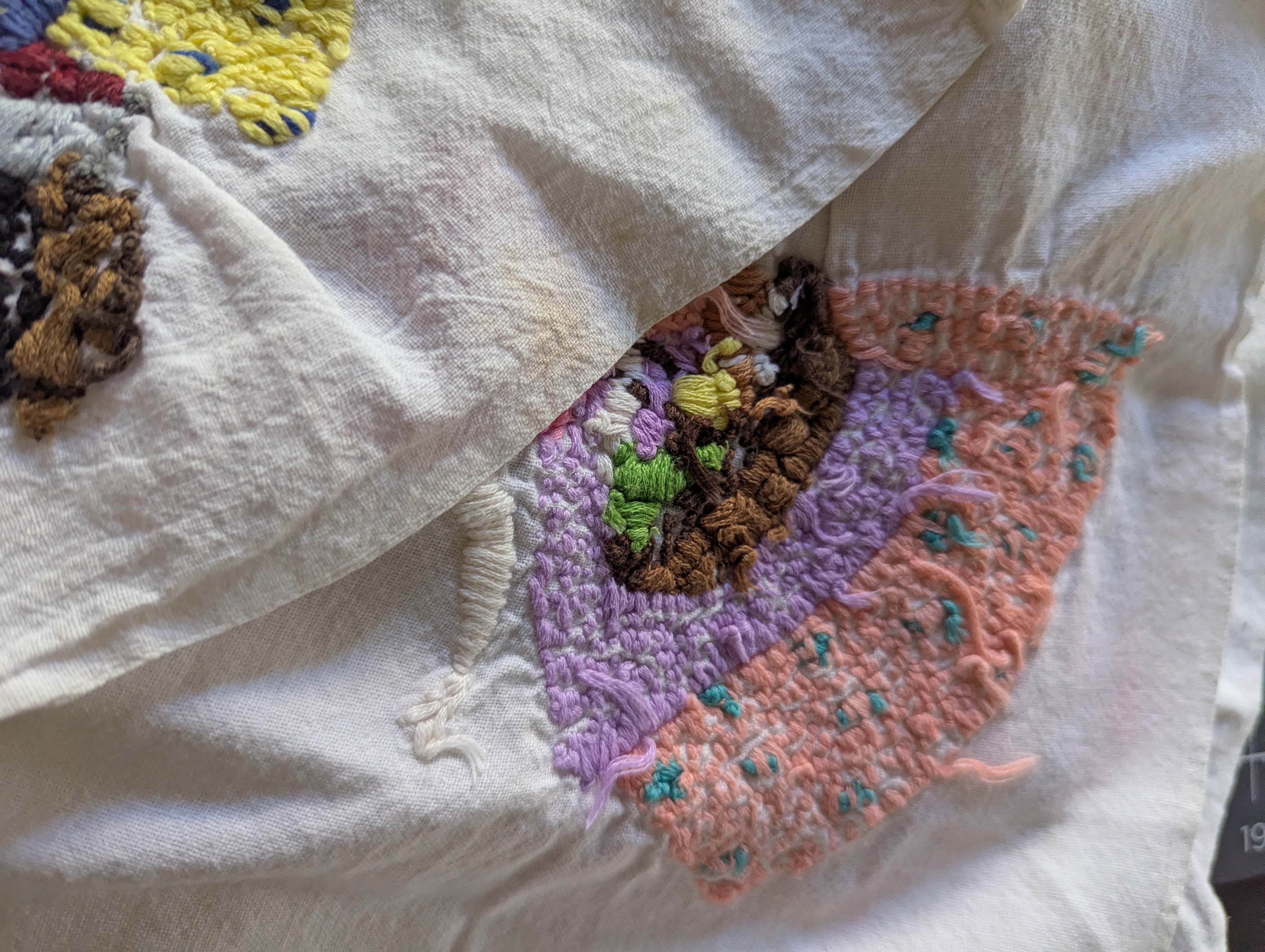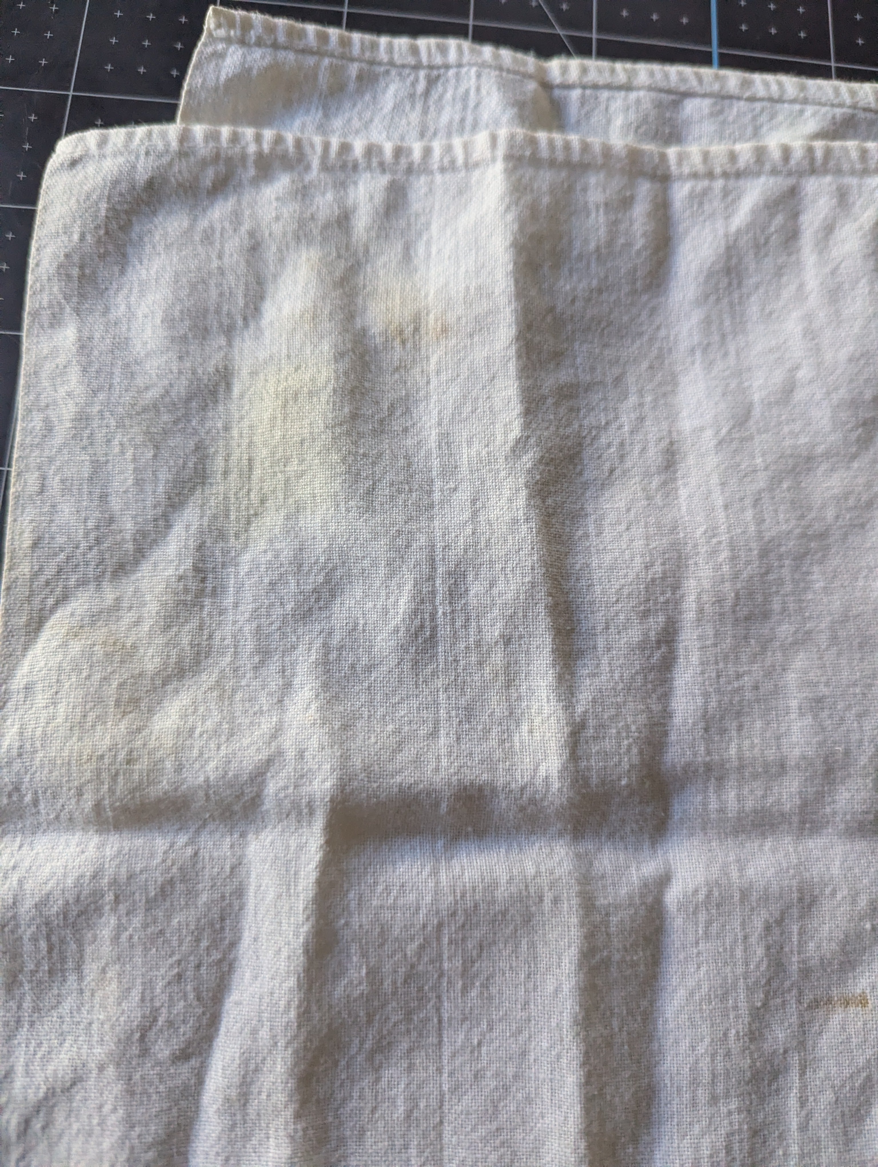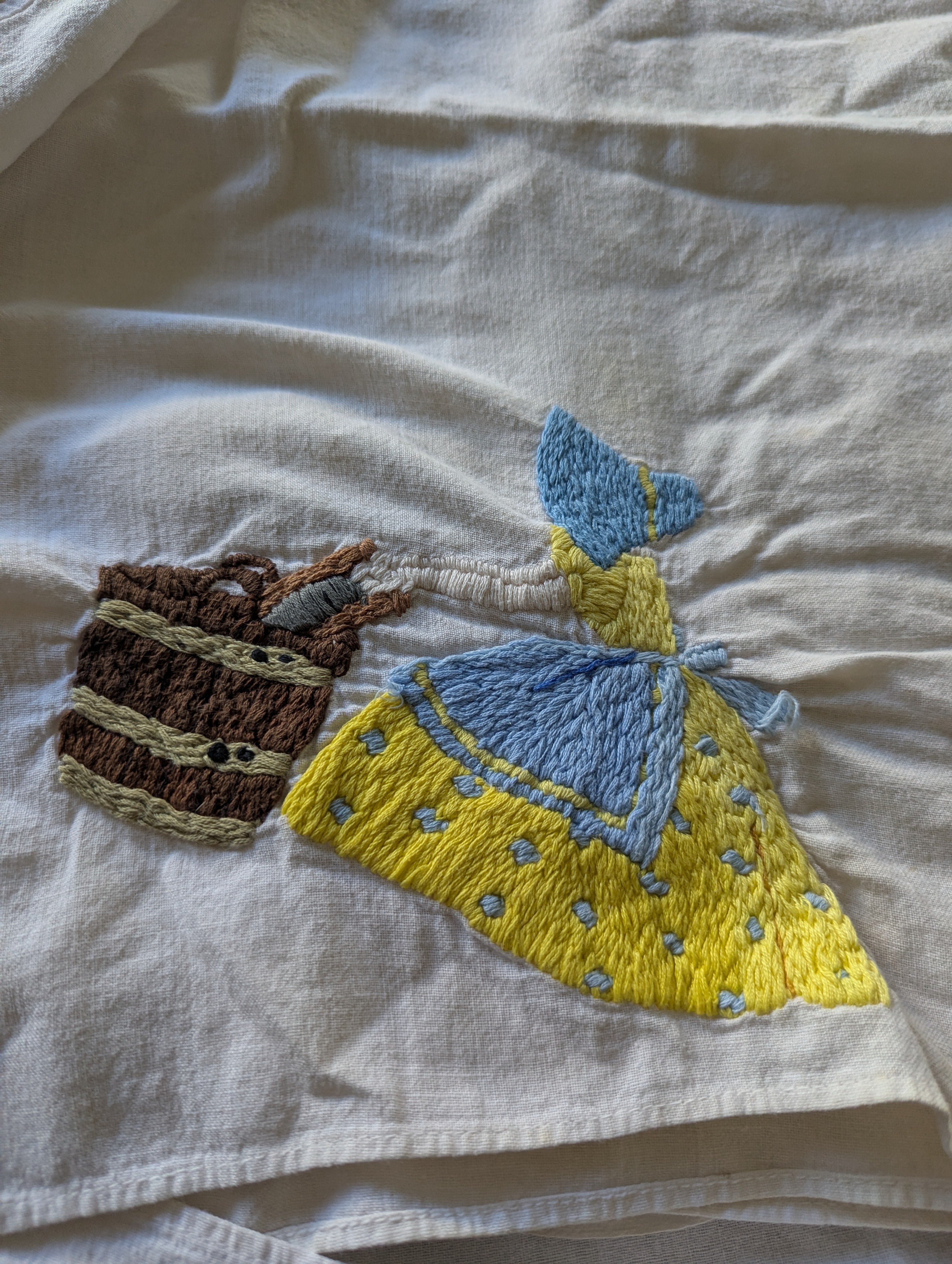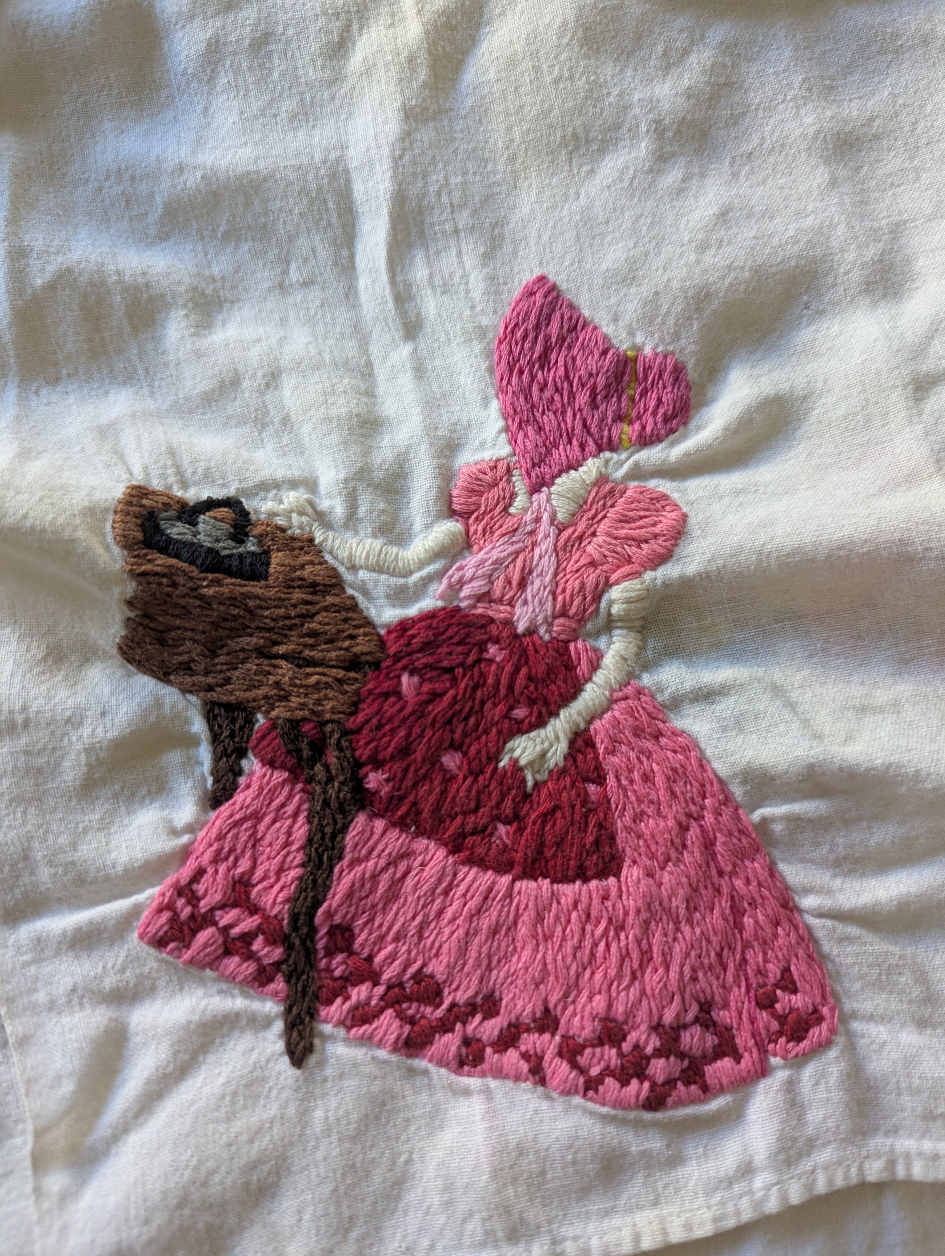 Towels are in poor condition, with spots and stains. Embroidered area seems mostly clean. Embroidery tugs at the fabric a bit and you can see it bunching slightly. The towels are all slightly different sizes, and are folded on a mat board for size reference. You'll receive all four pieces.