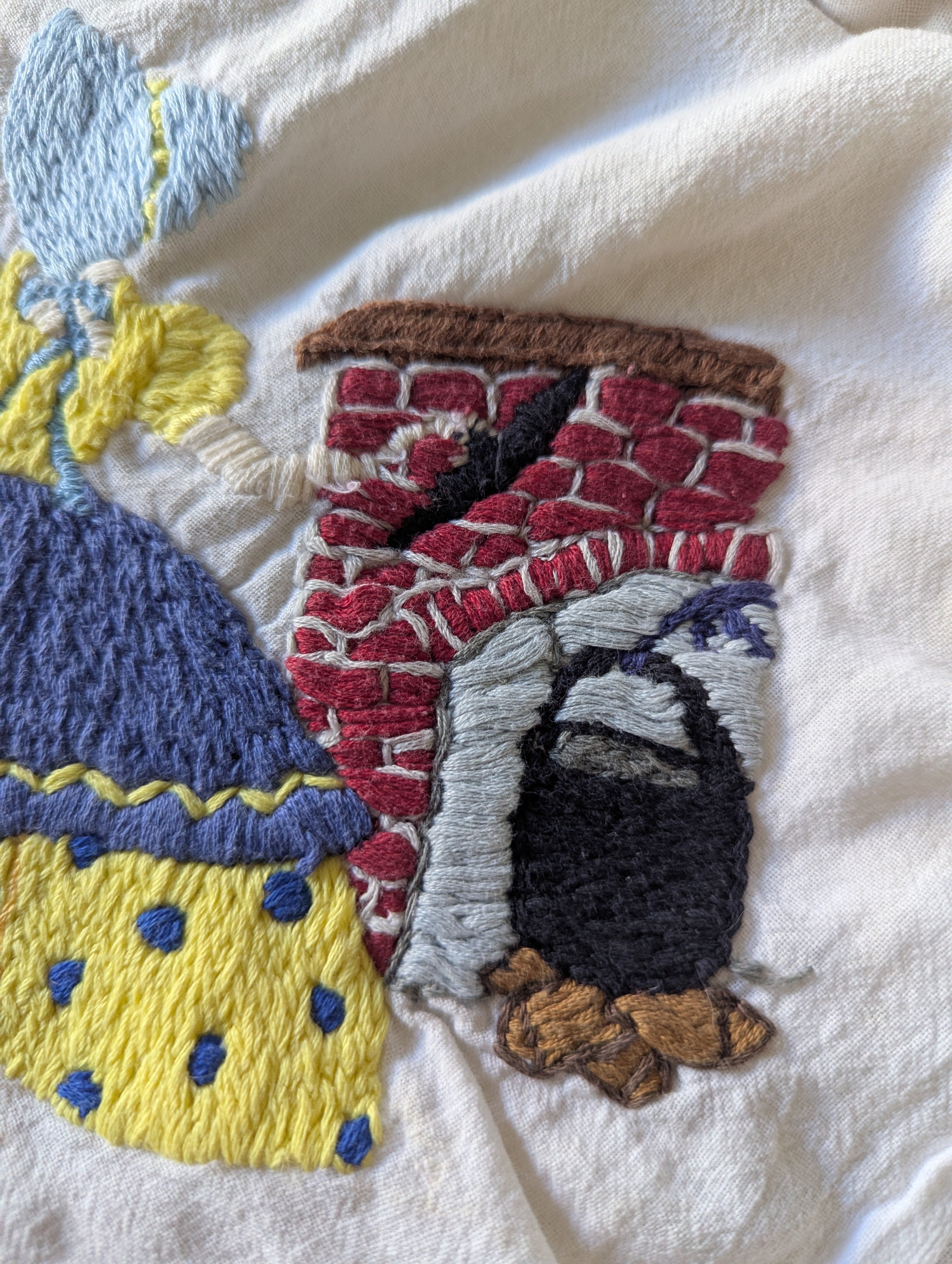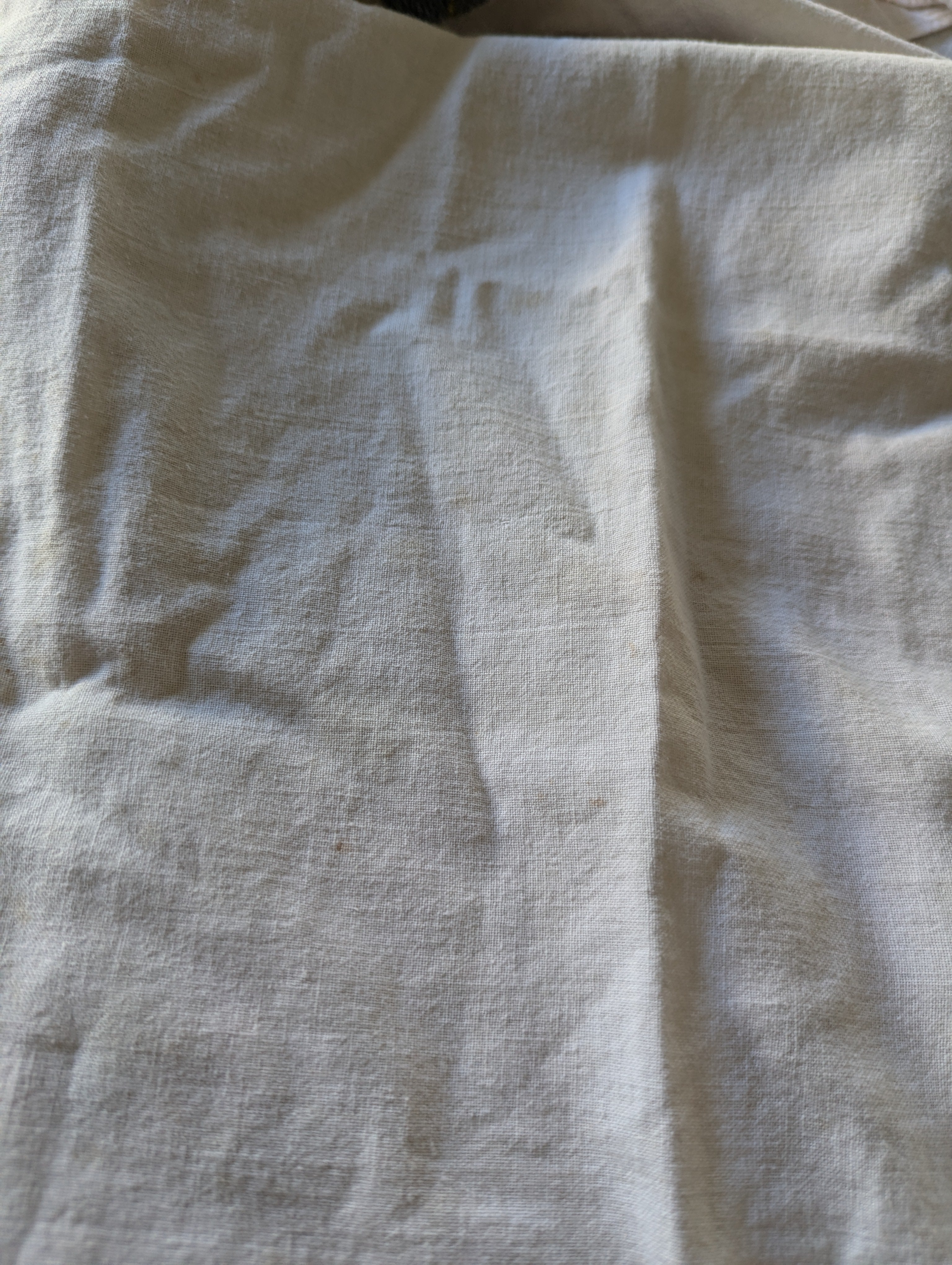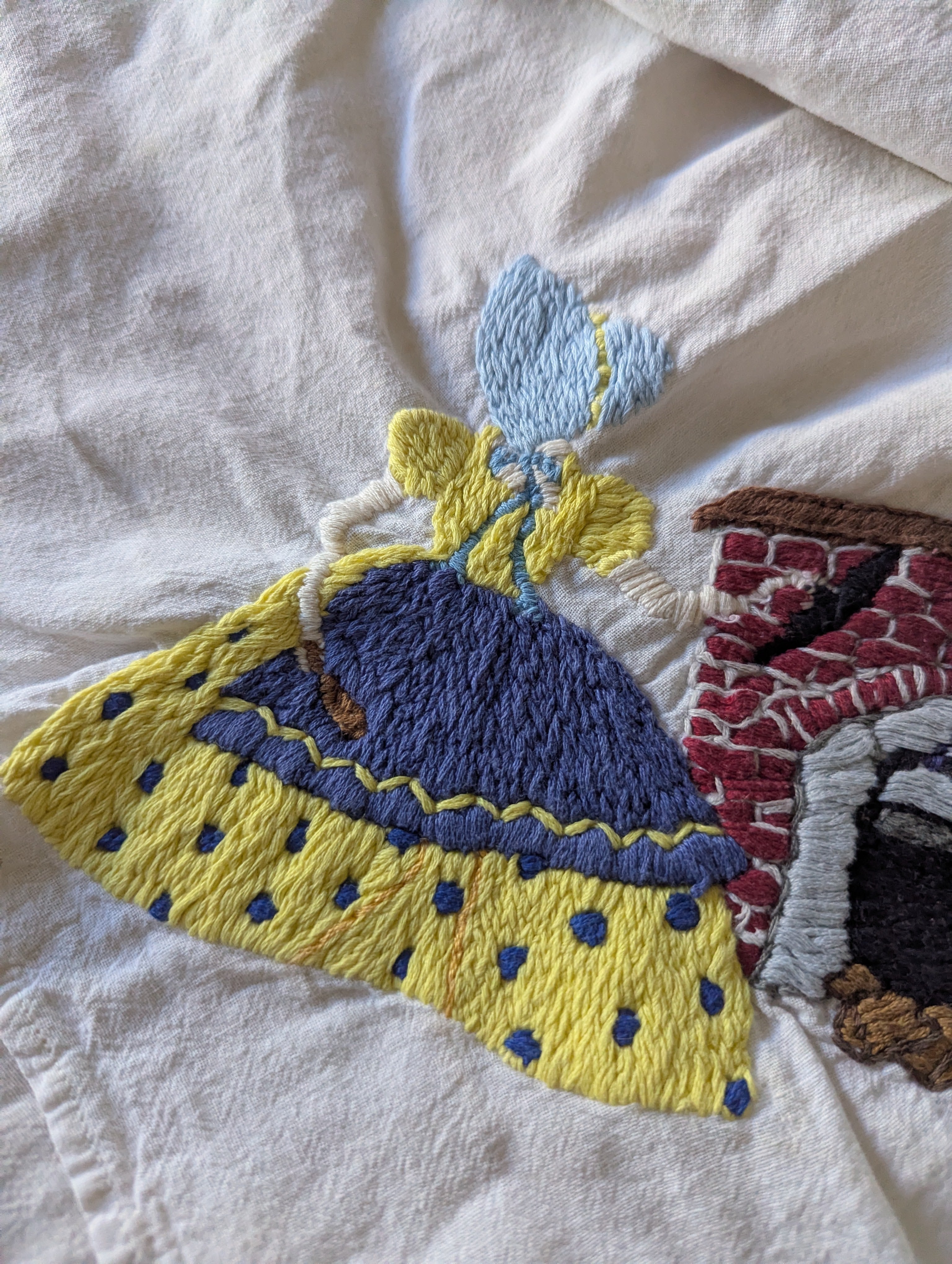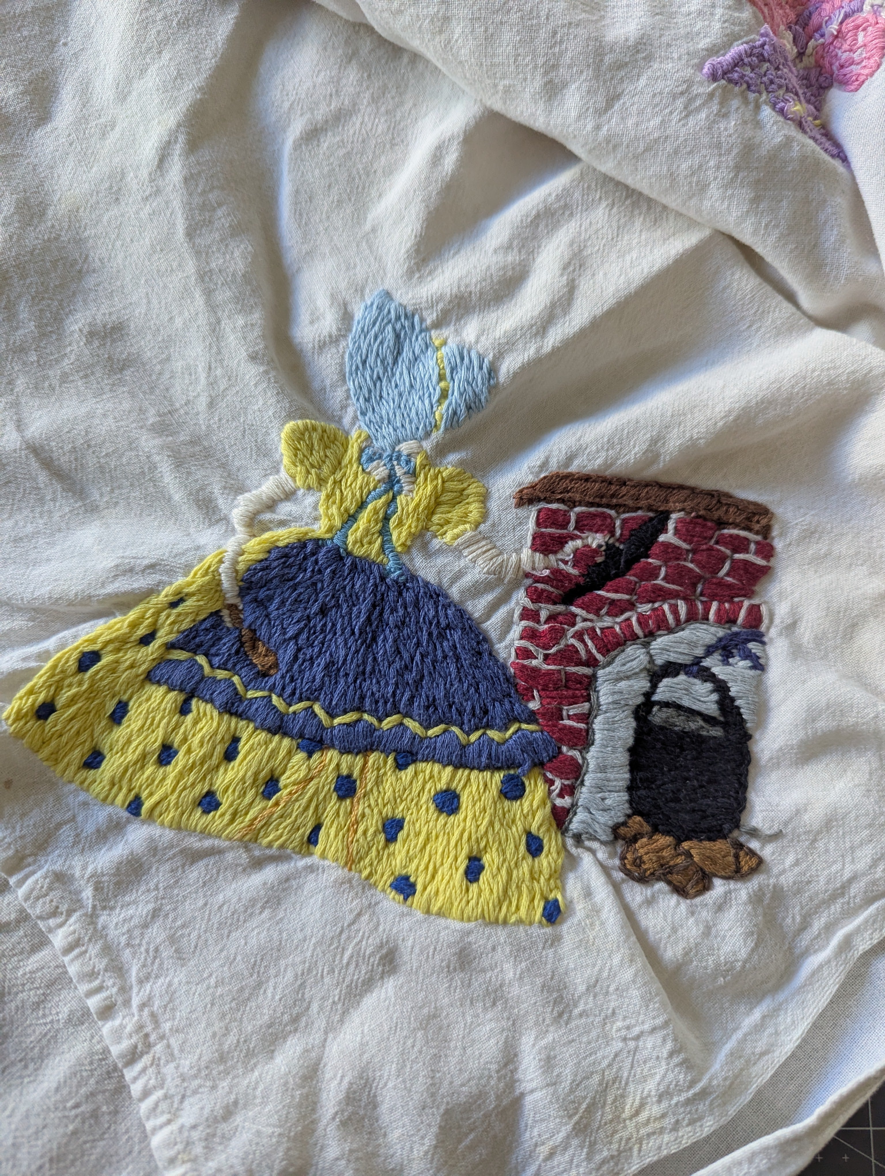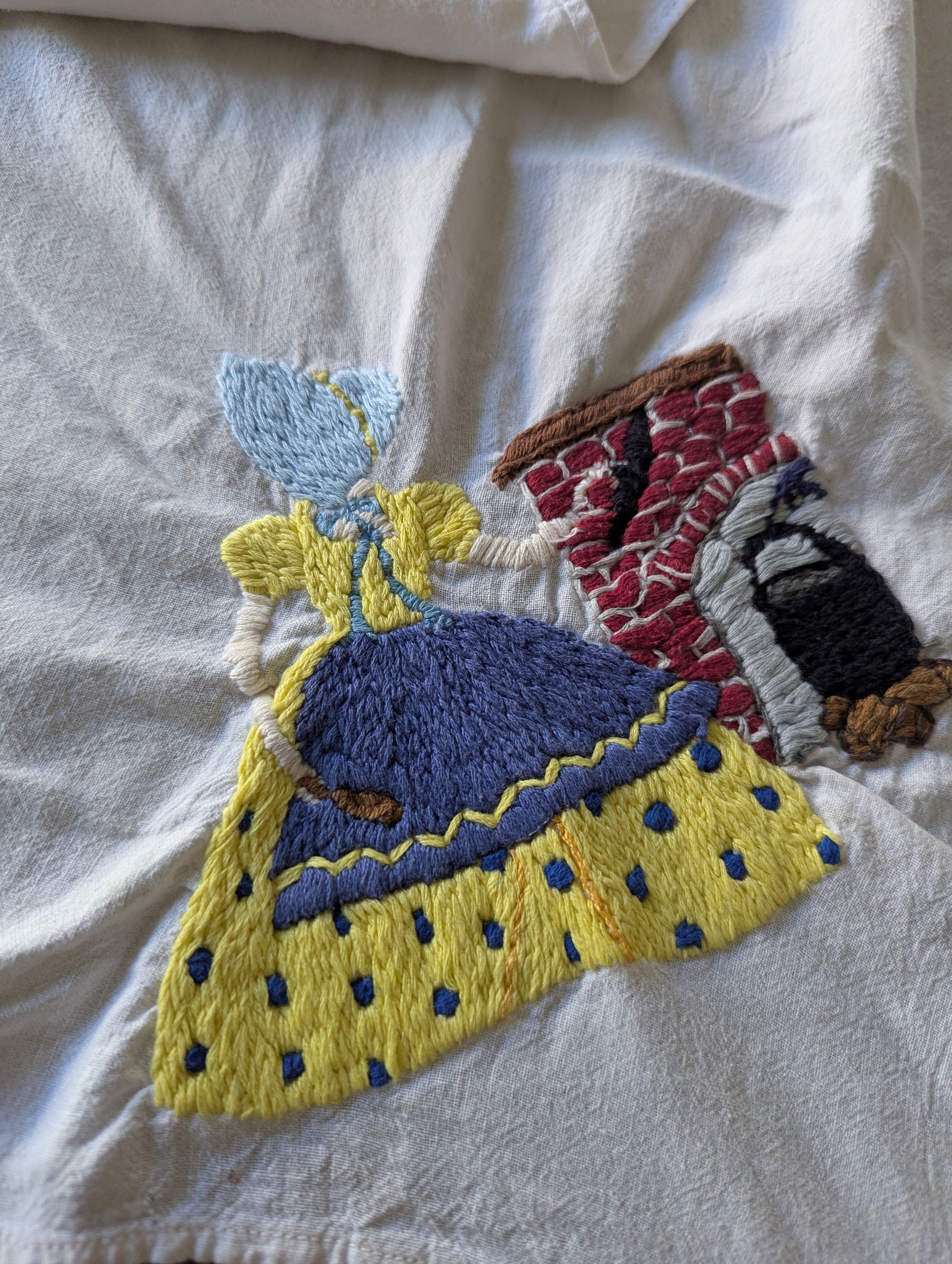 Towels are in poor condition, with spots and stains. Embroidered area seems mostly clean. Embroidery tugs at the fabric a bit and you can see it bunching slightly. The towels are all slightly different sizes, and are folded on a mat board for size reference. You'll receive all four pieces.