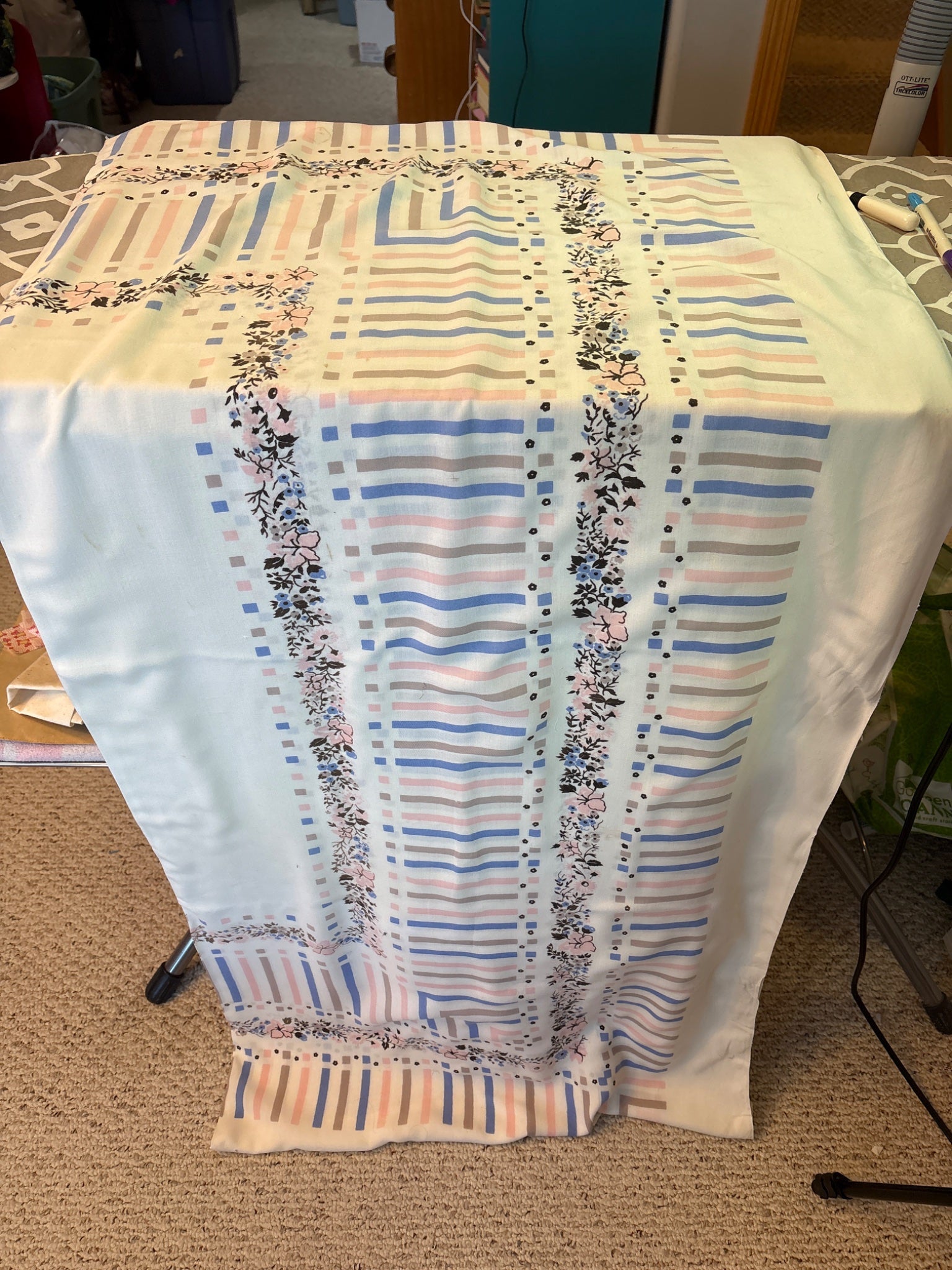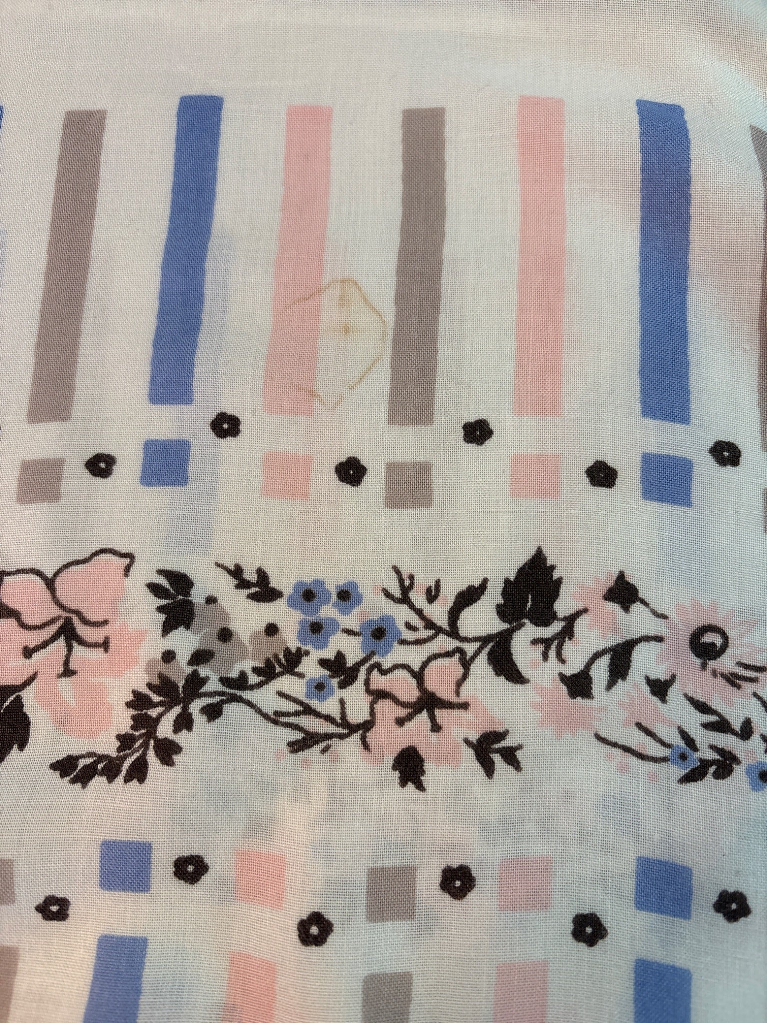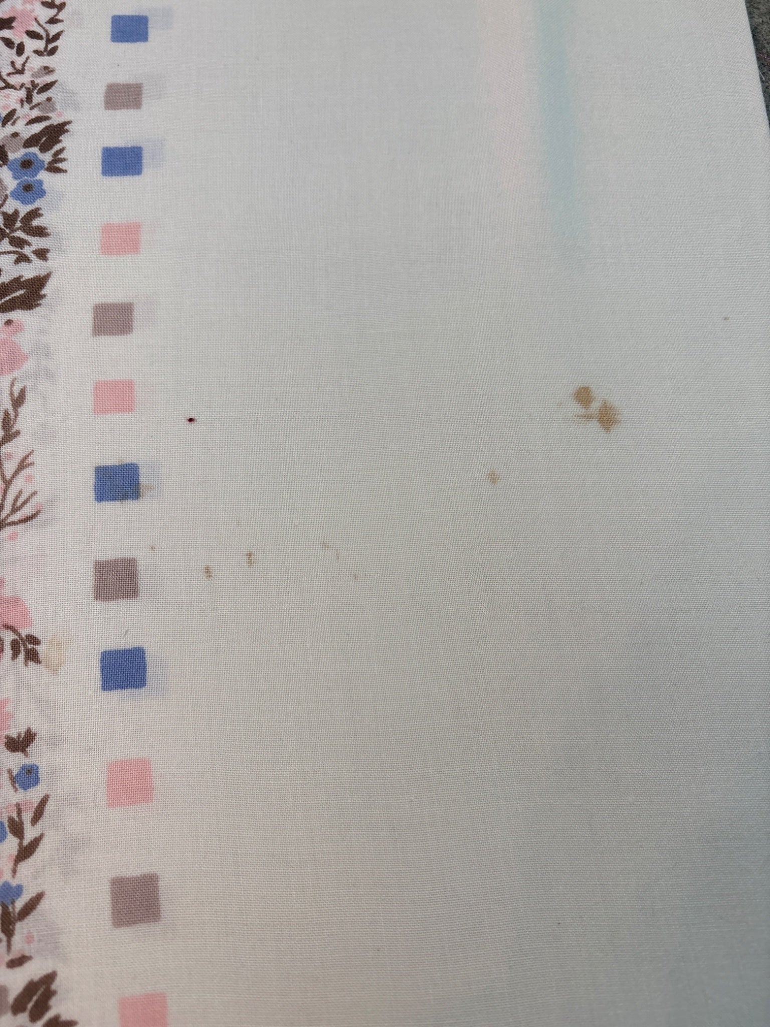 Vintage tablecloth 52" x 60" washed and ironed, some spots, soft and flowing would make a nice blouse or little girls dress. Likely cotton and rayon or some other synthetic