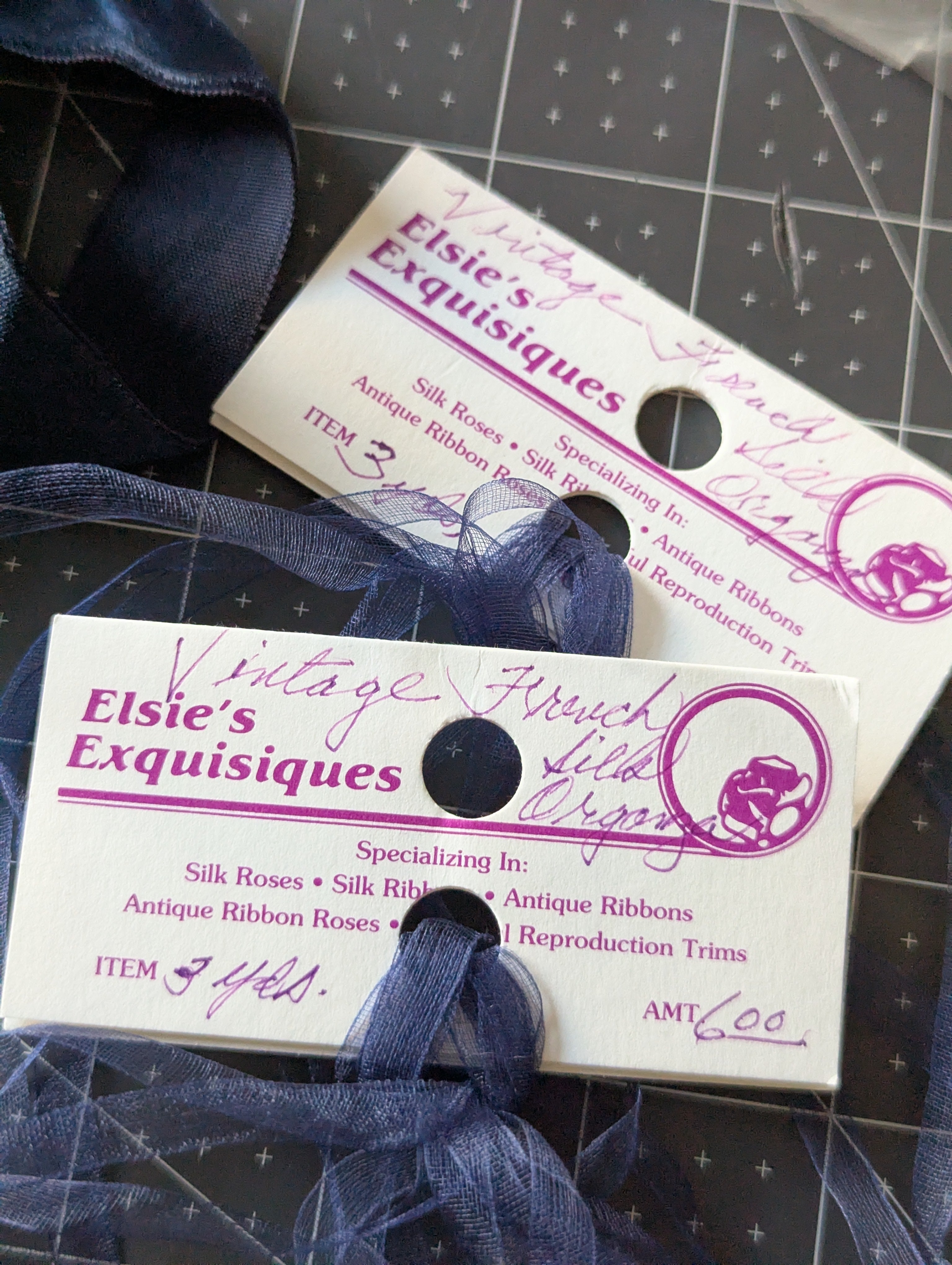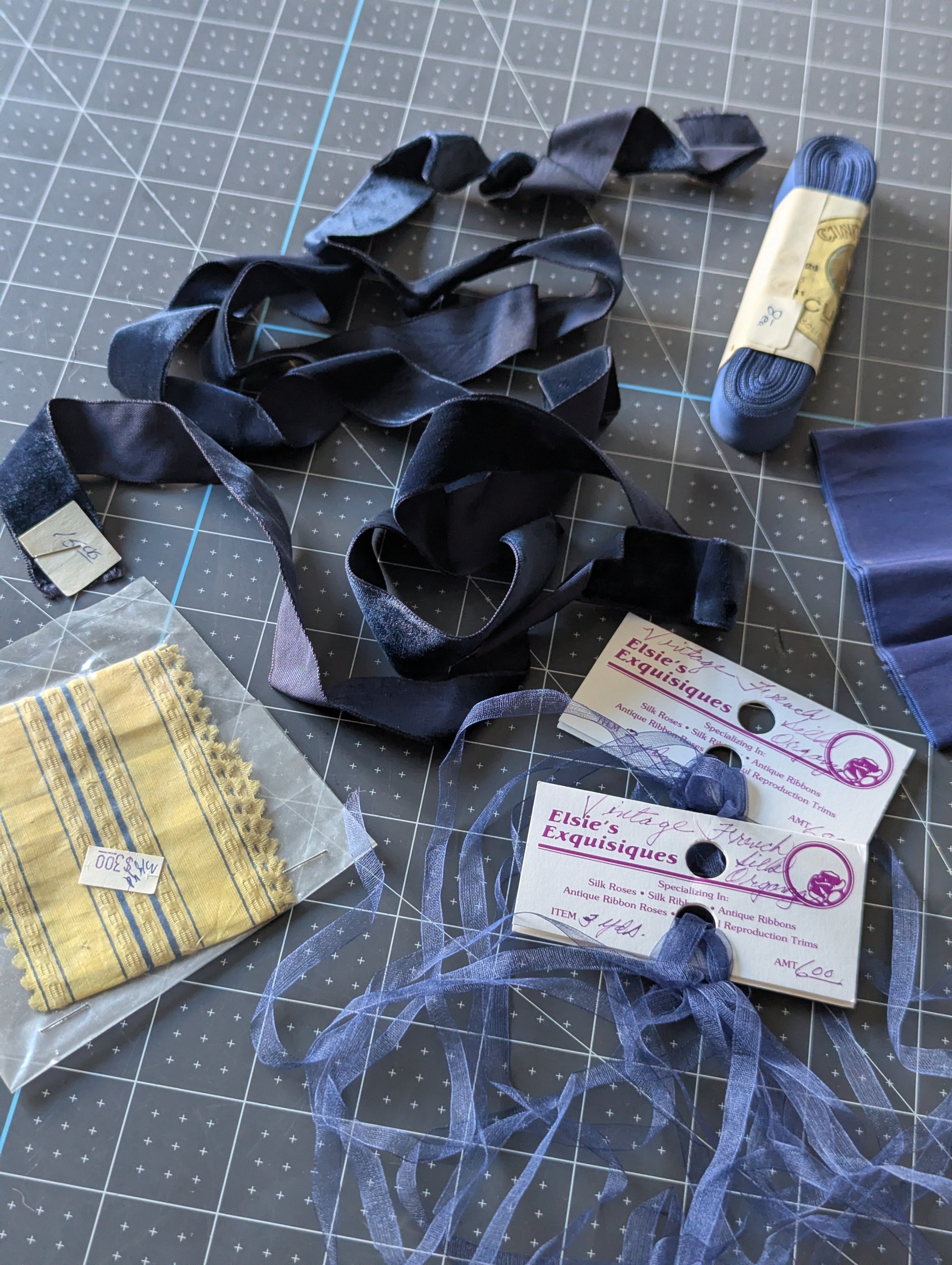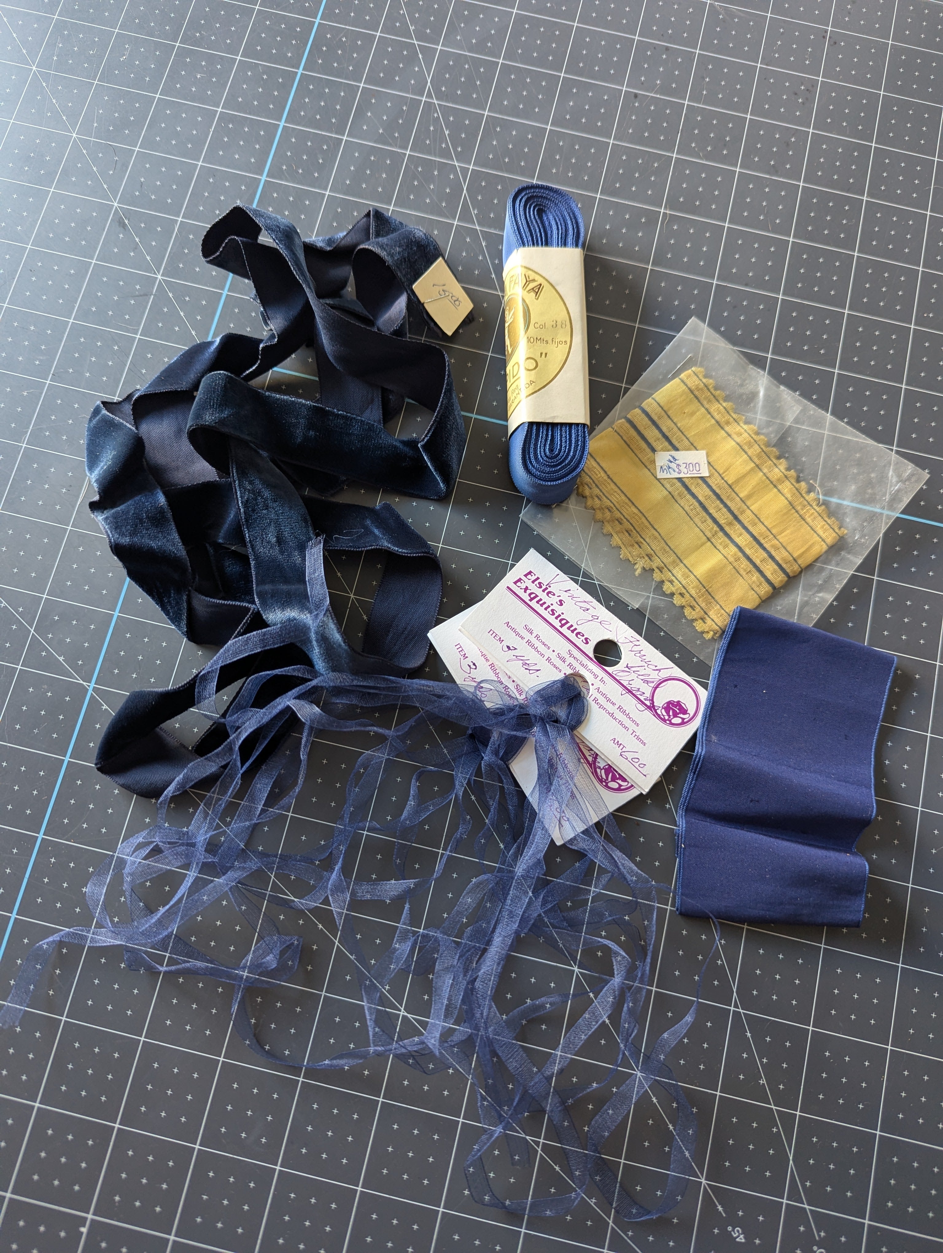Includes all pictured trim. A variety of shades and textures of navy blues. These were not labeled by us. We have not confirmed yardage on any ribbons.