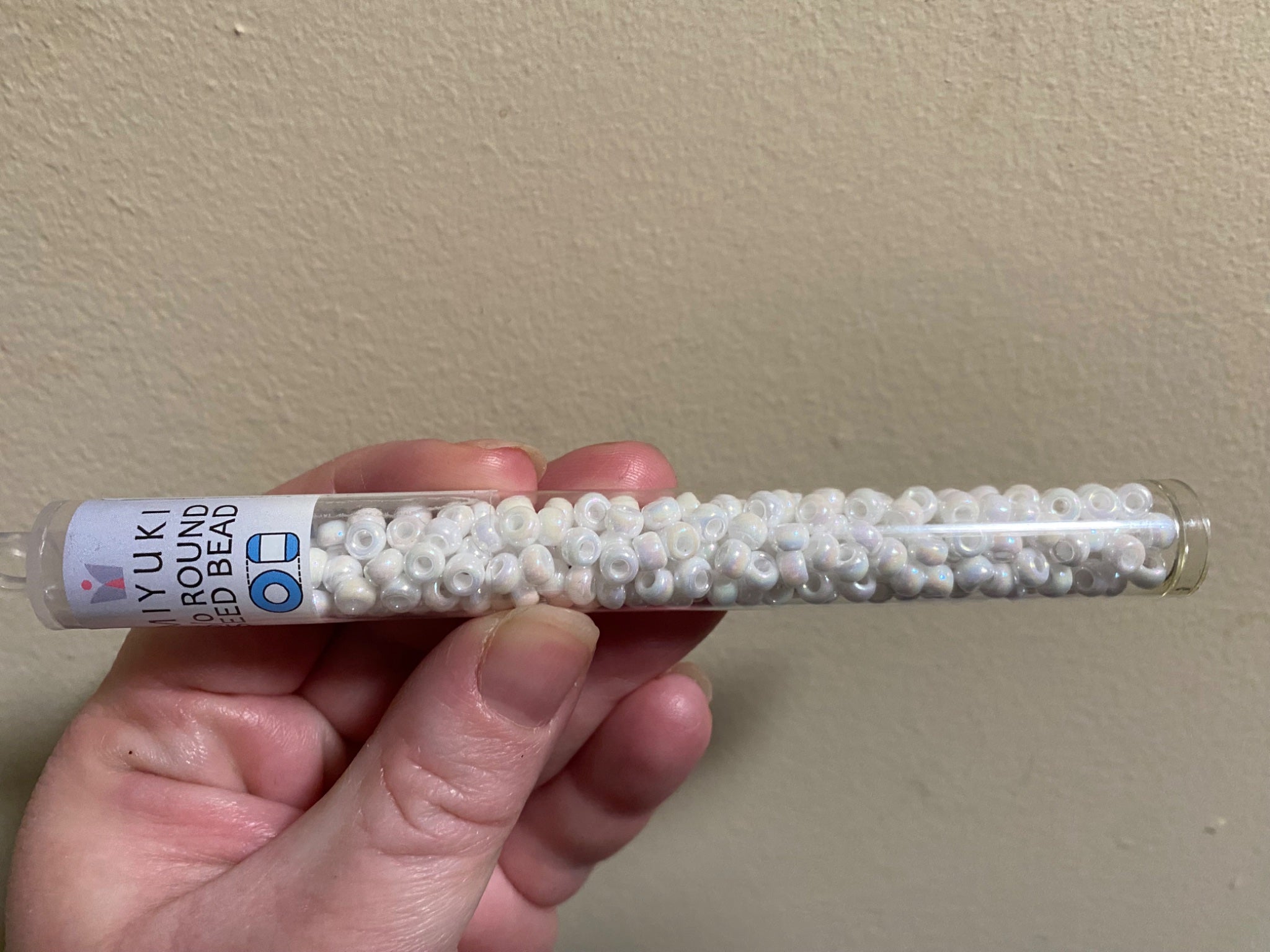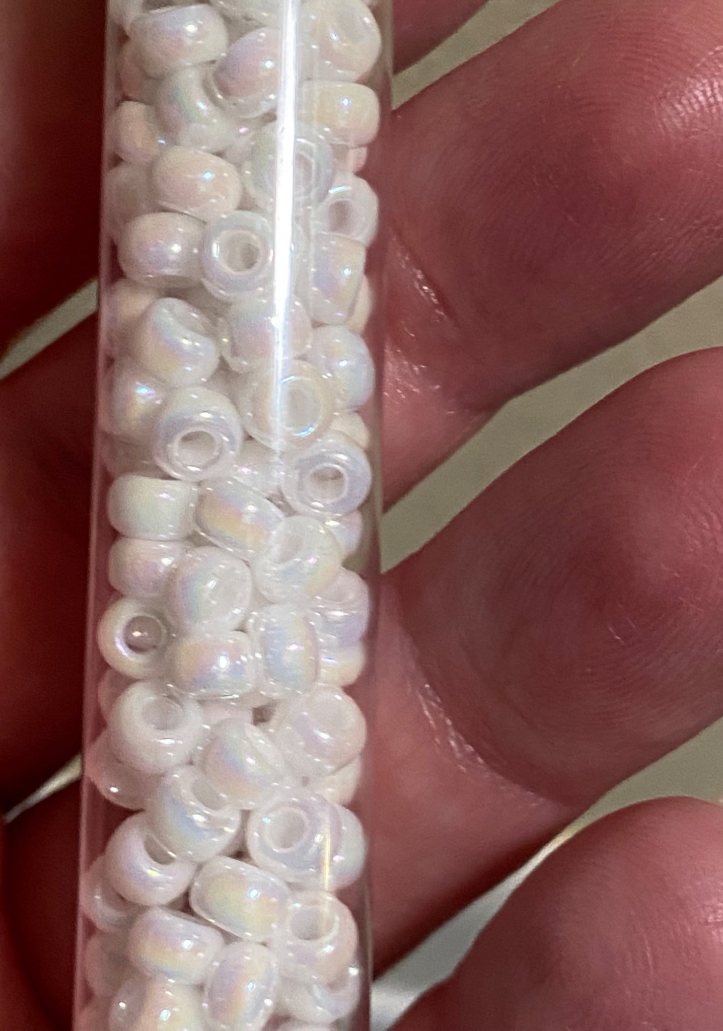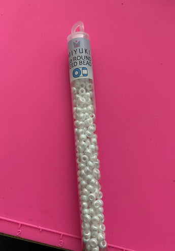 Beautiful pearly white Miyuki seed beads in color 6-9402R, an opaque white with AB shine.