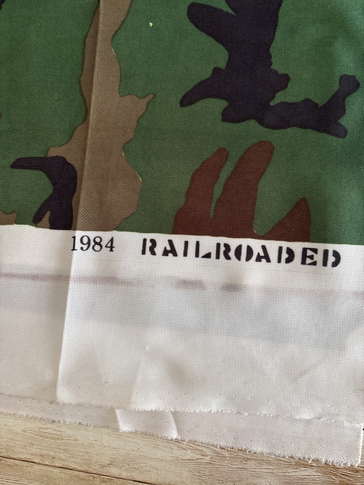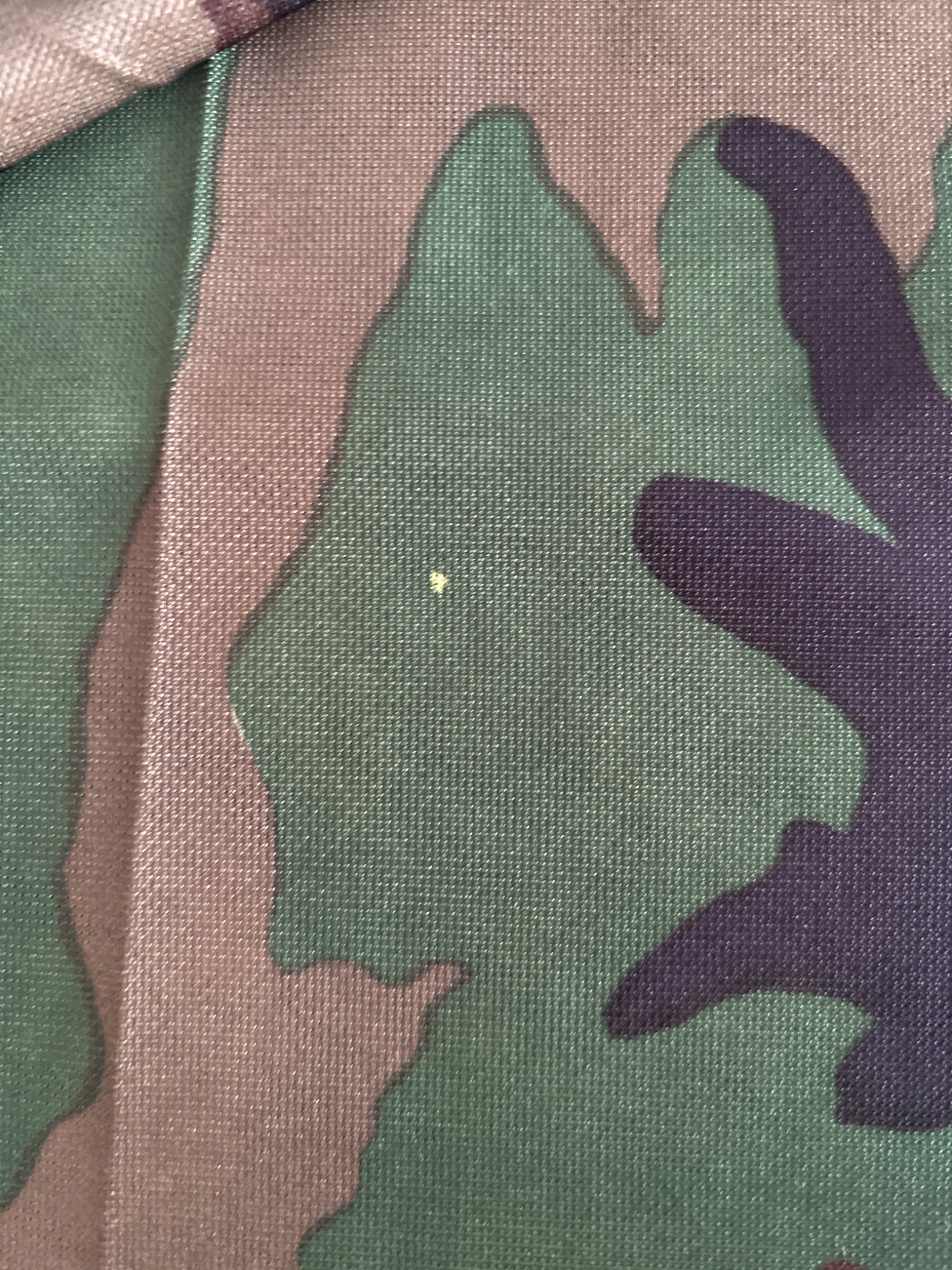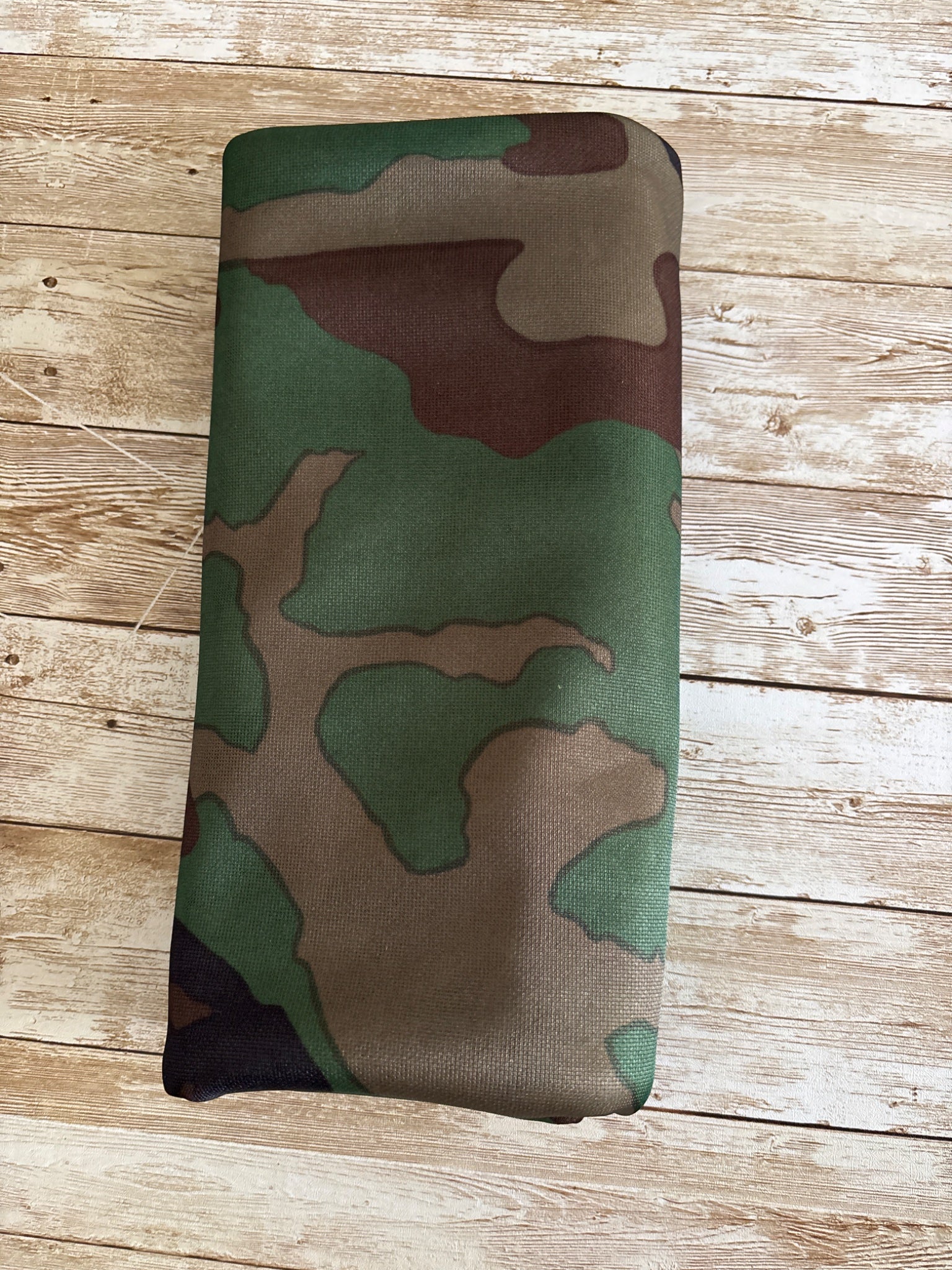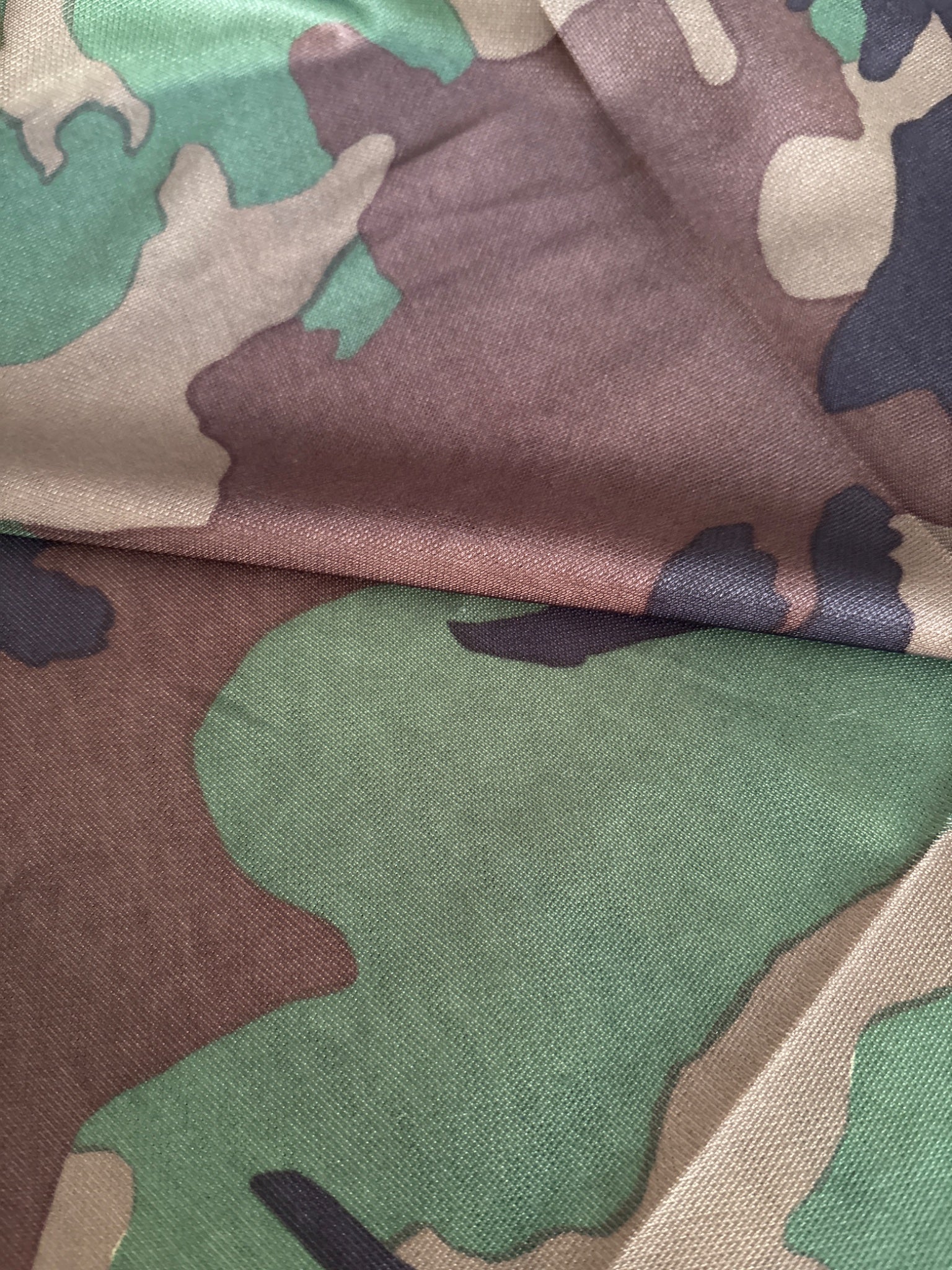 Camo fabric, ultra soft and feels like nylon. Due to stretchiness of material the measurement may be off slightly. I did not include the white edge in the measurement, only the printed part.