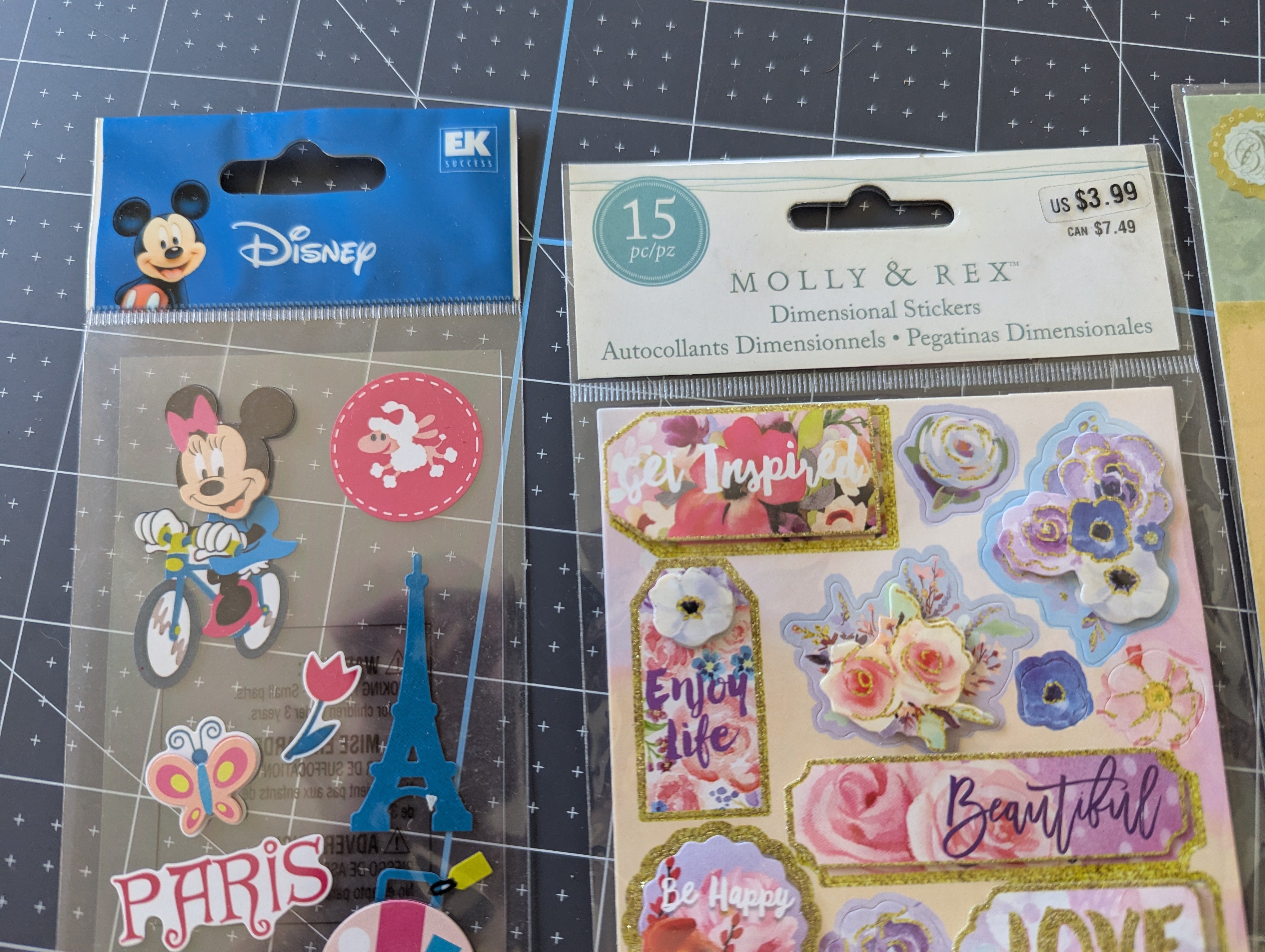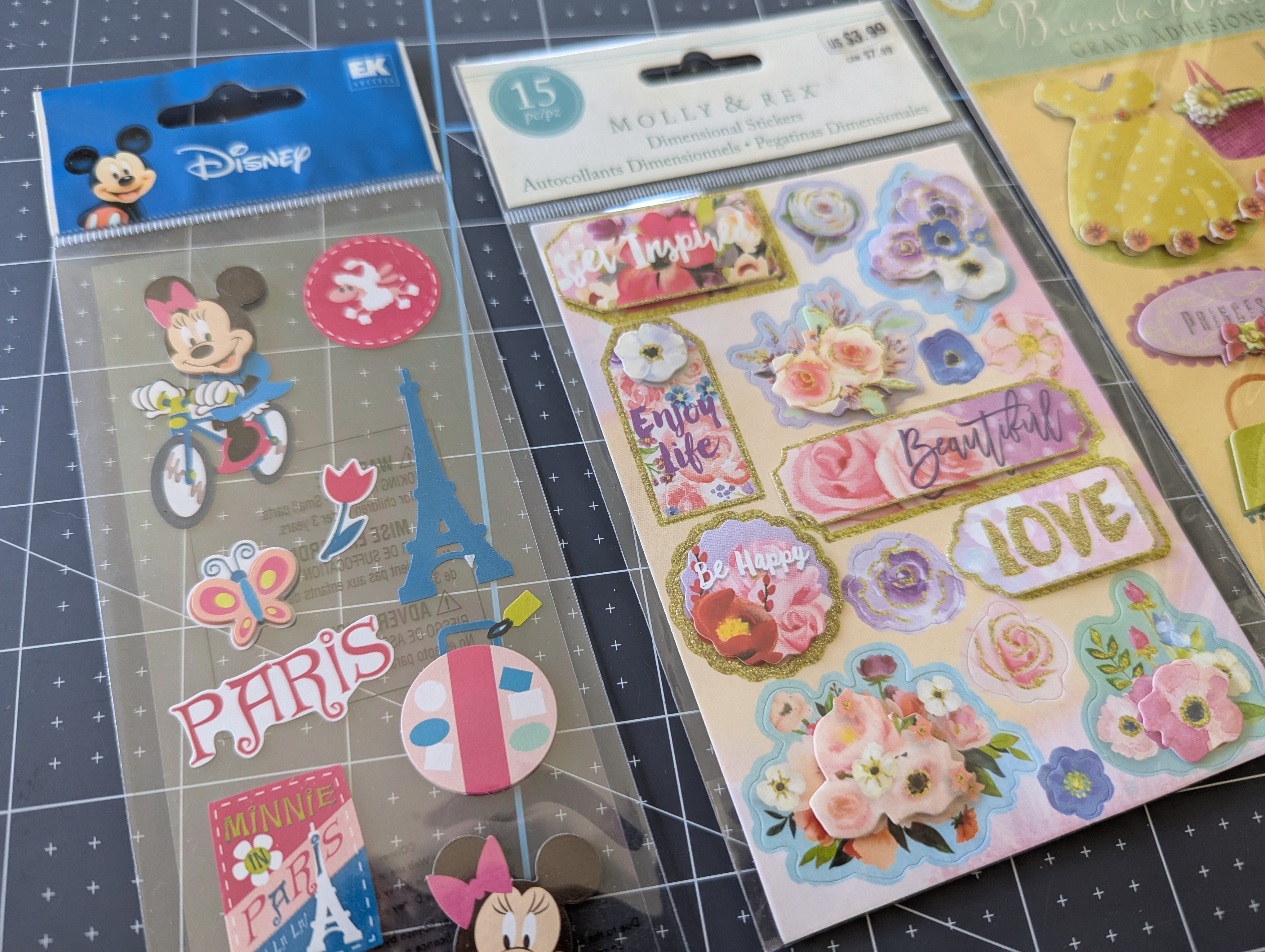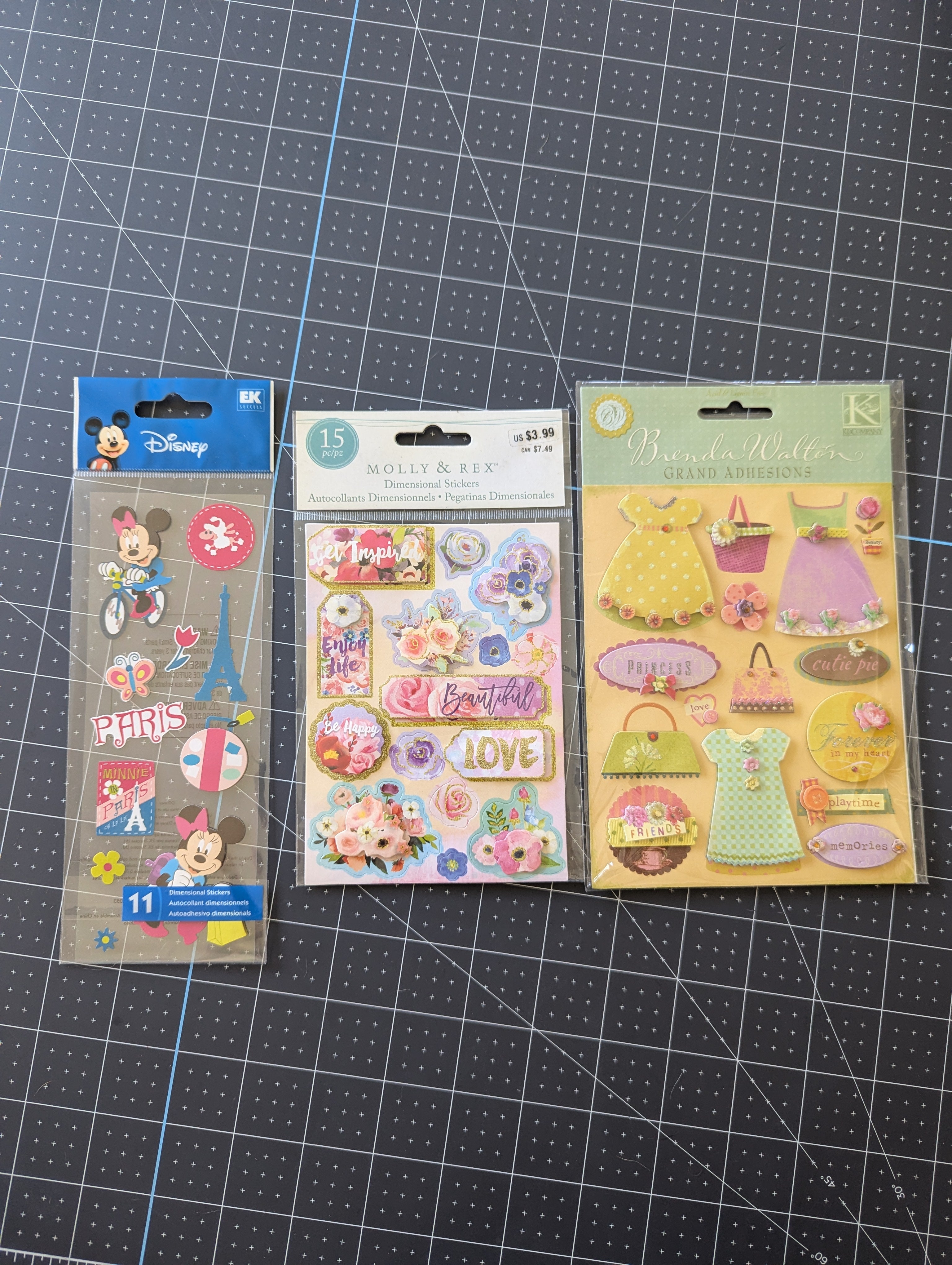 A sweet little set of stickers great for girly themed paper craft projects. Includes a set of Disney stickers - Minne in Paris, Molly & Rex dimensional stickers, and Brenda Walton Grand Adhesions stickers.