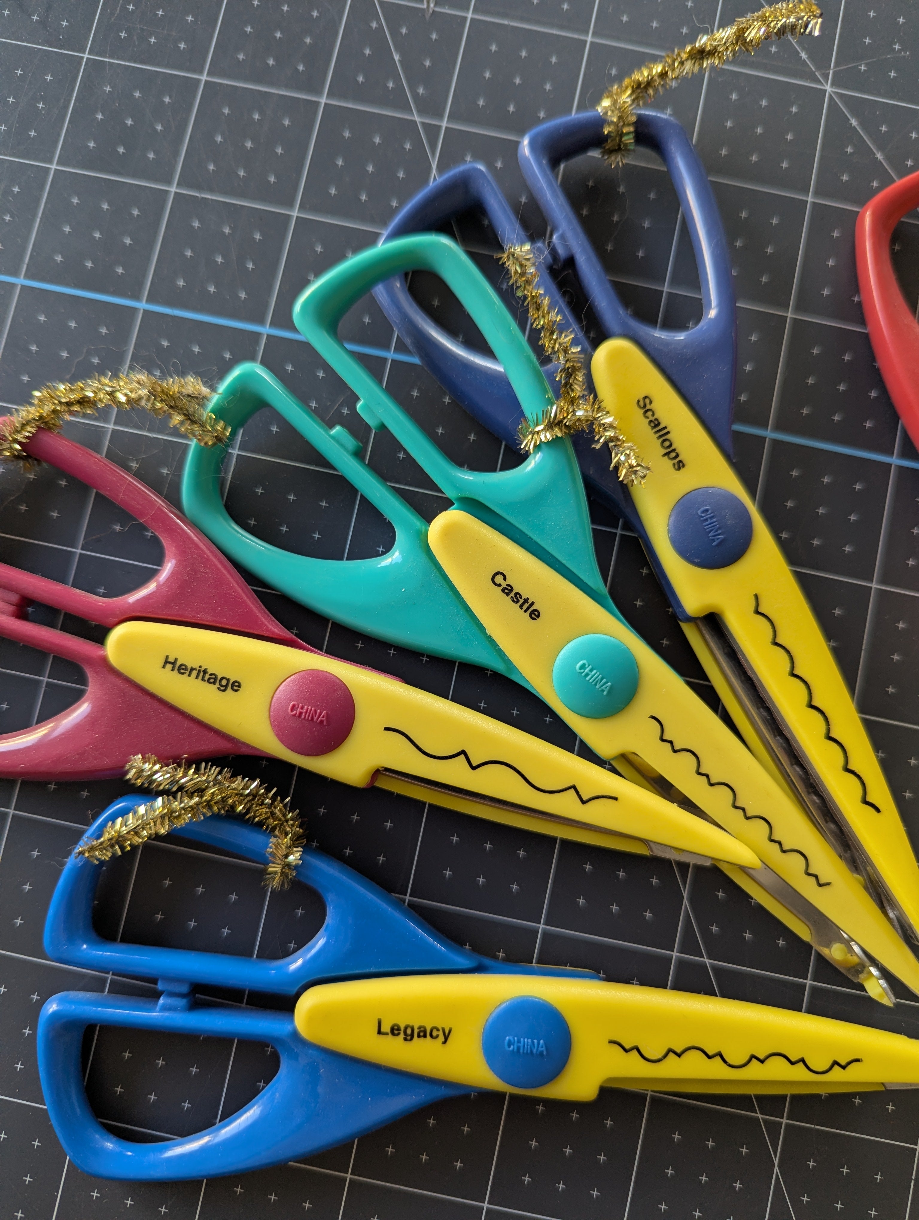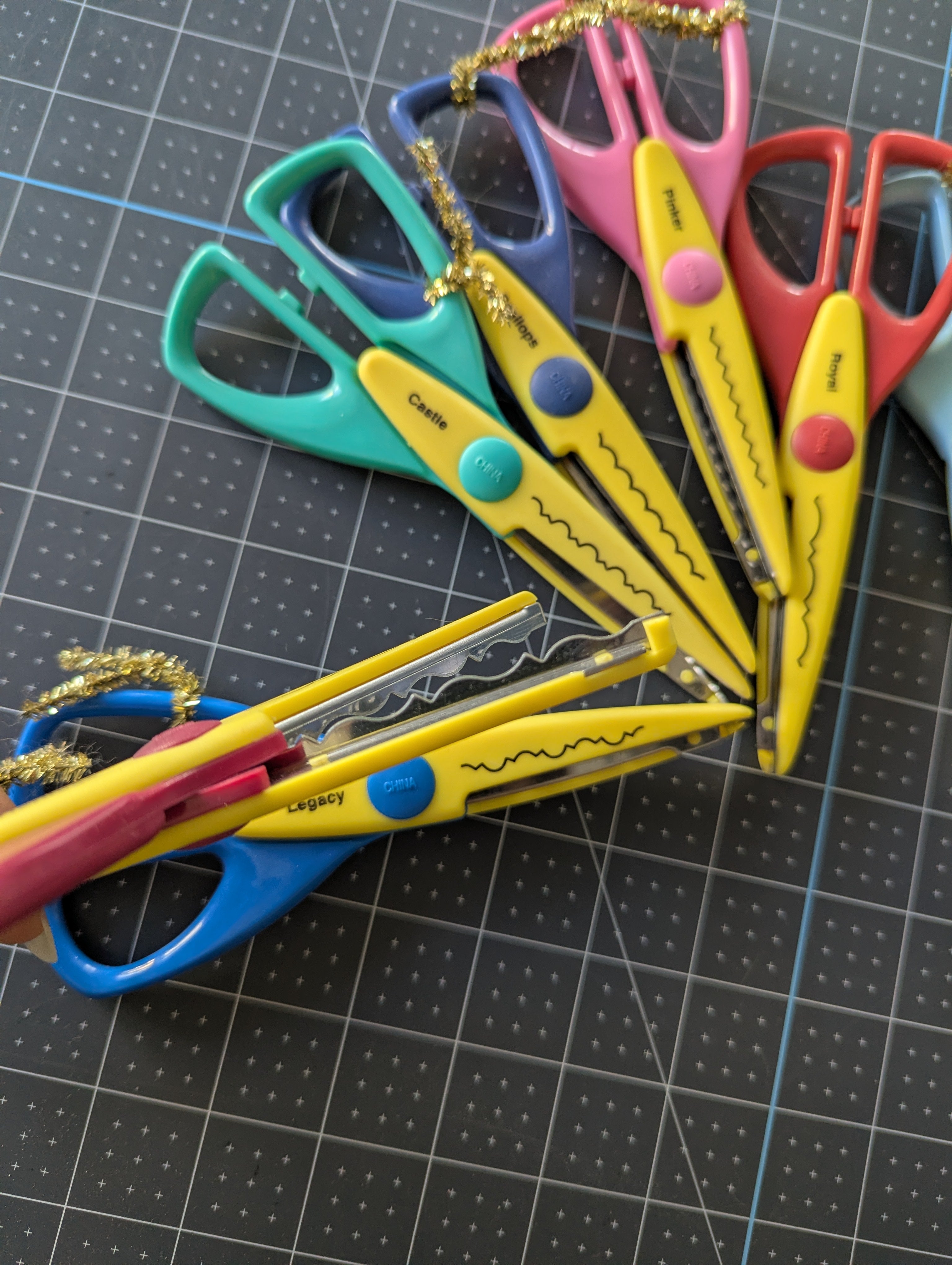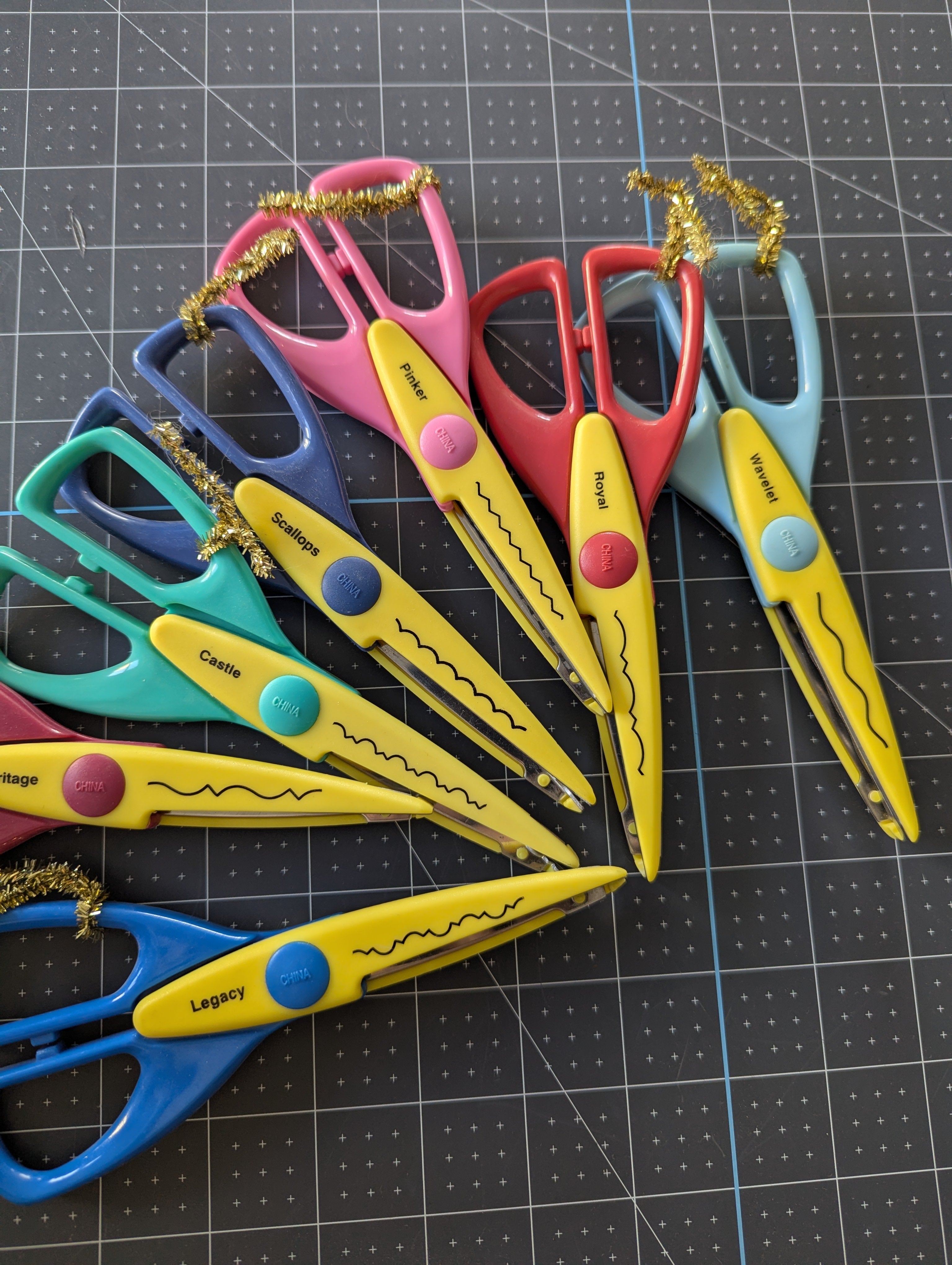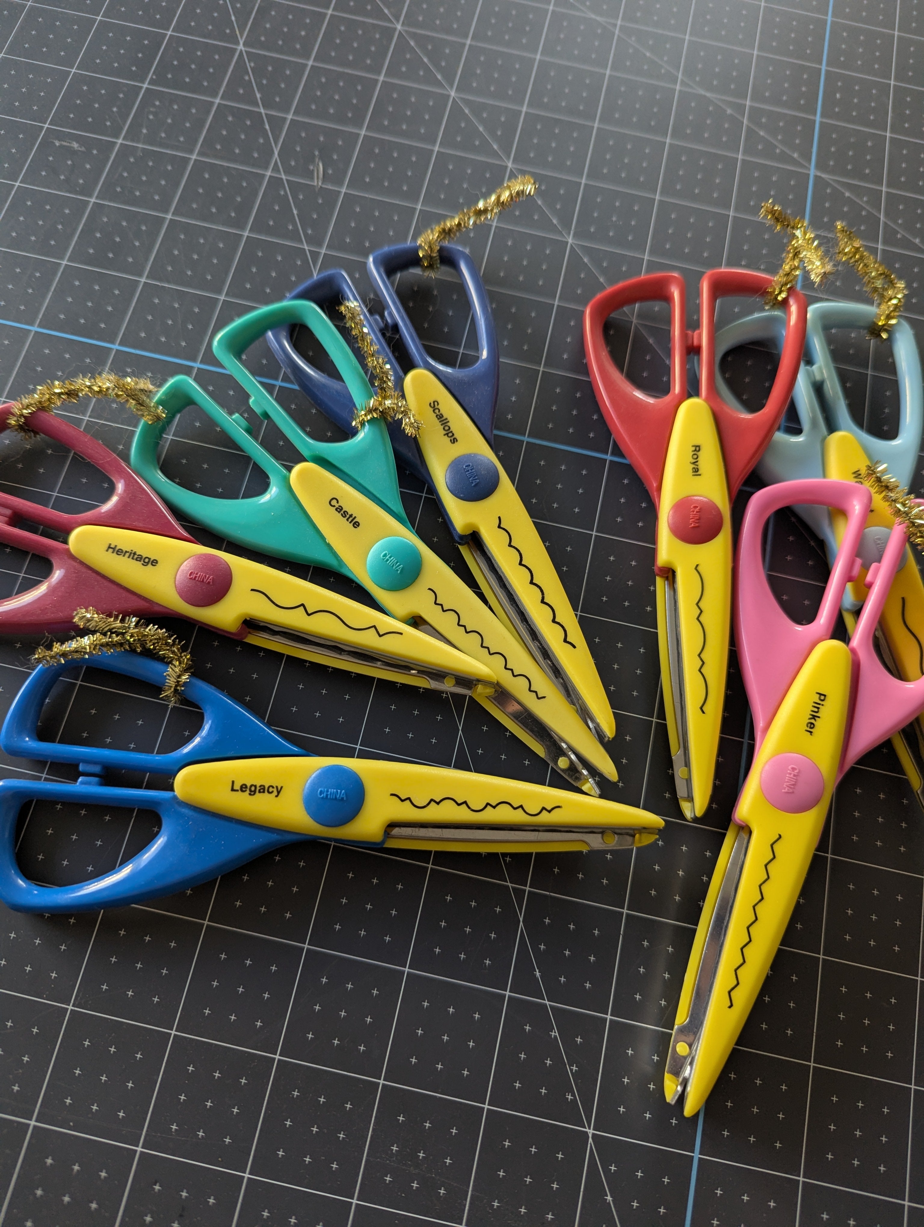 A set of 7 pcs craft scissors featuring Heritage, Legacy, Castle, Scallops, Pinker, Royal, and Wavelet patterns. Scissors have a little pipe cleaner on them which is likely from the owner wanting to know they belonged to them when taking them to parties. Carry it forward!