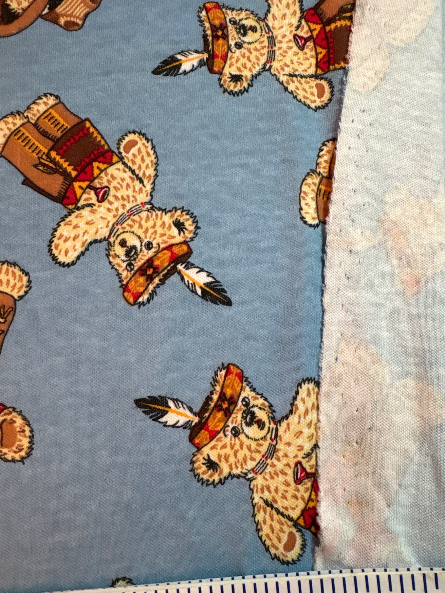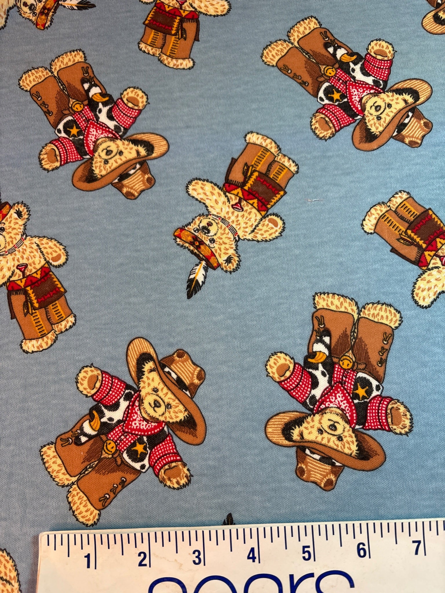 1 1/3 yd x 69" w, denim blue cowboy teddy bears, cotton knit with 2 way stretch. Great for kids clothes or pajamas. No odors likely from the 1990's.