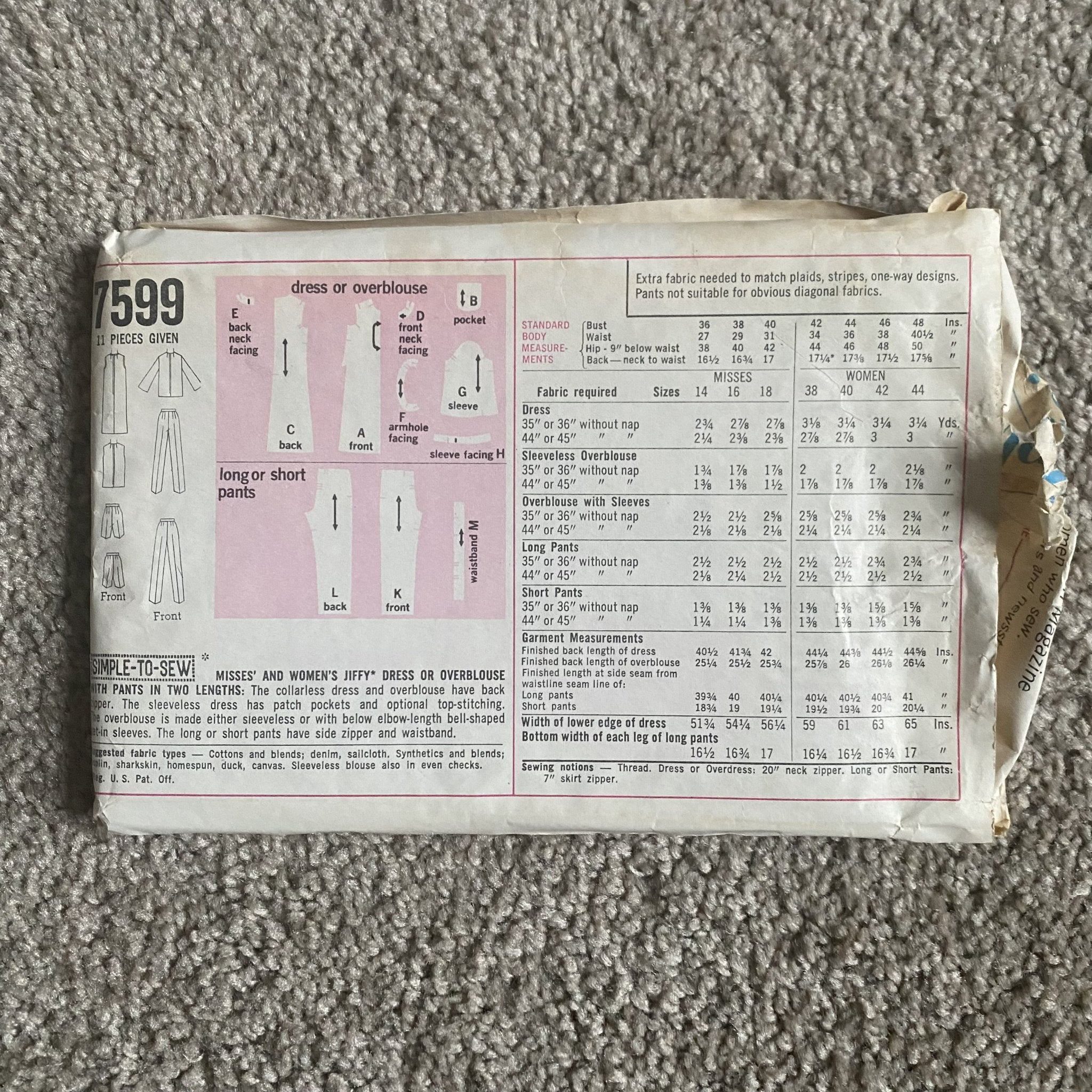 1968 ~ Simplicity #7599 ~ Women's Jiffy Dress or Overblouse with Pants ~ Size 40 ~ Plus Size