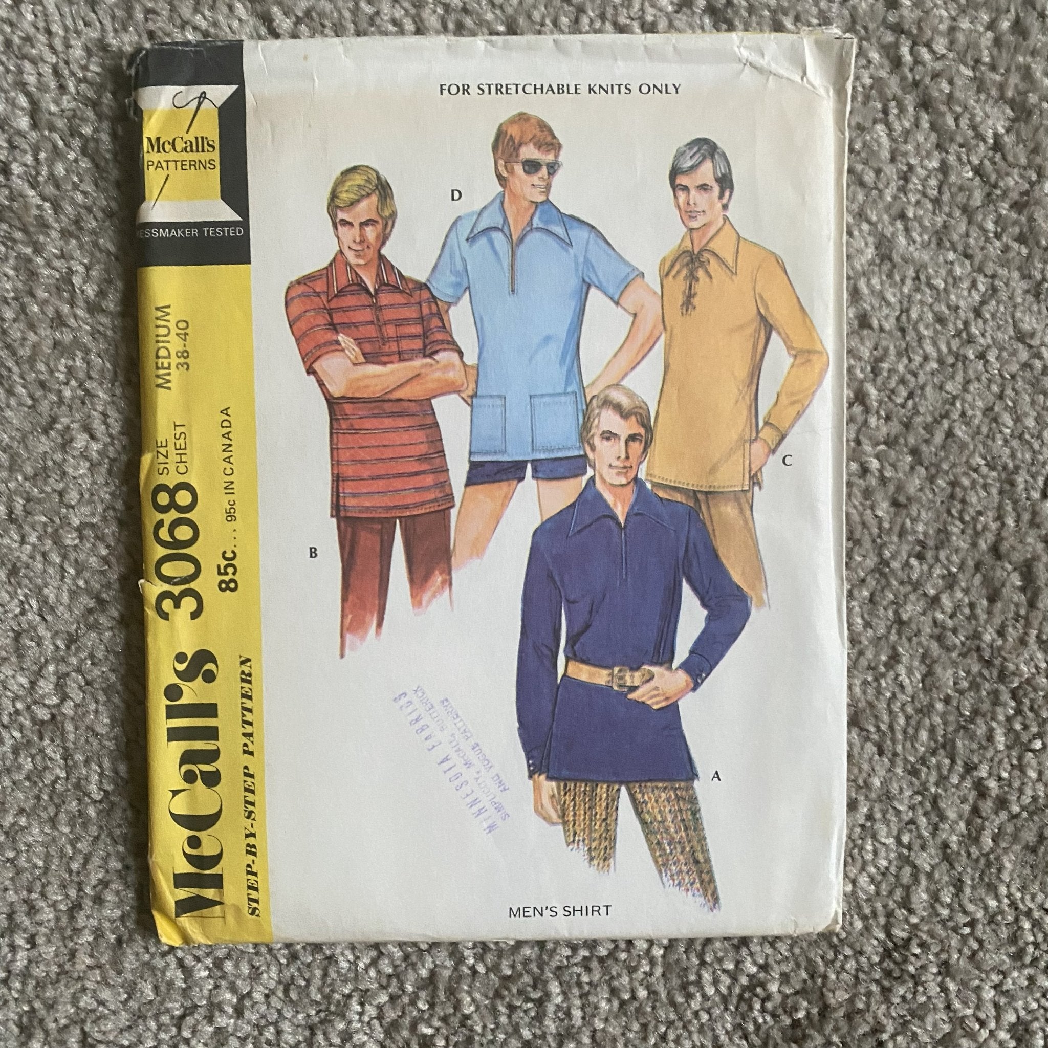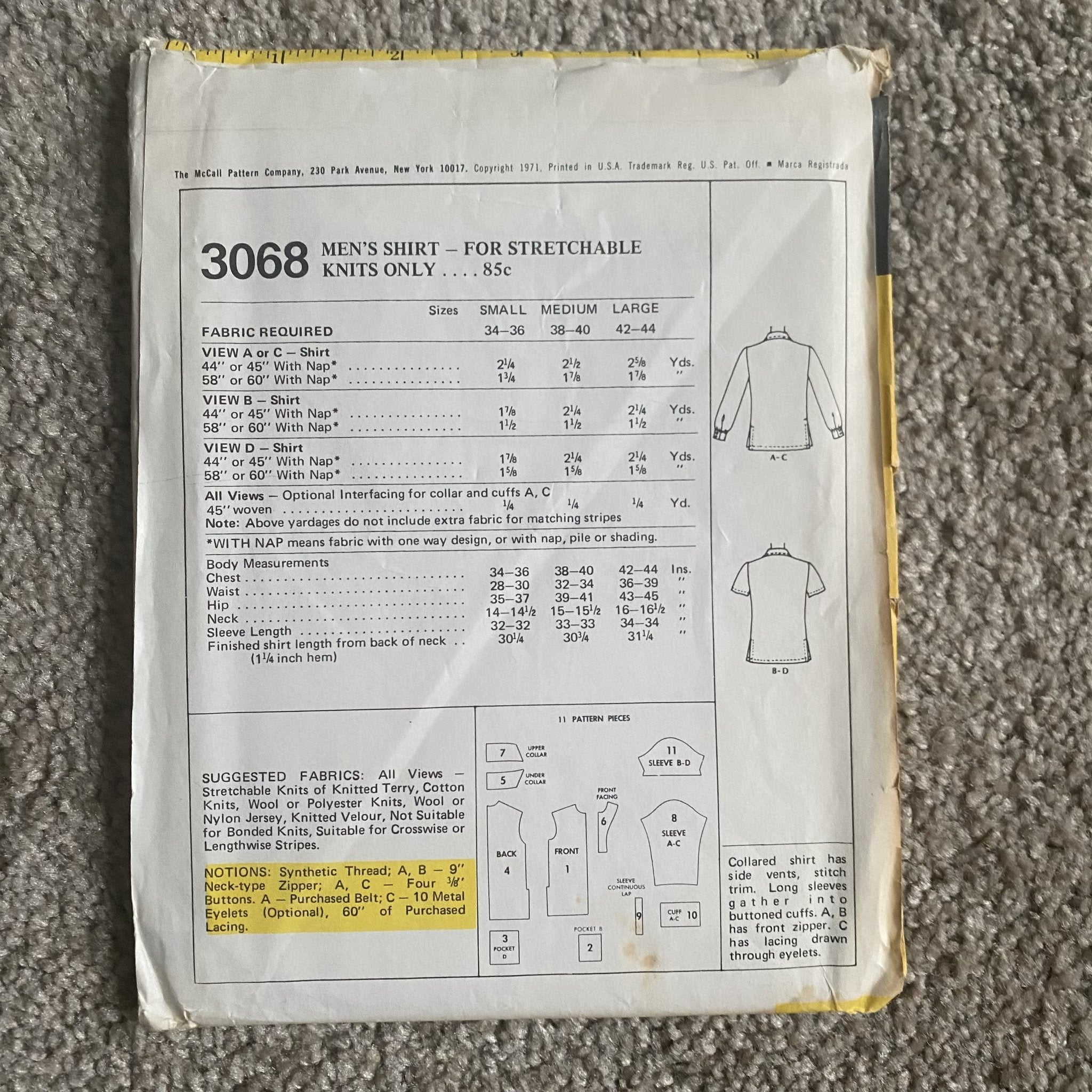 1971 ~ McCall's #3068 ~ Men's Shirt ~ Medium/Chest 38-40 ~ For Knits Only