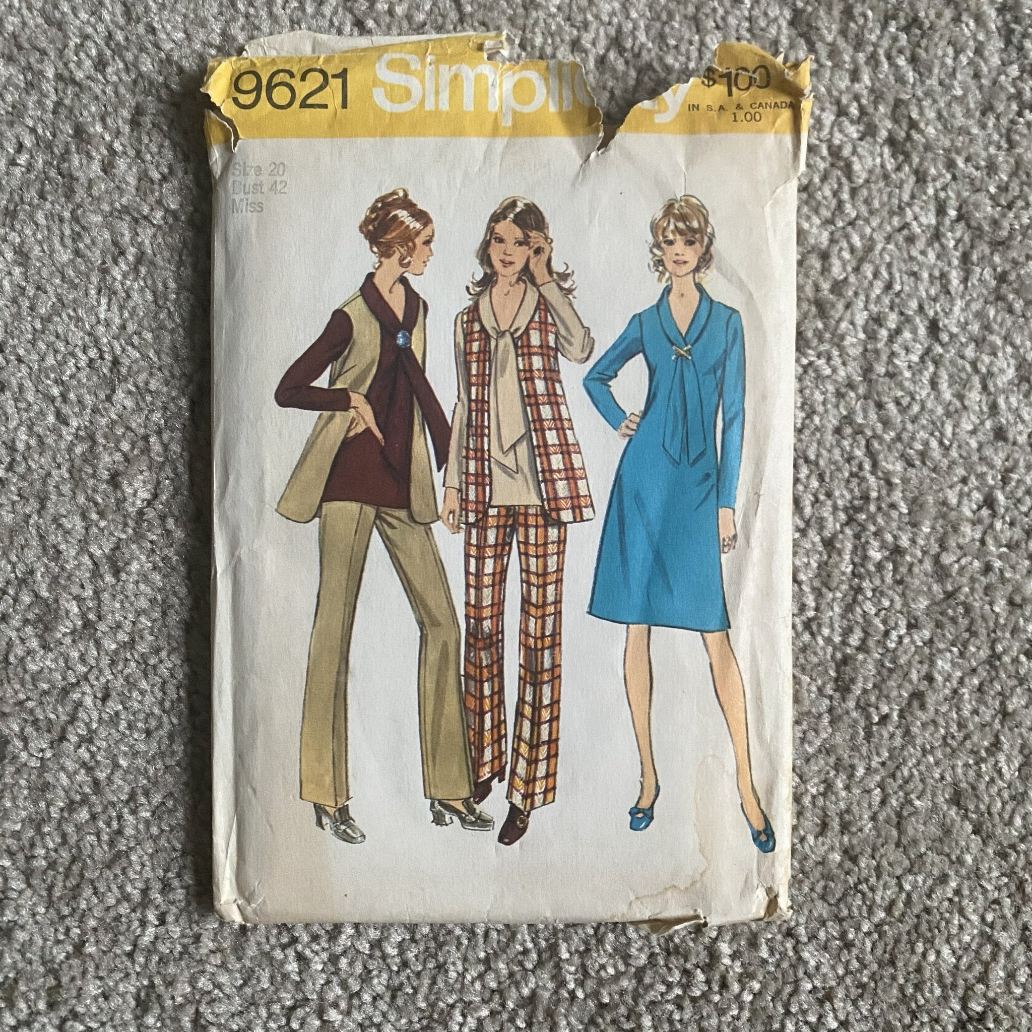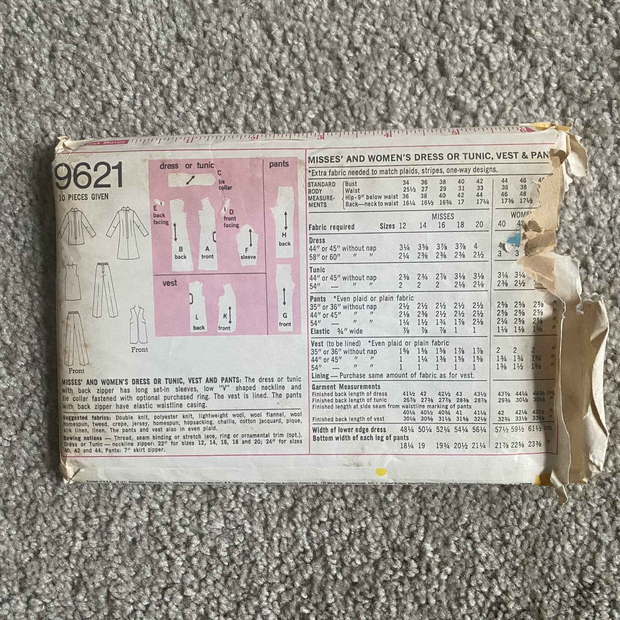 1971 ~ Simplicity #9621 ~ Women's Dress or Tunic, Vest, and Pants ~ Size 20 ~ Plus Size