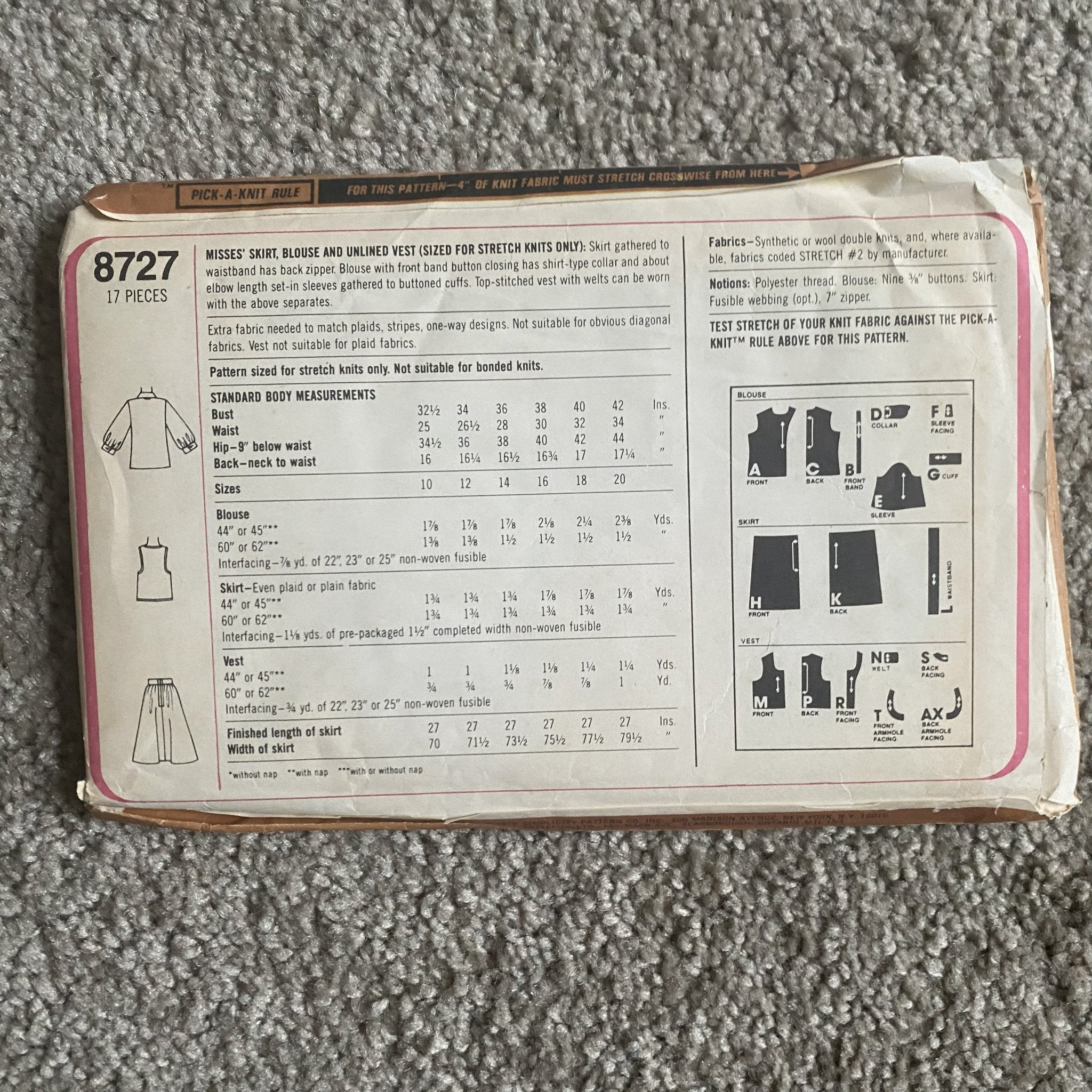 1978 ~ Simplicity #8727 ~ Butte Knit ~ Misses' Skirt, Blouse, and Vest ~ Size 18 & 20 ~ For Knits Only ~ Plus Size