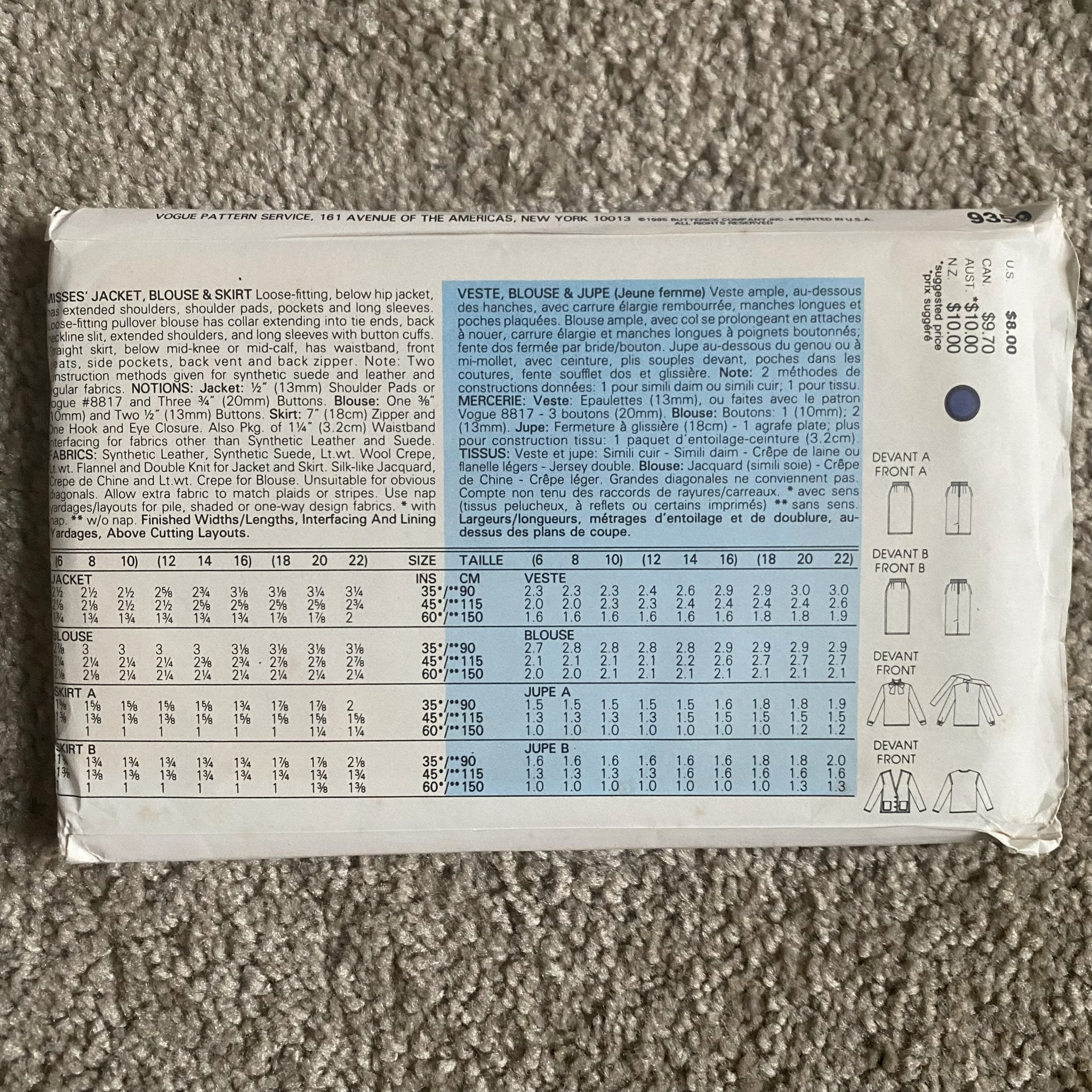 1985 ~ Vogue Patterns #9359 ~ Misses' Jacket, Blouse, & Skirt ~ Size 18-22 ~ Plus Size