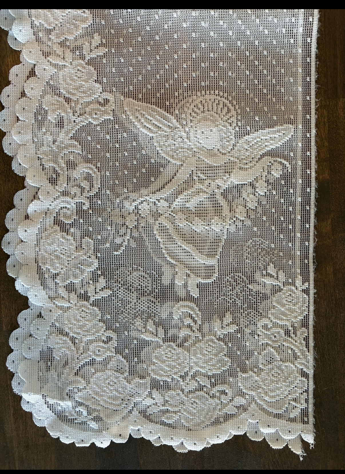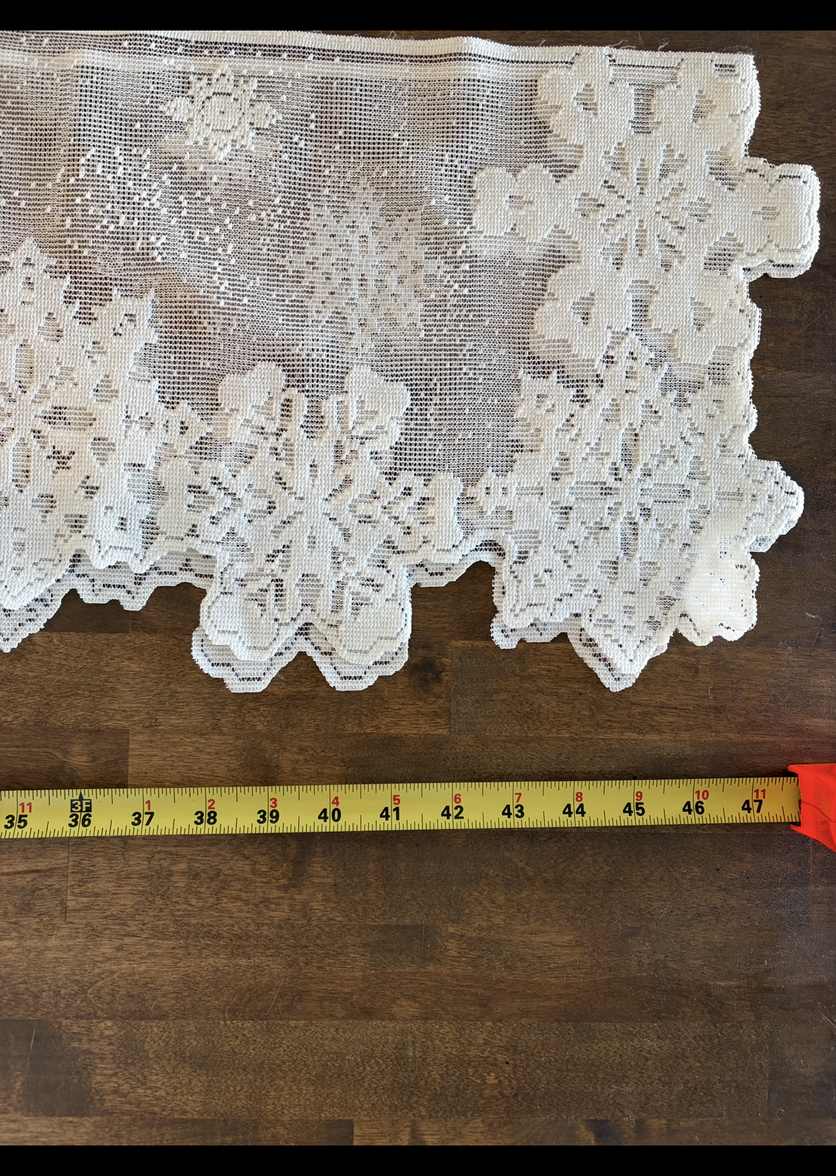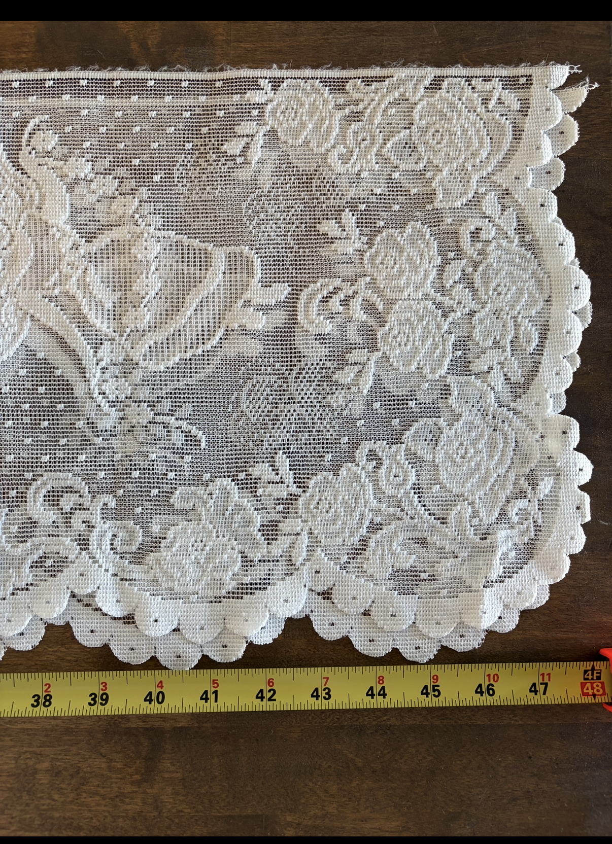 Pics show some of the detail of the lace. Nice condition. No odors. Non smoking home. These are very long- the 48" picture is with the piece folded in half (total 96" in length). Other measurements show various spots on the runner- as it has a unique shape with varying widths.