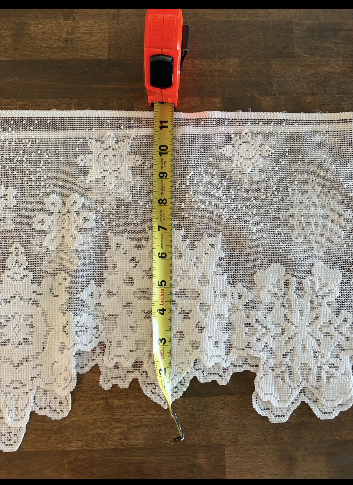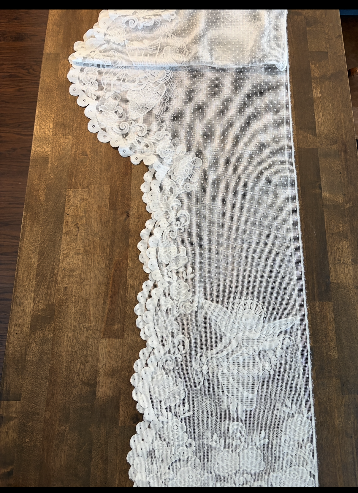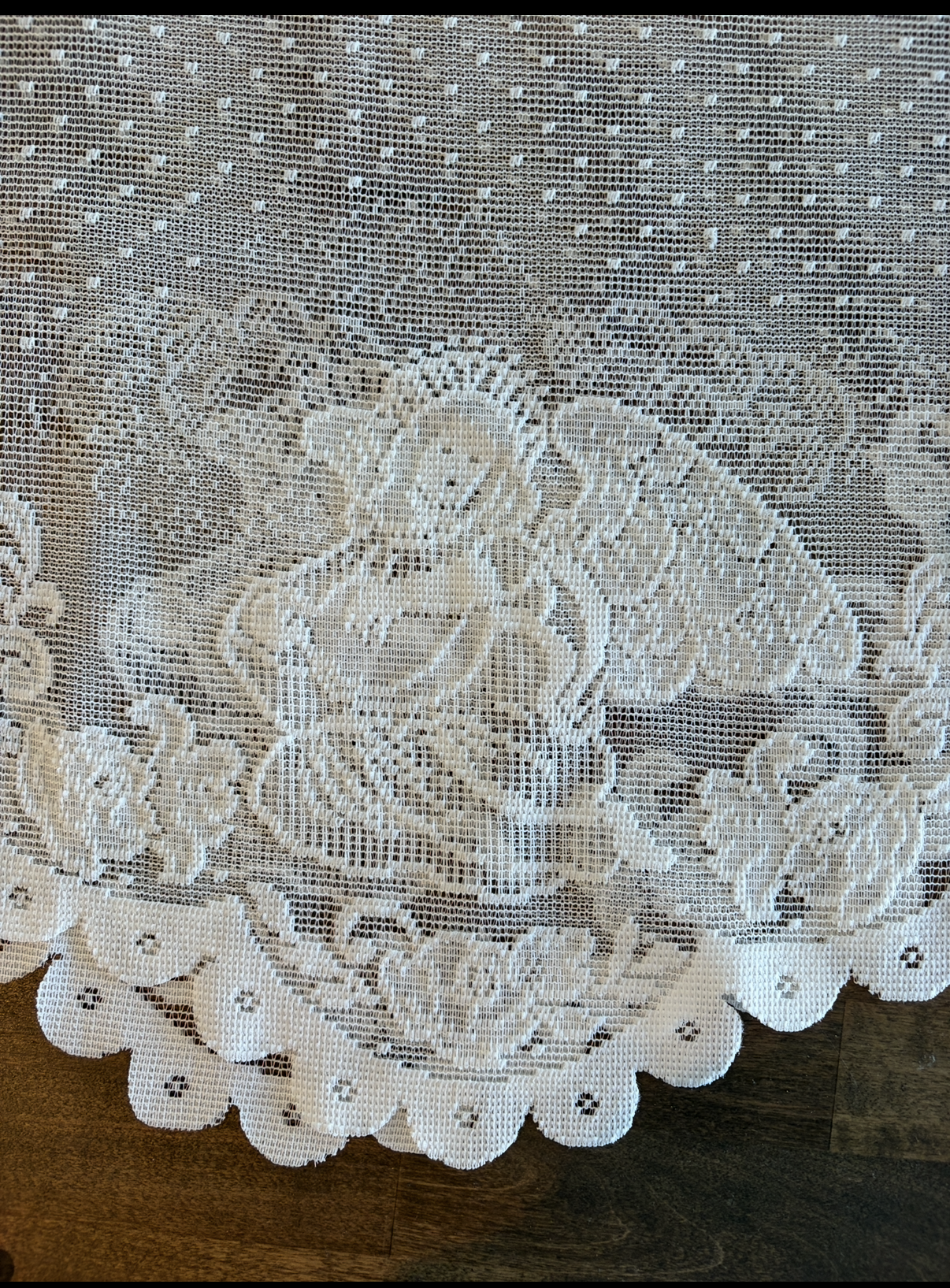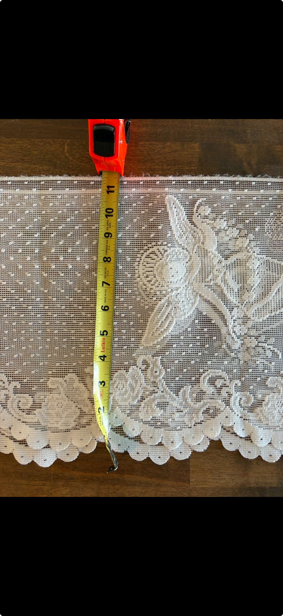 Pics show some of the detail of the lace. Nice condition. No odors. Non smoking home. These are very long- the 48" picture is with the piece folded in half (total 96" in length). Other measurements show various spots on the runner- as it has a unique shape with varying widths.