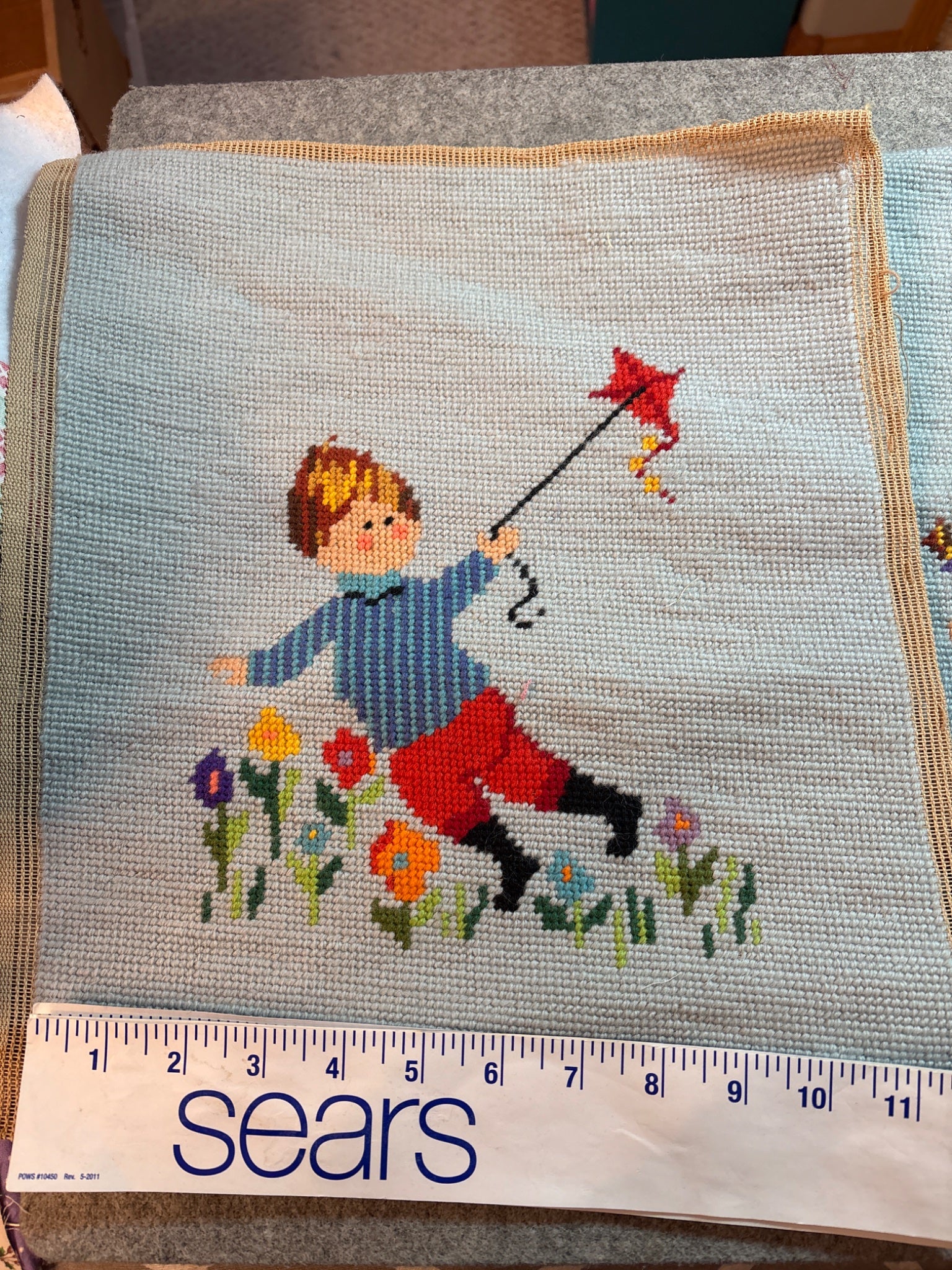 Have not been blocked. 2 wool needlepoint from the 1950's or 60's no odors. I've seen people make these into bags. Pale blue background each approximately 12" x 14"