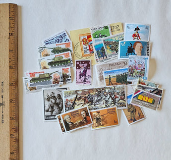 30 International Military and War Themed Postage Stamps for art projects and scrapbooking. Check pic for size of stamps. Some are on the larger size. The stamps originate from different places all over the world: Poland, Vietnam, USA, Sri Lanka, Grenada, Libya, Russia, Gambia etc.