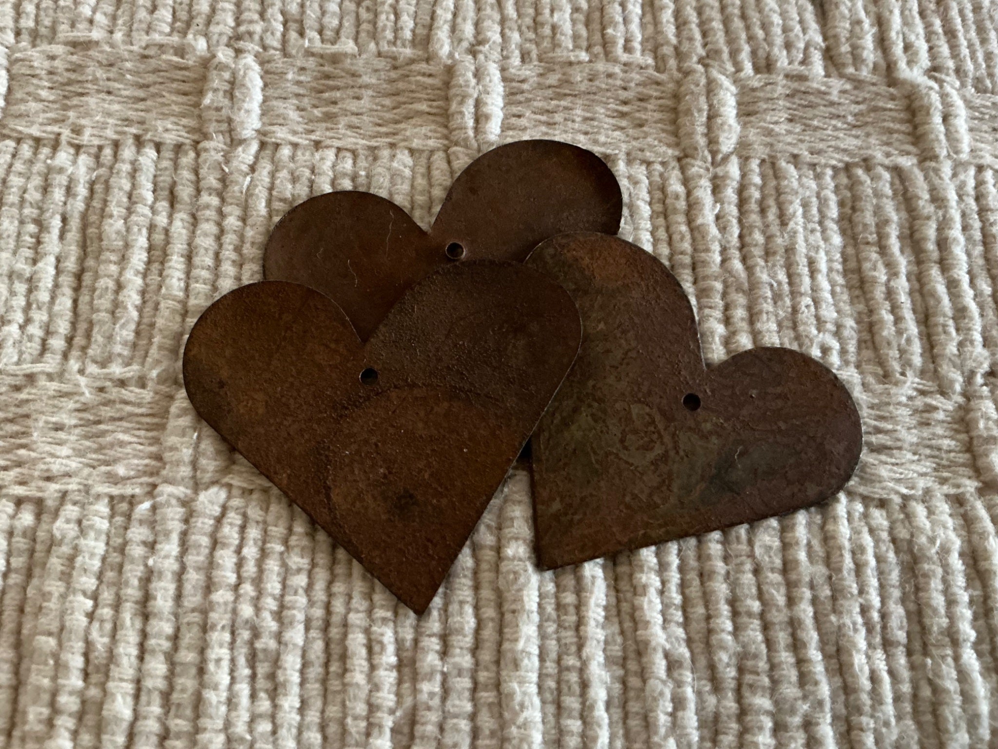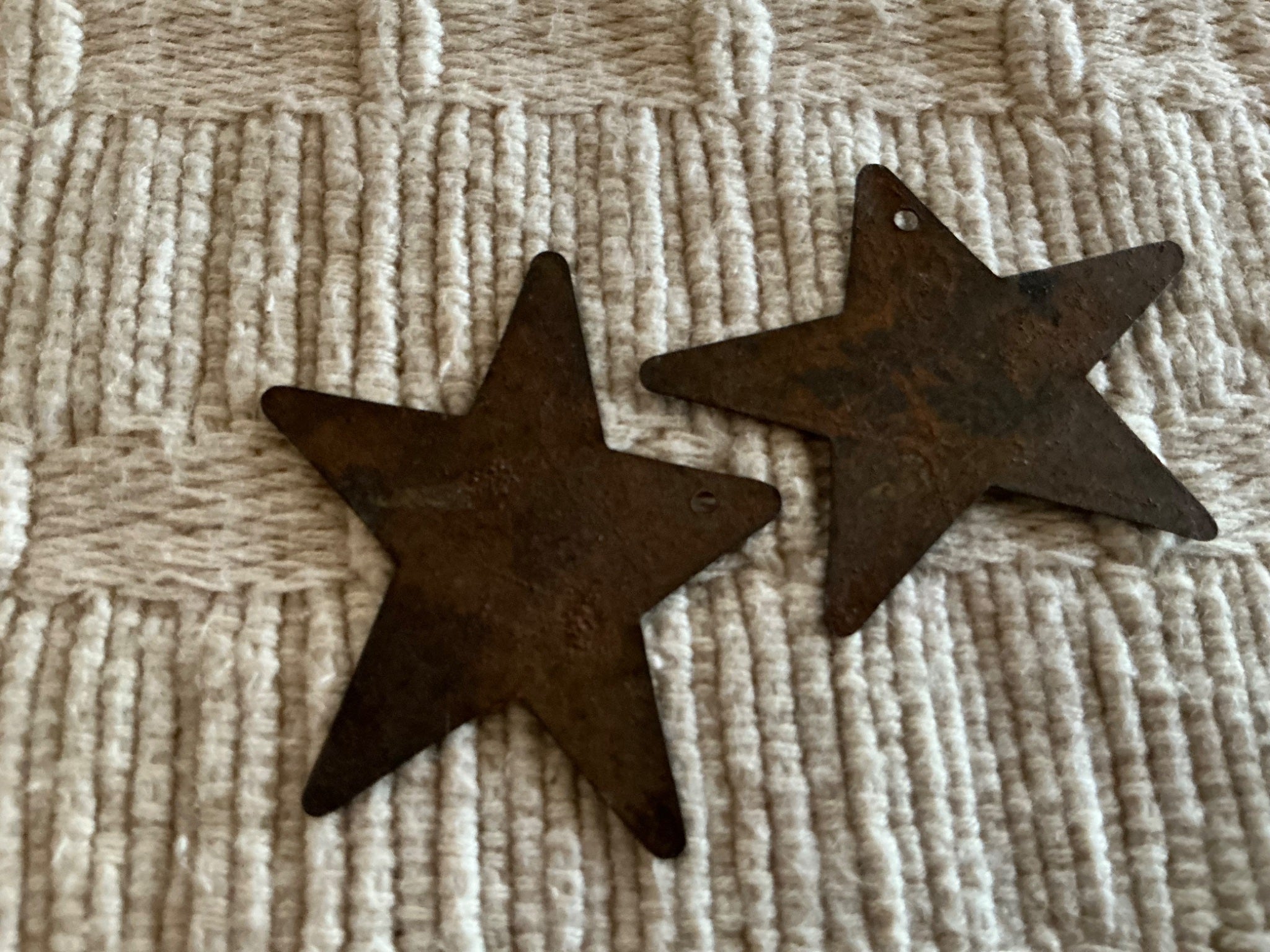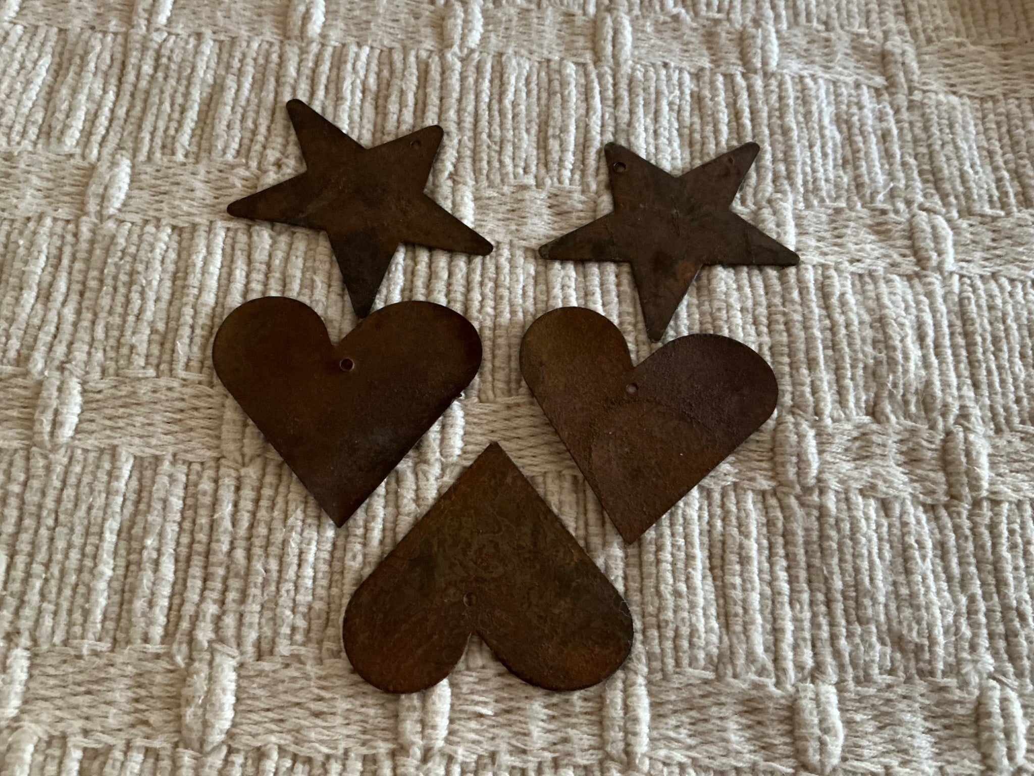 These stars and hearts are artisan made from rusty metal. The stars measure 2” across, the hearts are 1 1/2” wide x 1” at the center. They are drilled for pendants. $7.50 1oz.