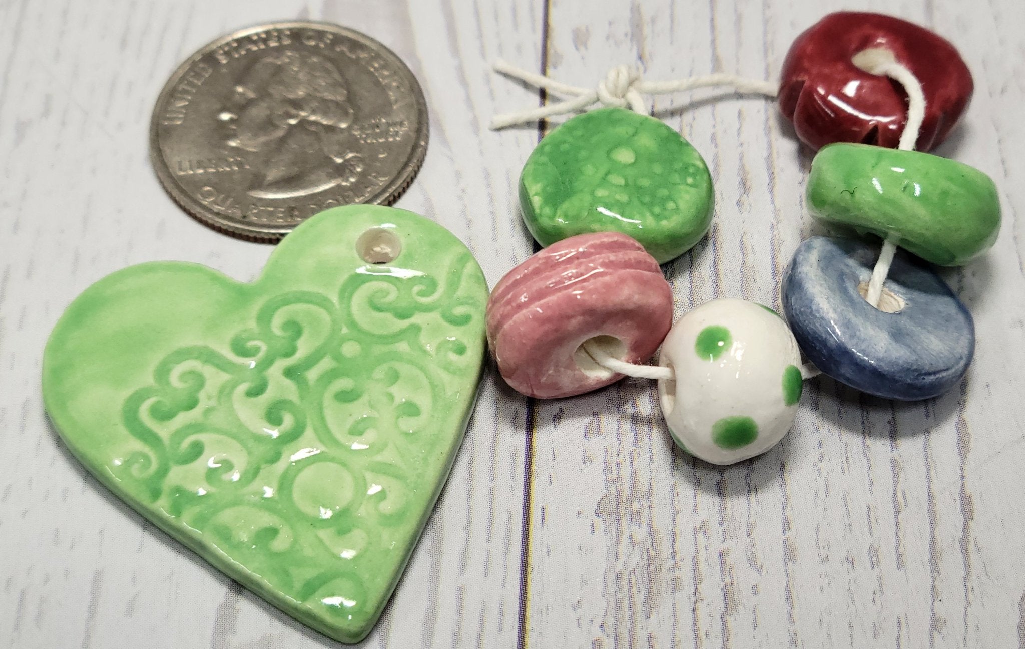 Artist Pottery Bead Set - Heart Pendant measures 37x37mm - Other beads range from 13 to 16mm - You get all in photo