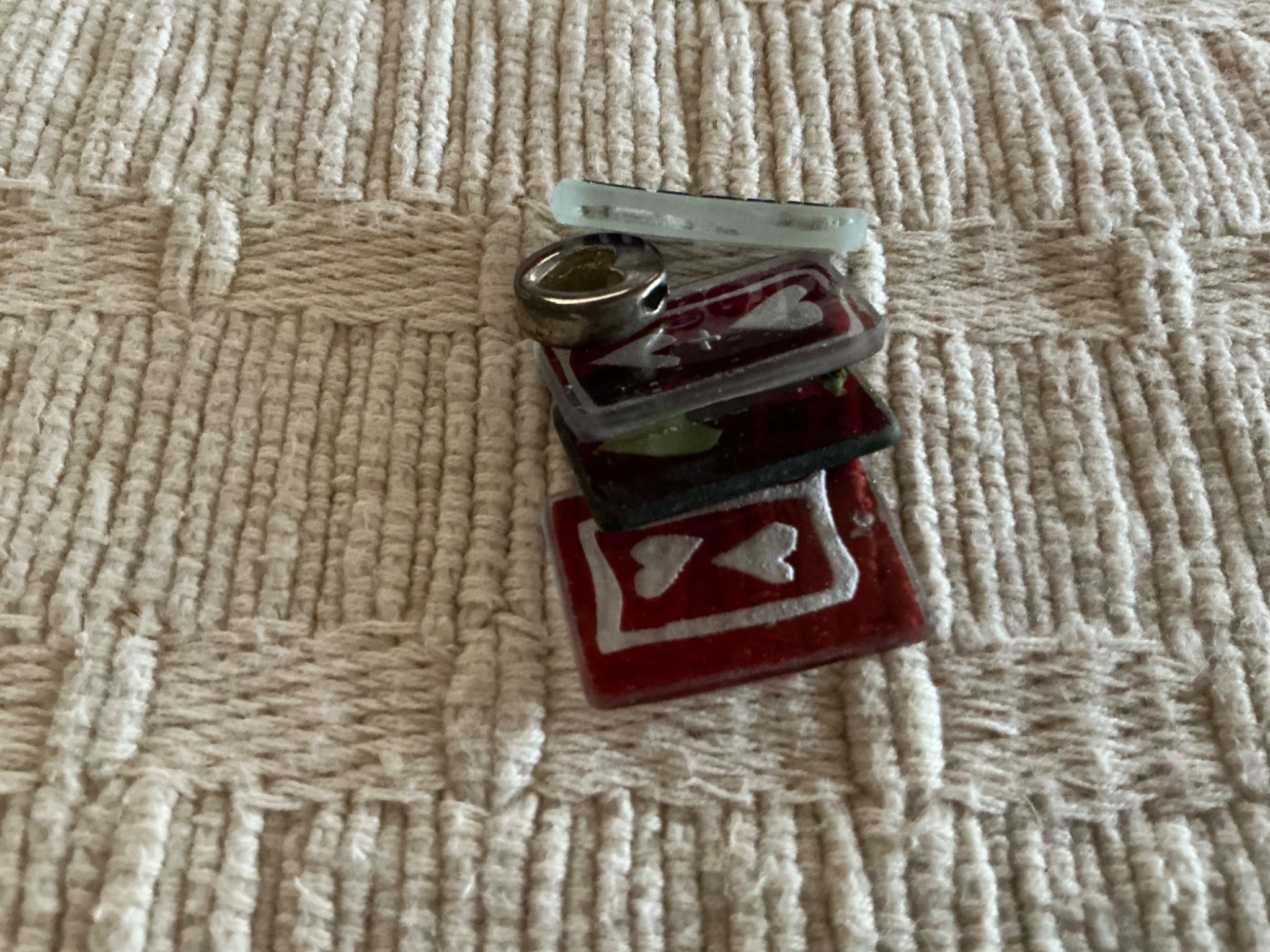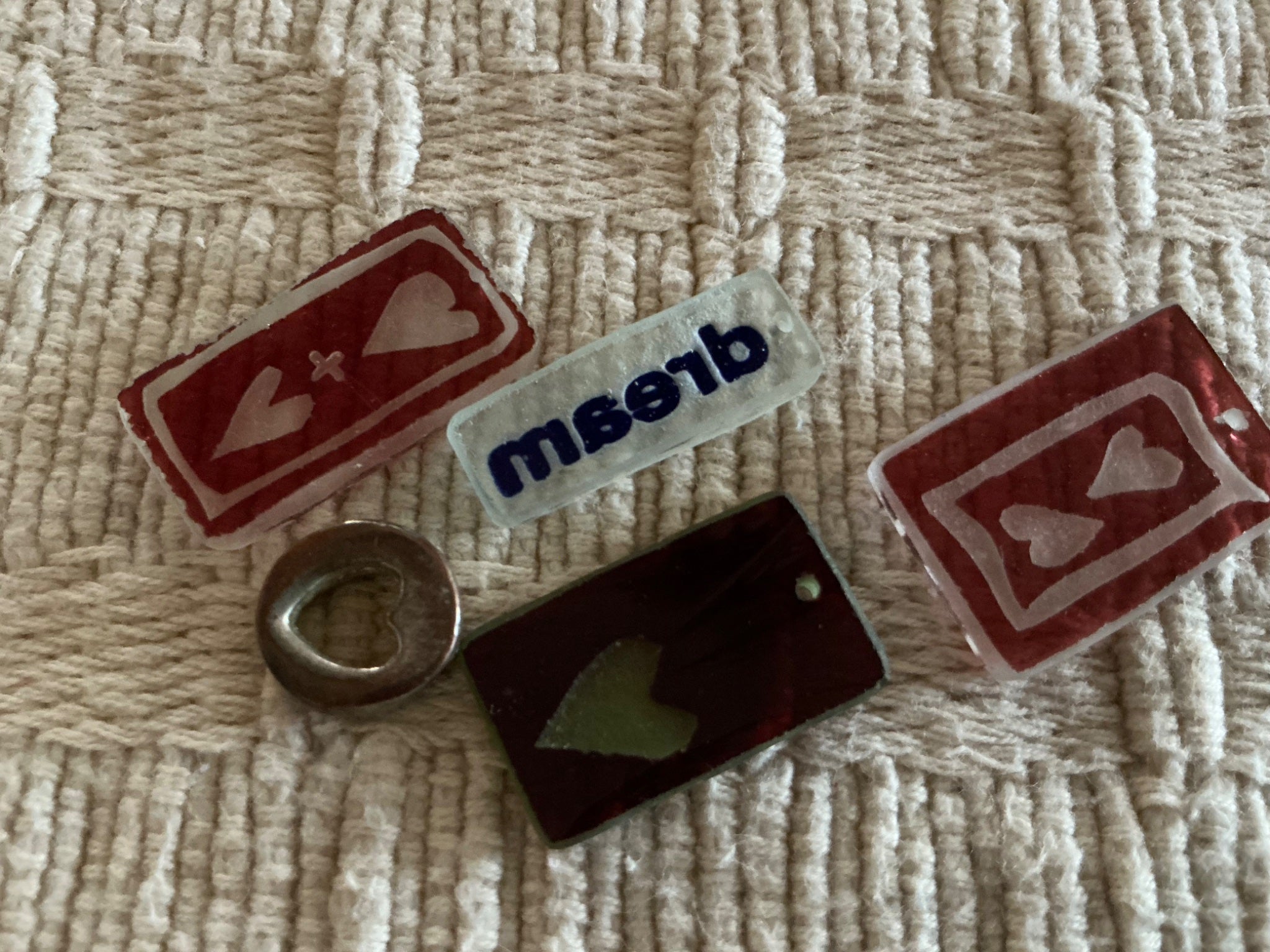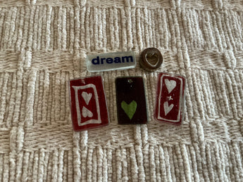 This lot contains three (3) frosted glass heart charm pendants, all 1” long, 2-1/2” wide, 1-3/4” wide. The heart charms are drilled at the top. One tiny 1/2” in diameter mental cut out of a heart, drilled across the top. One ‘dream’ frosted glass charm pendant 1” long x 1/4” wide, also top drilled. $7.50 1oz.
