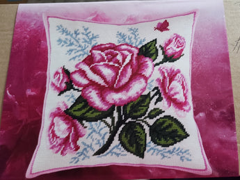 Gorgeous pink rose tapestry pillow, kit, everything included to create stitching. Does not include pillow form, backing or cording for trim
