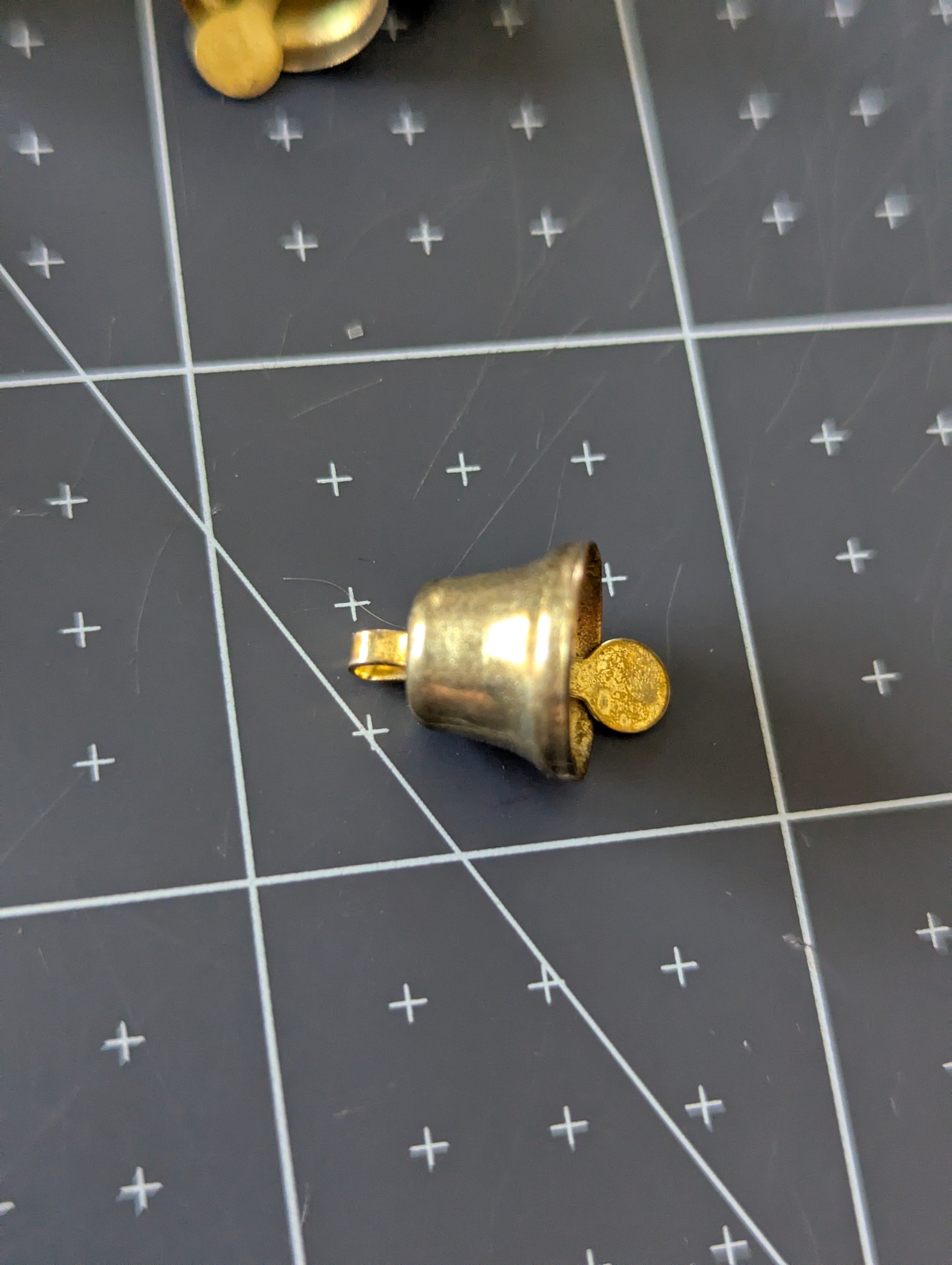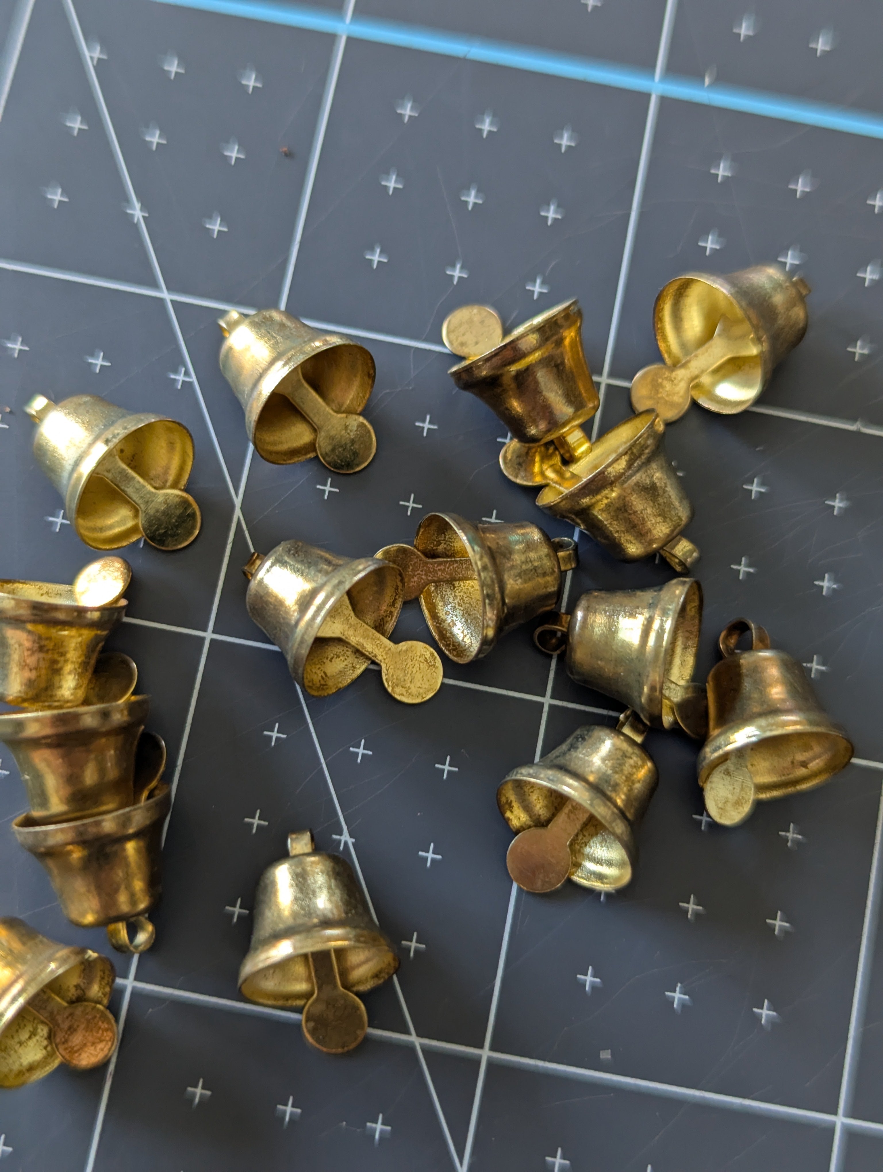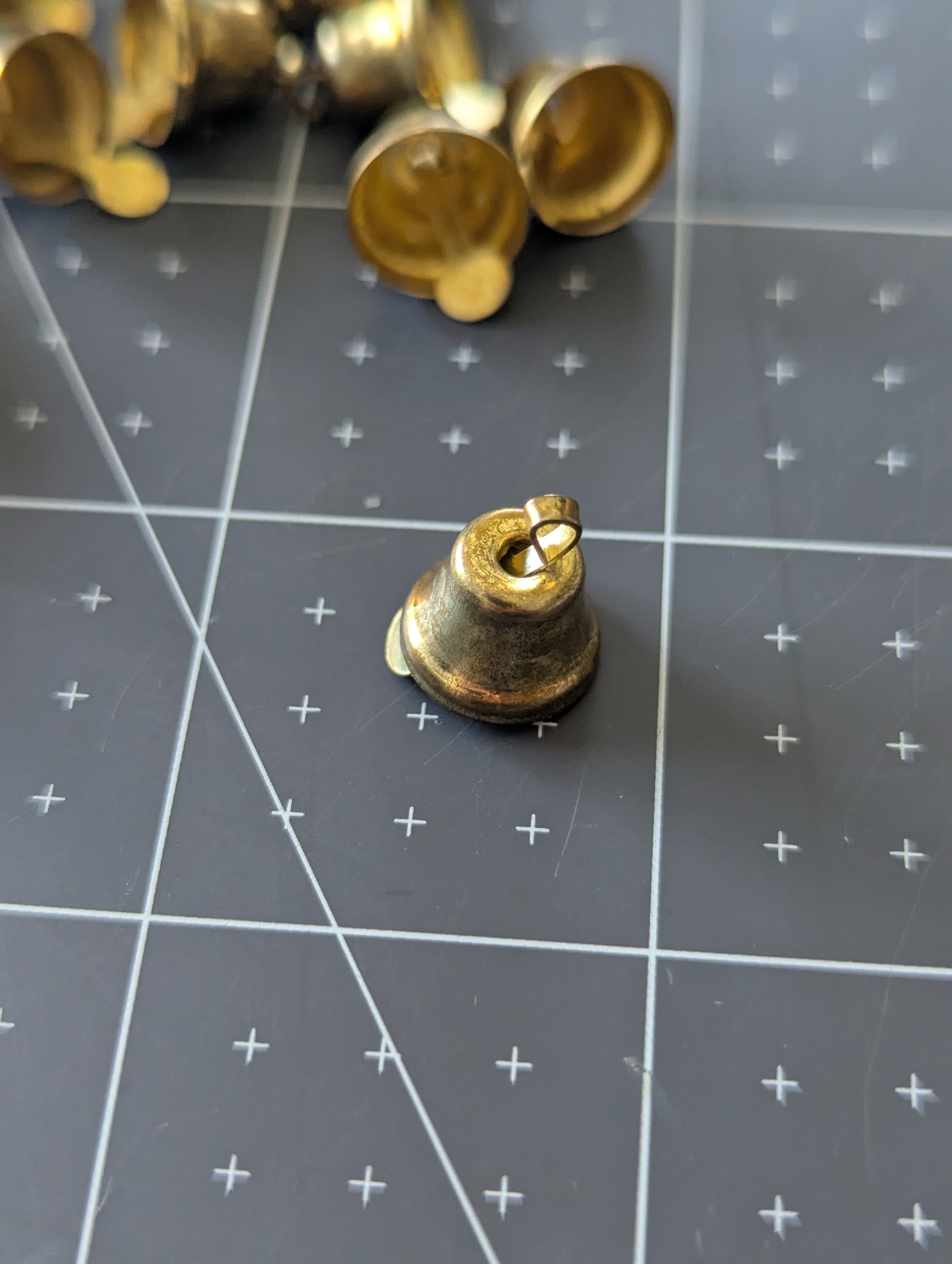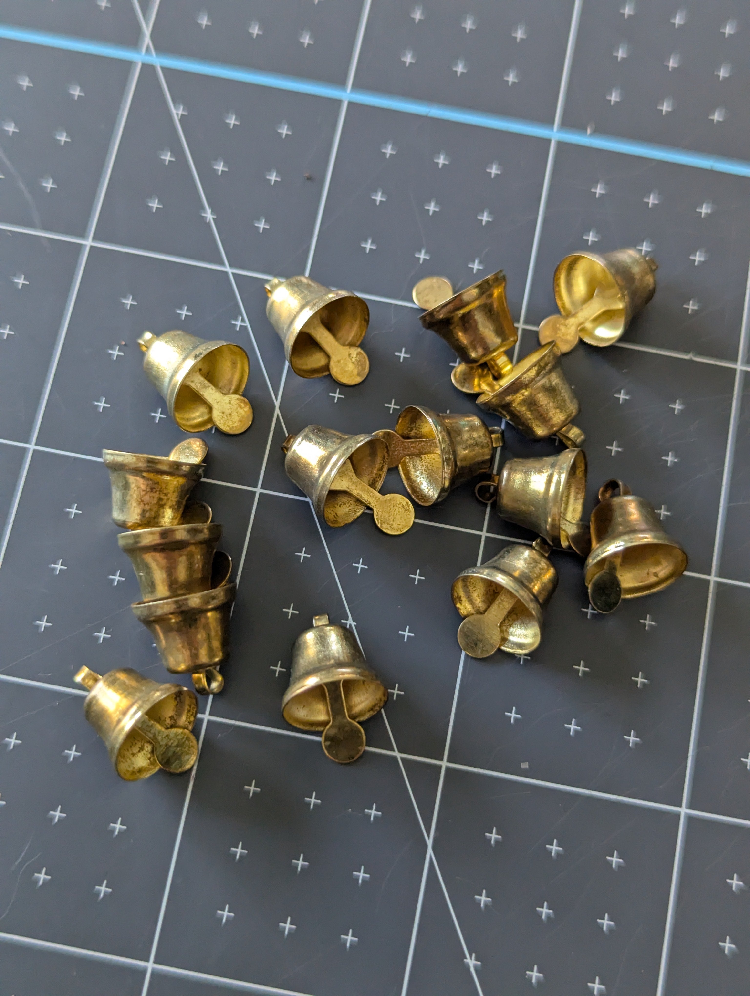 A small set of tiny bell charms. The hanging loop is also the little bell knocker. They make a soft ring sound once hung but not super noisy charms.